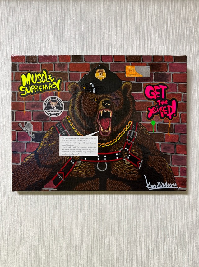 作成日:2025.12 サイズ:F6(41*31.8cm) 支持体:キャンバス 絵の具:アクリル、コラージュ(紙) ジェッソ下地:白ジェッソ3回(粒子M) ニス:リキテックス強つや出しニス3回(鏡面仕上げ) 作者:●Kuromaru ※この商品にはお手入れ用のハケが付きます ※キャンバス裏には紐をかける金具が付いており紐も付属します *** この絵を語るには私が同性愛者であると言うことを打ち明けなければなりません。 私たちはこの熊のようにずんぐりむっくりした人が大好きです。この毛深い感じもいいですね。アメリカのお巡りさんの帽子をかぶっているのは、ノンケの皆さんがミニスカポリスが好きなように、私たちもポリスがなぜか好きなんです。 今私たちの世界は体が大きいととてもモテるんです。 だから「Muscle Supremacy=ガチムチ至上主義」。 でも見た目だけではなく内面も重要だと言うことで、星の王子さまの原文をコラージュで貼り付けています。星の王子さまが言いたい事は「大切なものは、目に見えない」です。 *** ▼レビューを書くとステッカーがもらえます https://kuromaru.official.ec/items/107192974 ※カゴに入れる時に「レビューを書いてステッカーをもらう」を選択してください。「商品発送完了メール」の下部にあるリンクから執筆できます(匿名可)。 ▼お問い合わせ https://thebase.com/inquiry/kuromaru-official-ec
