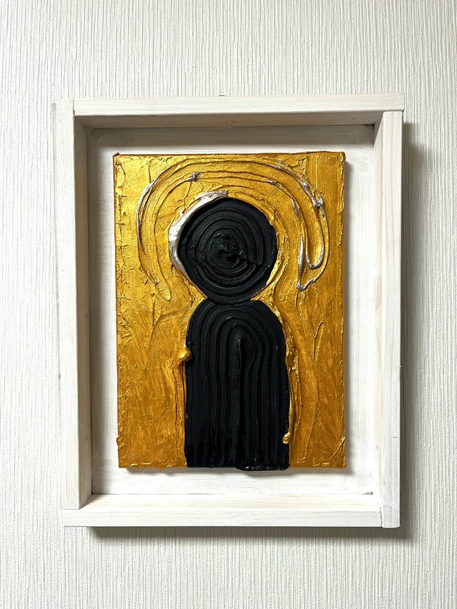 作成日:2025.7.6 サイズ:F4(33.3*24.2*1.6cm)+額装サイズ 支持体:キャンバス、モデリングペースト ジェッソ:白3回 絵の具:アクリル、黄金ジェッソ、銀 ニス:リキテックス強つや出しニス3回(鏡面仕上げ) 額装:くろまる手作り額装・ホワイトウッドをアクリルスプレーで白色に塗装(額装と絵画はタッカーで固定されています。アクリル板は御座いません。絵画は露出しています。額装は汚れ、タッカーミス、穴あけミス、補助線などそのままですが味として受け取っていただければ幸いです。) 作者:●Kuromaru ※この商品には額とお掃除用のハケが付属します *** 私がインド・ブッダガヤで見た仏陀の巨像。 10人弟子がいる巨像を通り抜け、その先にいたのが仏陀の巨像。時間はちょうど12時過ぎ。もっとも太陽が高い位置にあった。巨像は完全に逆光となり真上から照らす太陽光がまさに後光に見えた。その漆黒の黒の奥にうっすらと見える素顔は正直怖かった。 額装は木材で作られ、白色に塗装しさらに渋い雰囲気を作る事に成功しました。背面には既に吊り下げ器具を装着しているので、かける所を作るだけで飾れます。 *** ▼500円で未来の子供達を精神障害から守ります https://kuromaru.official.ec/items/103747735 ▼レビューを書くとステッカーがもらえます https://kuromaru.official.ec/items/107192974 ※カゴに入れる時に「レビューを書いてステッカーをもらう」を選択してください。「商品発送完了メール」の下部にあるリンクから執筆できます(匿名可)。 ▼お問い合わせ https://thebase.com/inquiry/kuromaru-official-ec