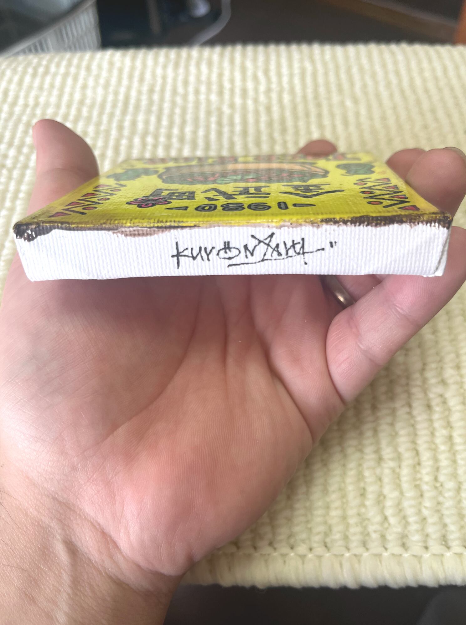 ※絵の具にアクリルとポスカを併用しました。一定の色と色との間でひび割れが起きました。ニスで固定しましたので、絵の具の脱着の心配はいりません。ひび割れは自然な造形で、それでいて美しく感じる事ができます。ご納得の上でご購入をお願いできればと思います。