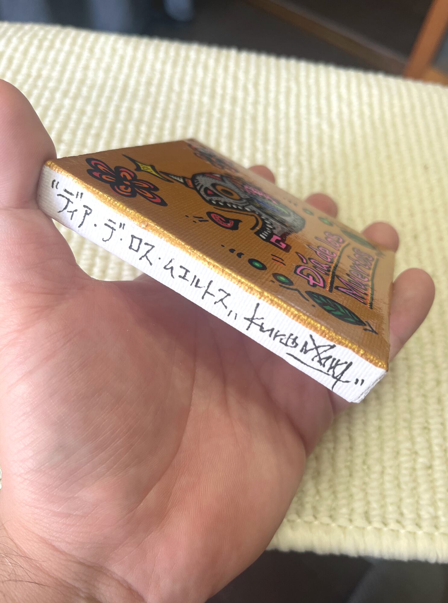 ※絵の具にアクリルとポスカを併用しました。一定の色と色との間でひび割れが起きました。ニスで固定しましたので、絵の具の脱着の心配はいりません。ひび割れは自然な造形で、それでいて美しく感じる事ができます。ご納得の上でご購入をお願いできればと思います。