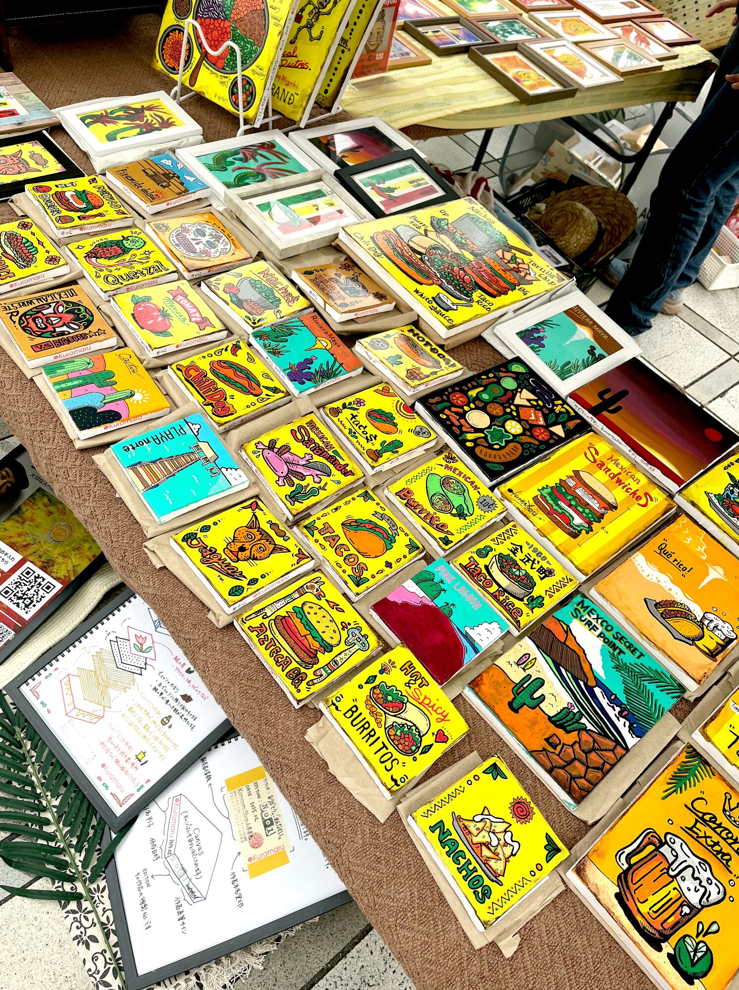 第3回目の絵画露店商のテーマは「くらげ」「太陽」「ヤシ」「海」「サボテン」そして毎度お馴染み「メキシコ系」を販売いたします。「あべみゆき」はまた違った路線で、モダンアートや抽象画など、彼女特有な優しさと愛情に溢れたバラエティー豊かな画風で攻めてきます。