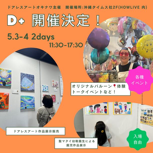ドアレスアートオキナワ主催、定期展示販売会イベントD+(ディープラス)今年は初めての2日間開催が決定!昨年もドアレスな展示販売会とし、年齢も関係ない。とのコンセプトを引継ぎ、聖マタイ幼稚園の園児等の作品も同時展示されます!