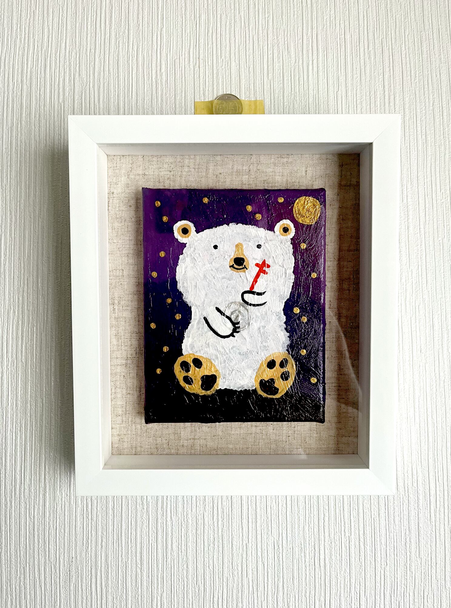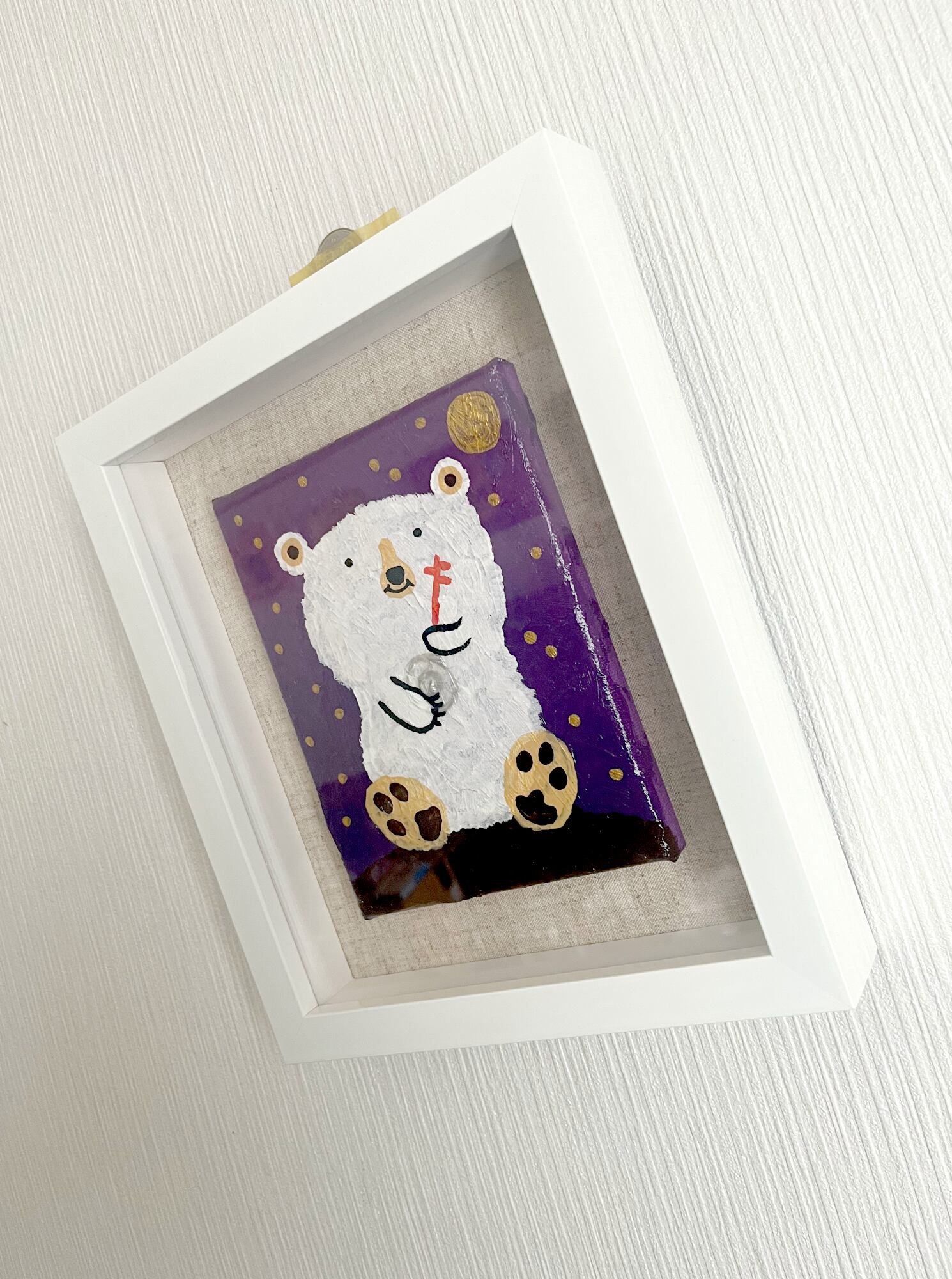 絵画:ワンランク上の下地盛り上げ材を使用した、カンカラ三線ルナティックくま・額装付き:Kankara Sanshin Lunatic Bear