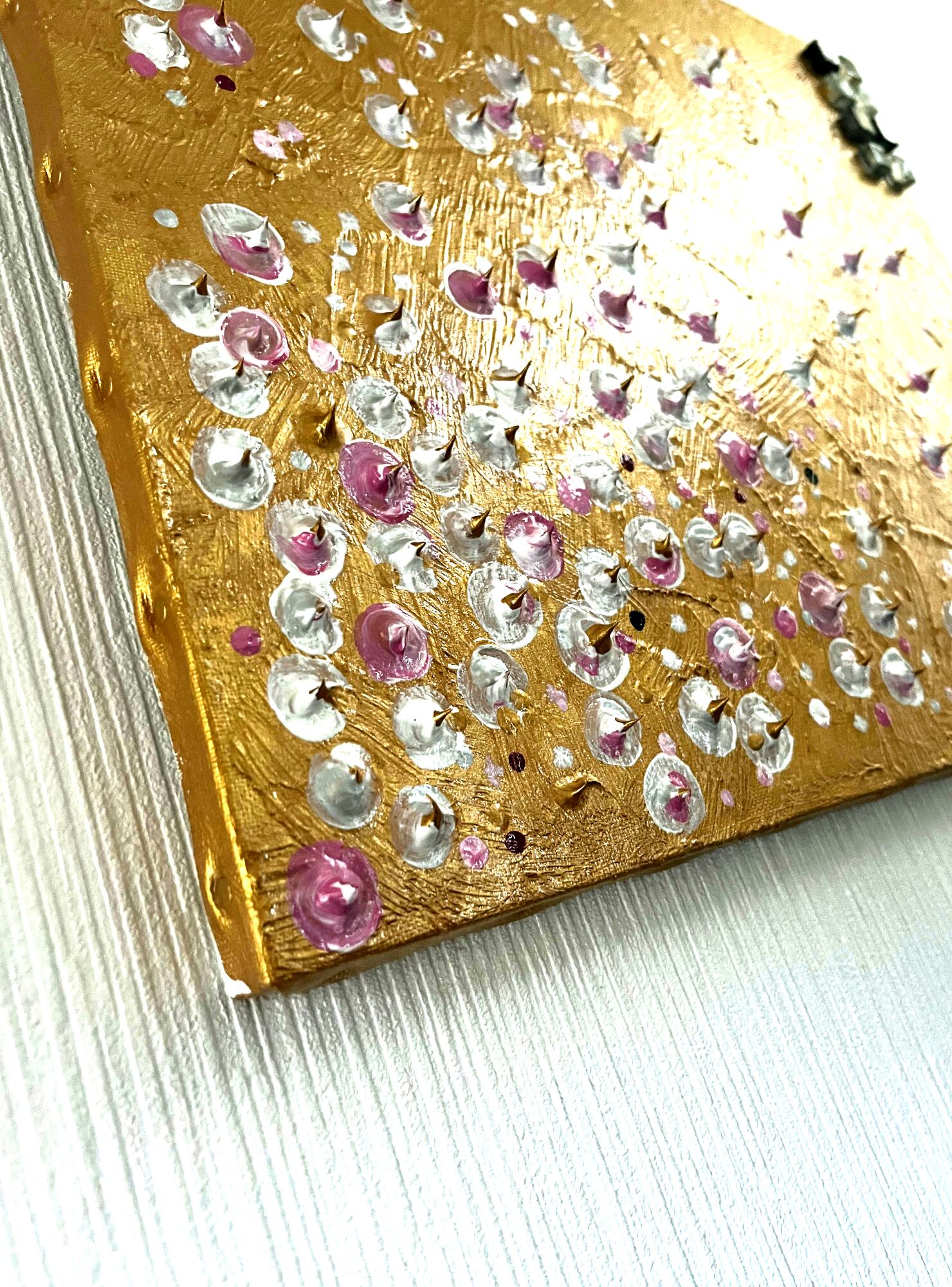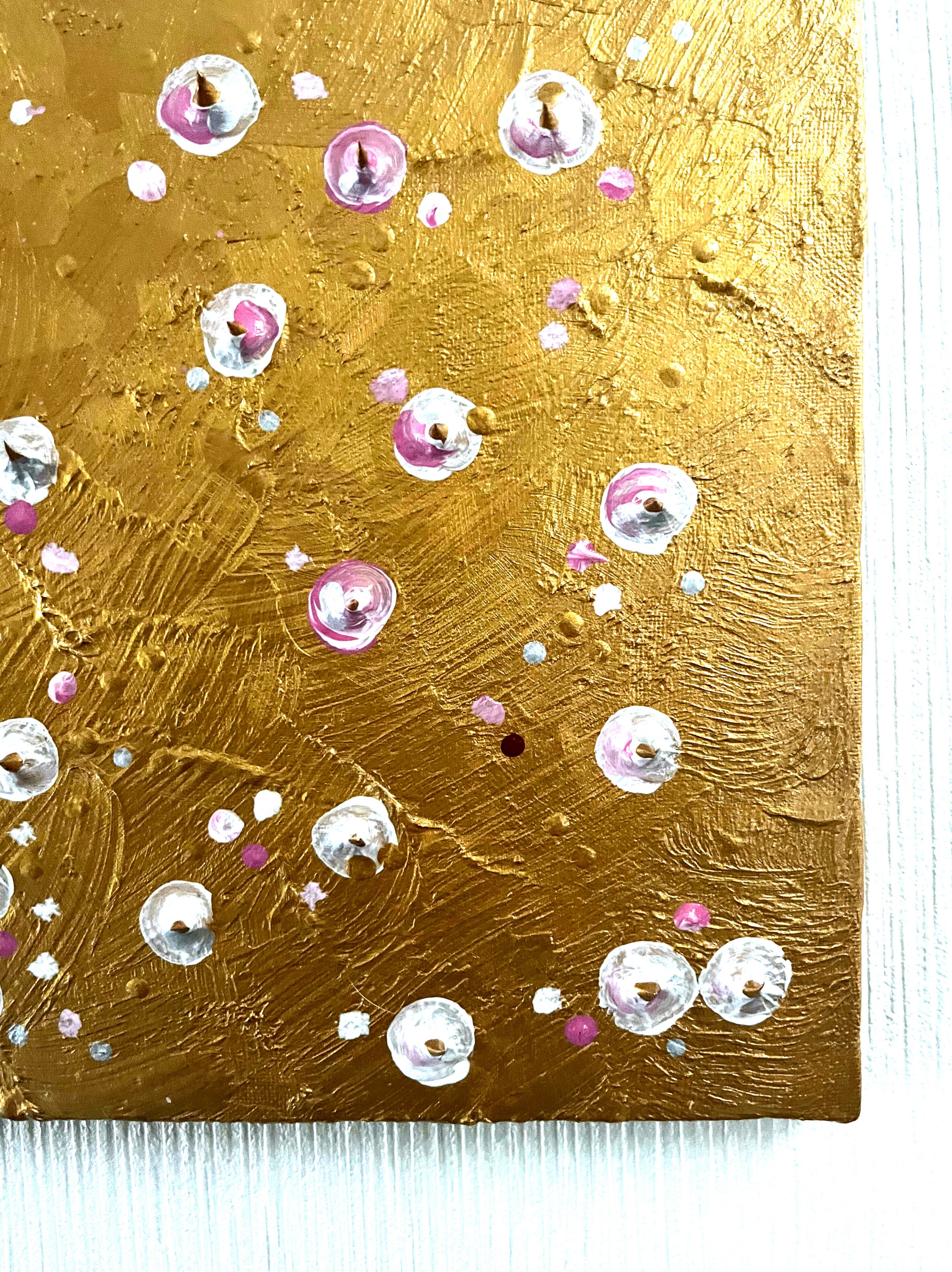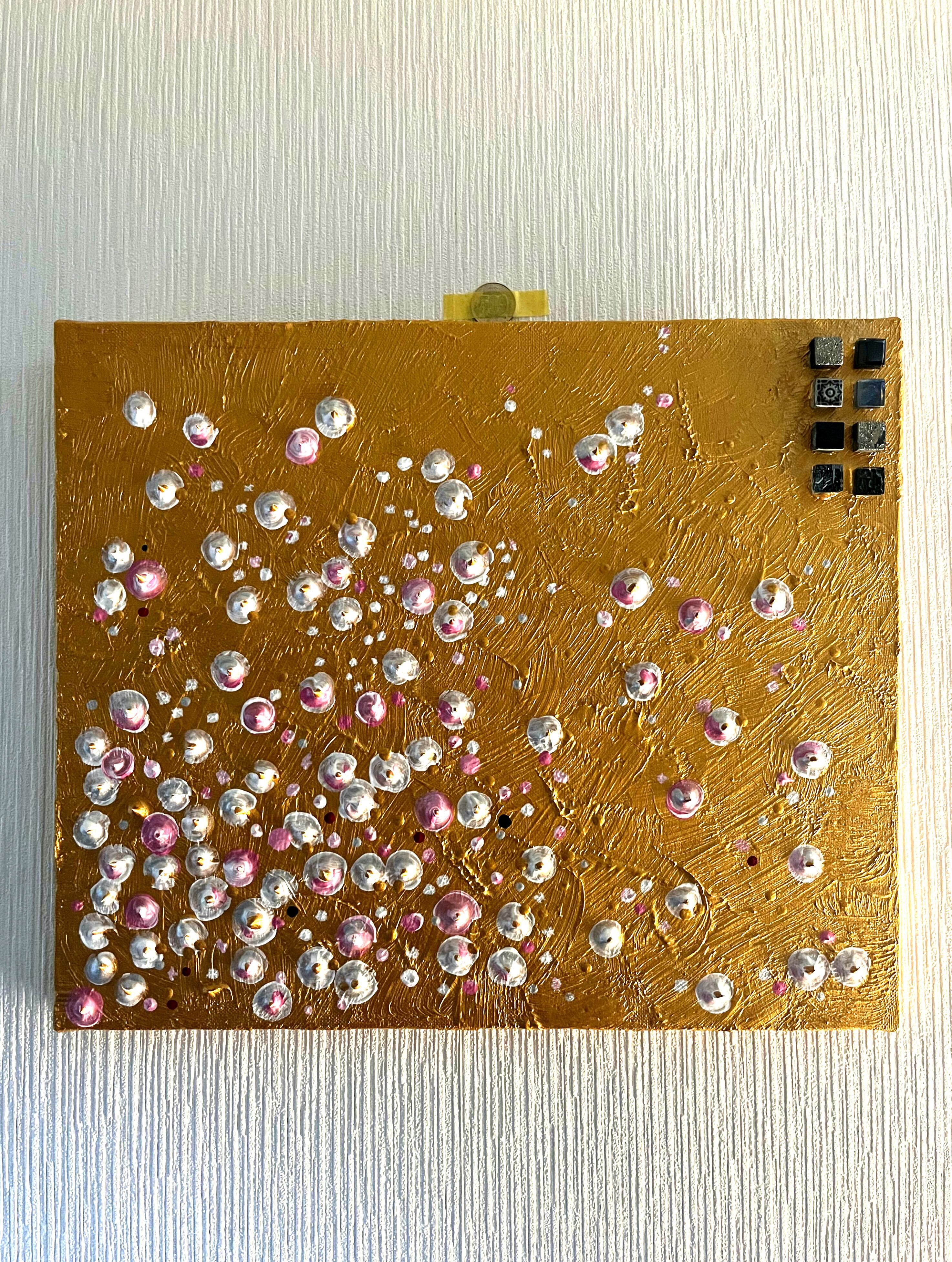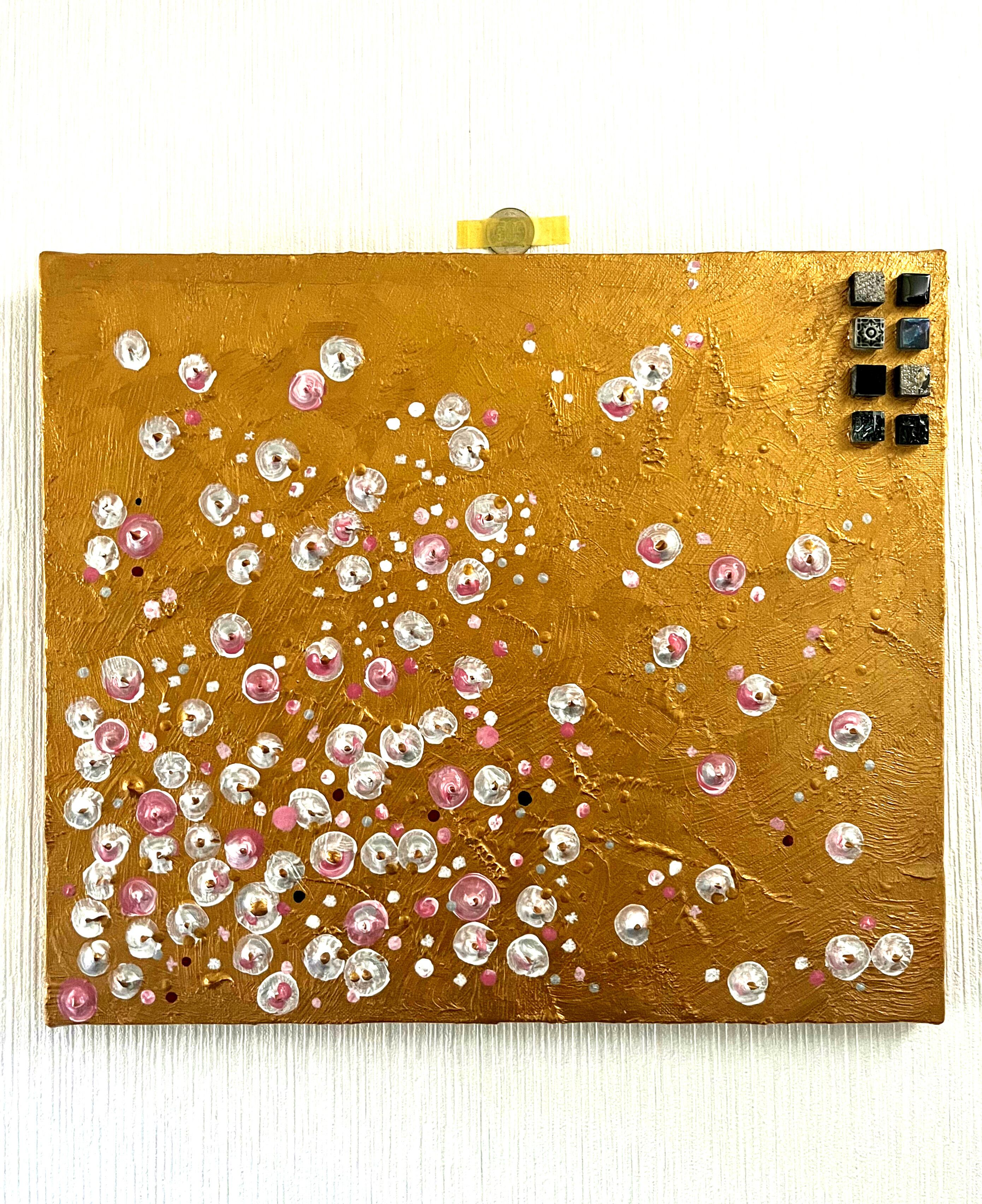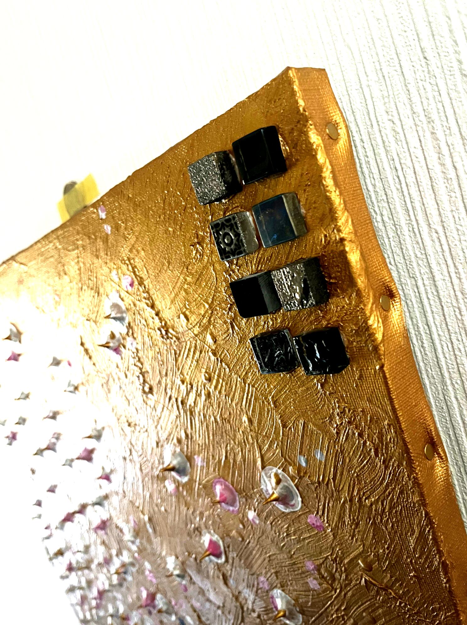 CB=(cherry blossom)の意味で、桜坂に因んで付けられたそう。今回は桜自体にモデリングペーストで隆起させ、豪快に黄金ジェッソを全面に引きました。右上にある黒い物は、沖縄で縁起のいい数字「8」に因んで、8つの異なった黒ストーンを並べています。「夜のお店」と言うことで、間接照明を当てると隆起した桜に陰影が付き「夜桜」を楽しめる仕様です。