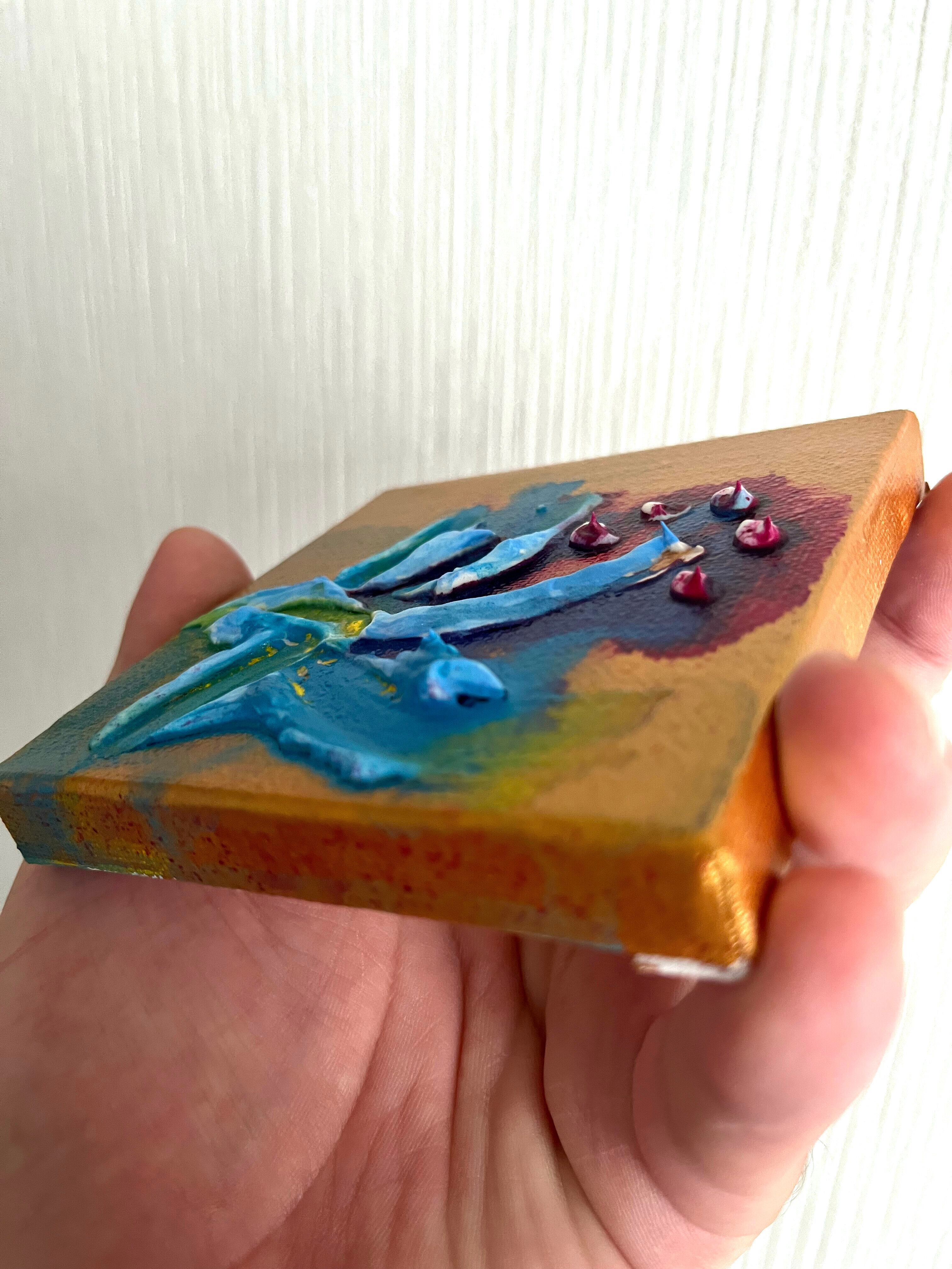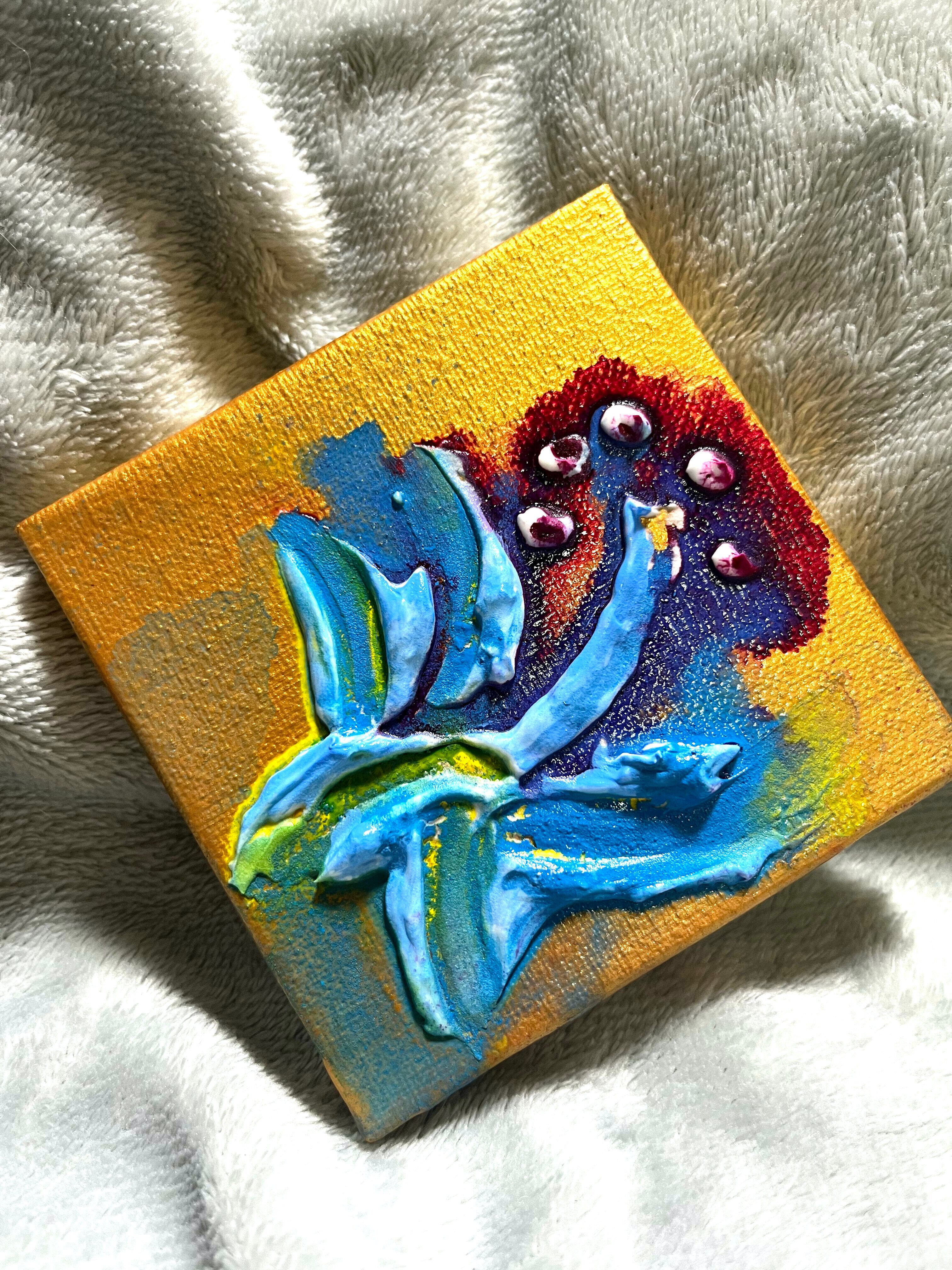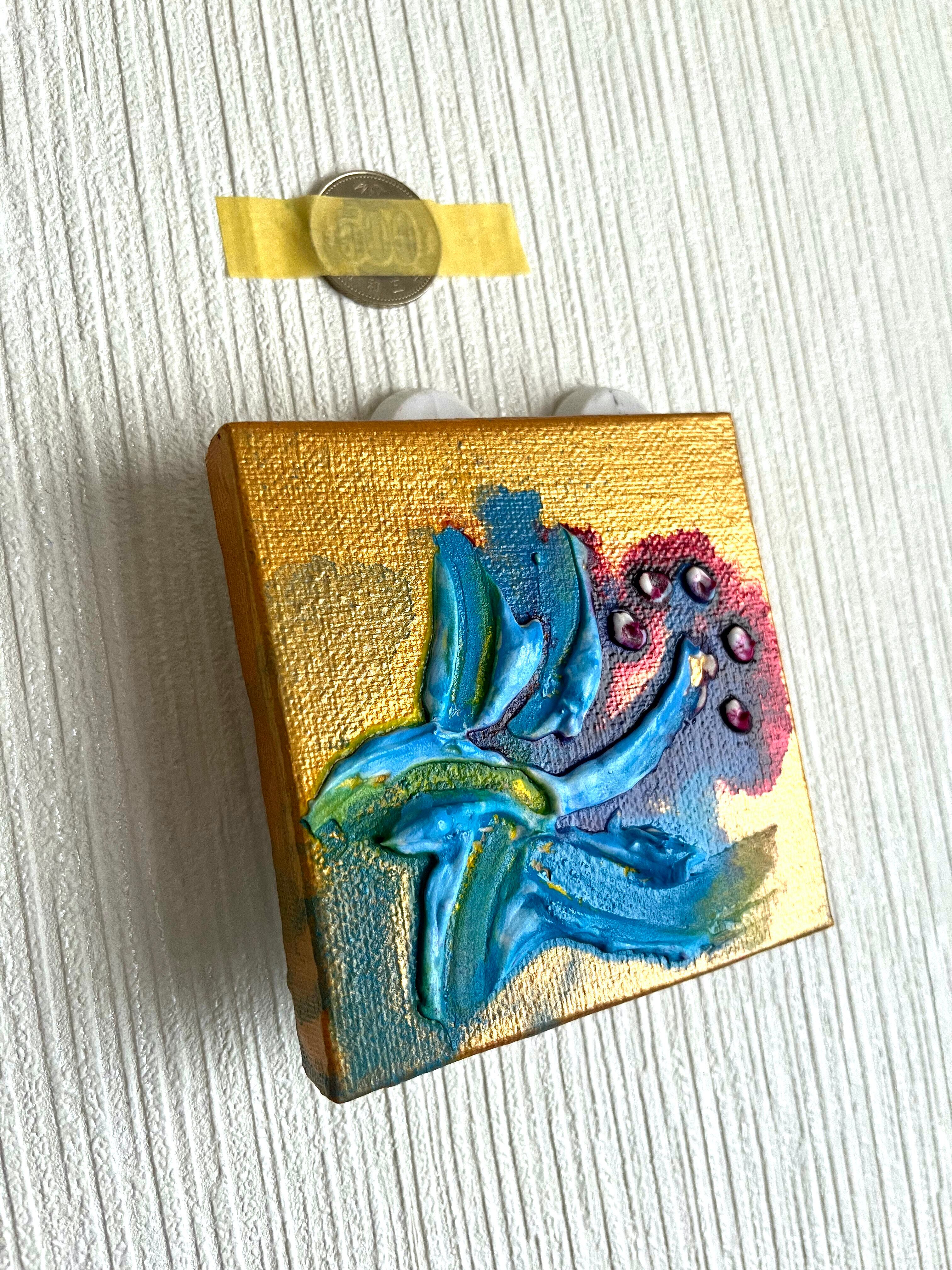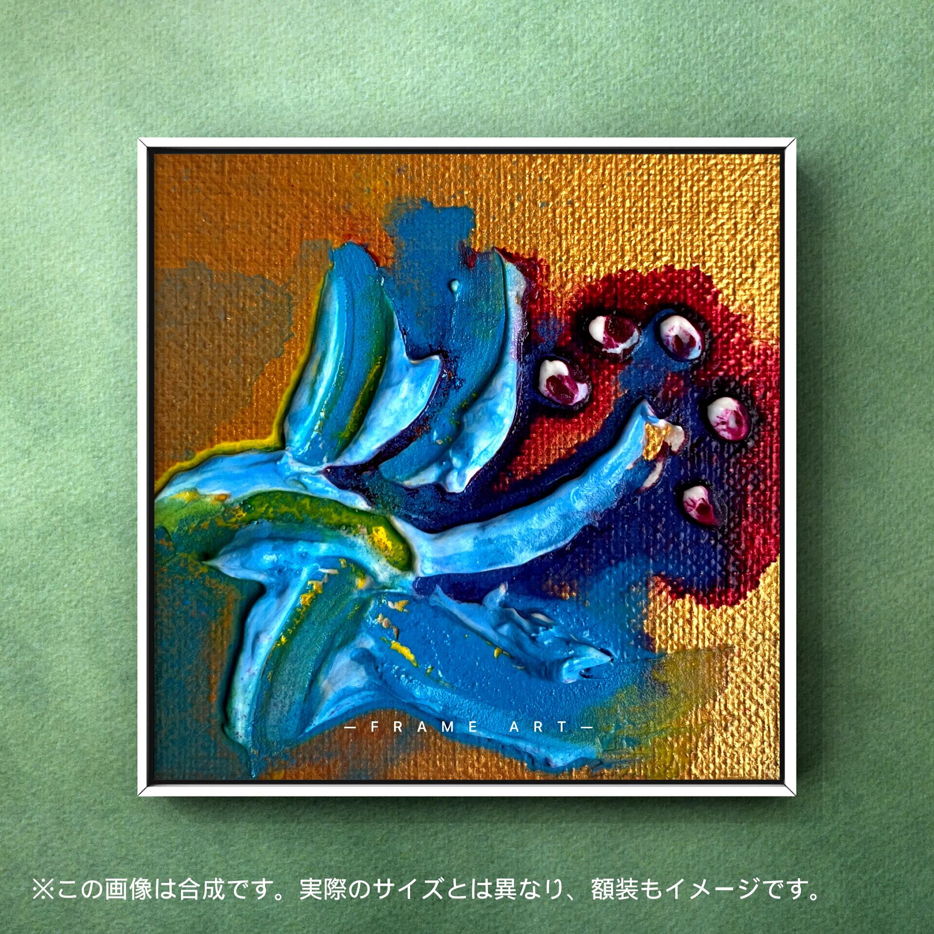 色と色の偶然なる混ざり合いや、モデリングペーストが残ったままとなっている白がまた味になります。さらに金のジェッソが下地にあるため、輝かしい光を放った元気が出るお花です。ぜひご家庭に一輪咲かせませんか。
