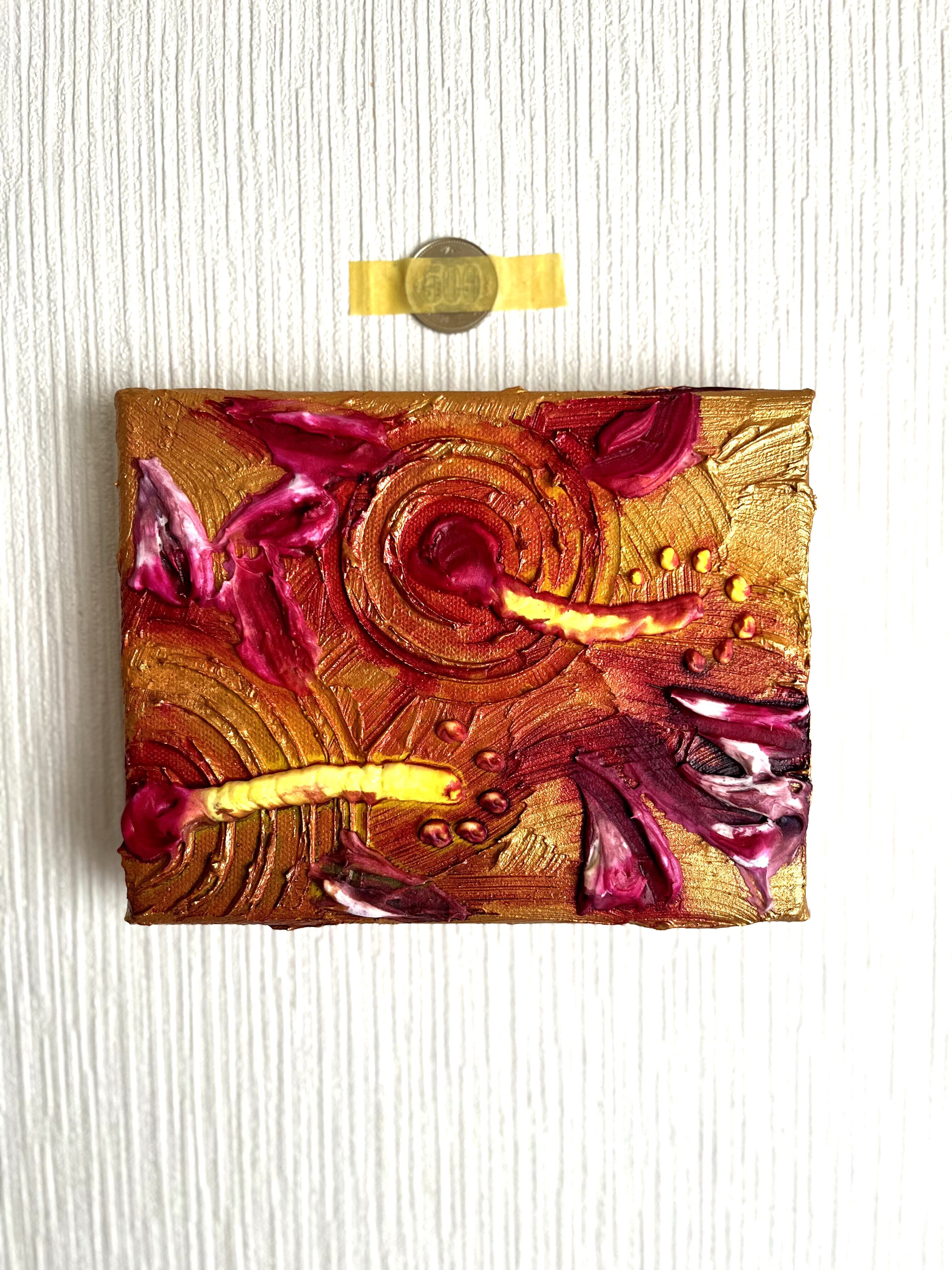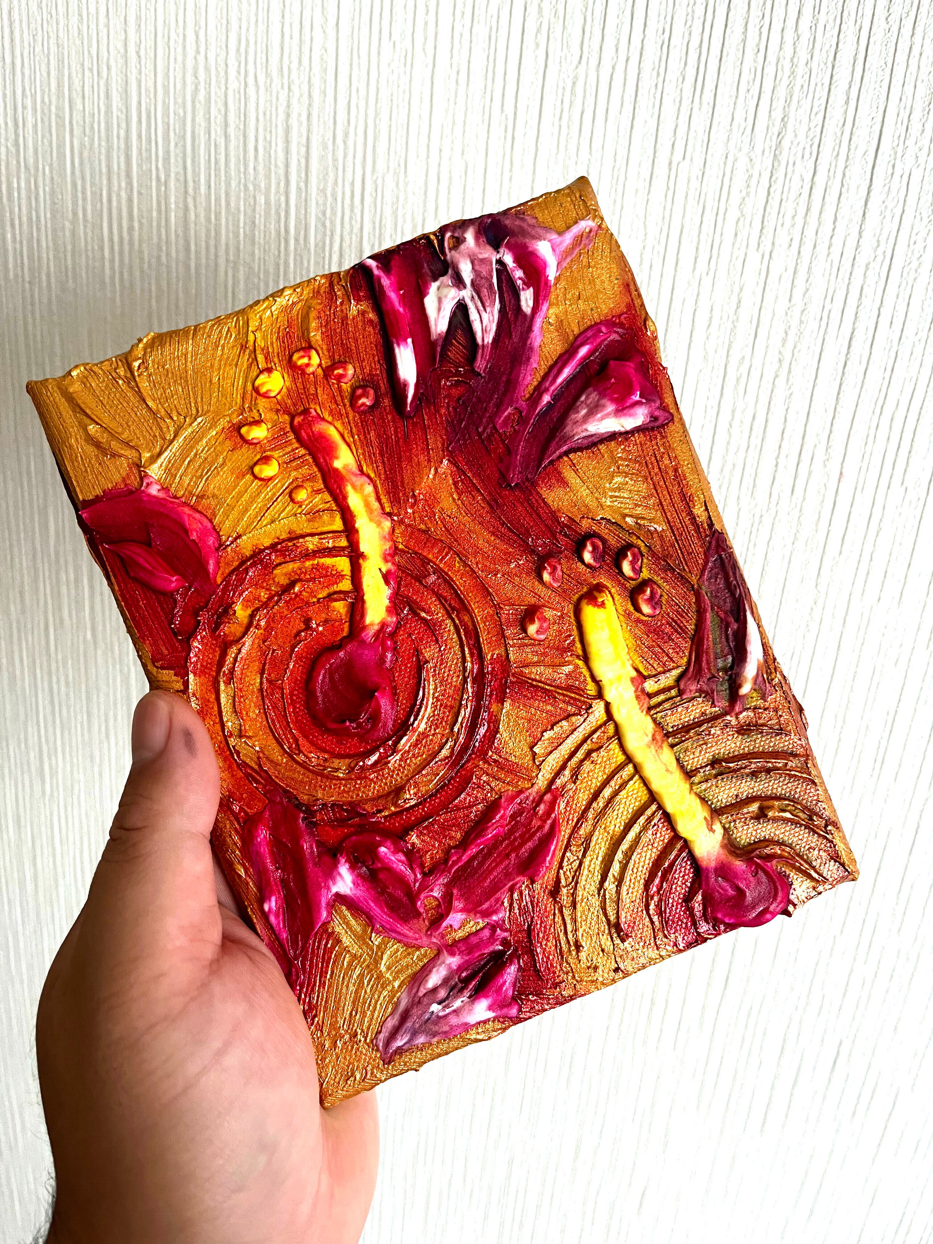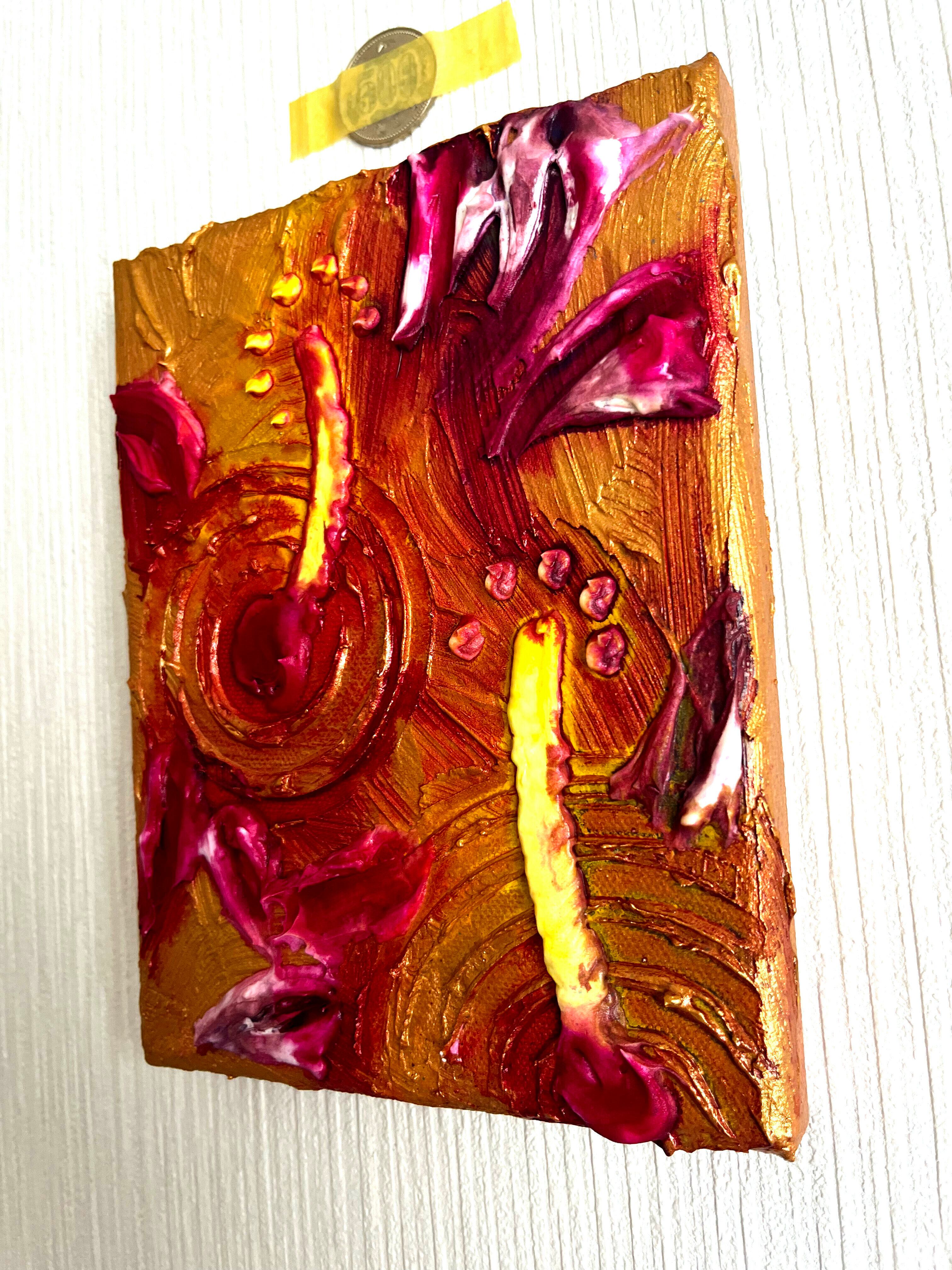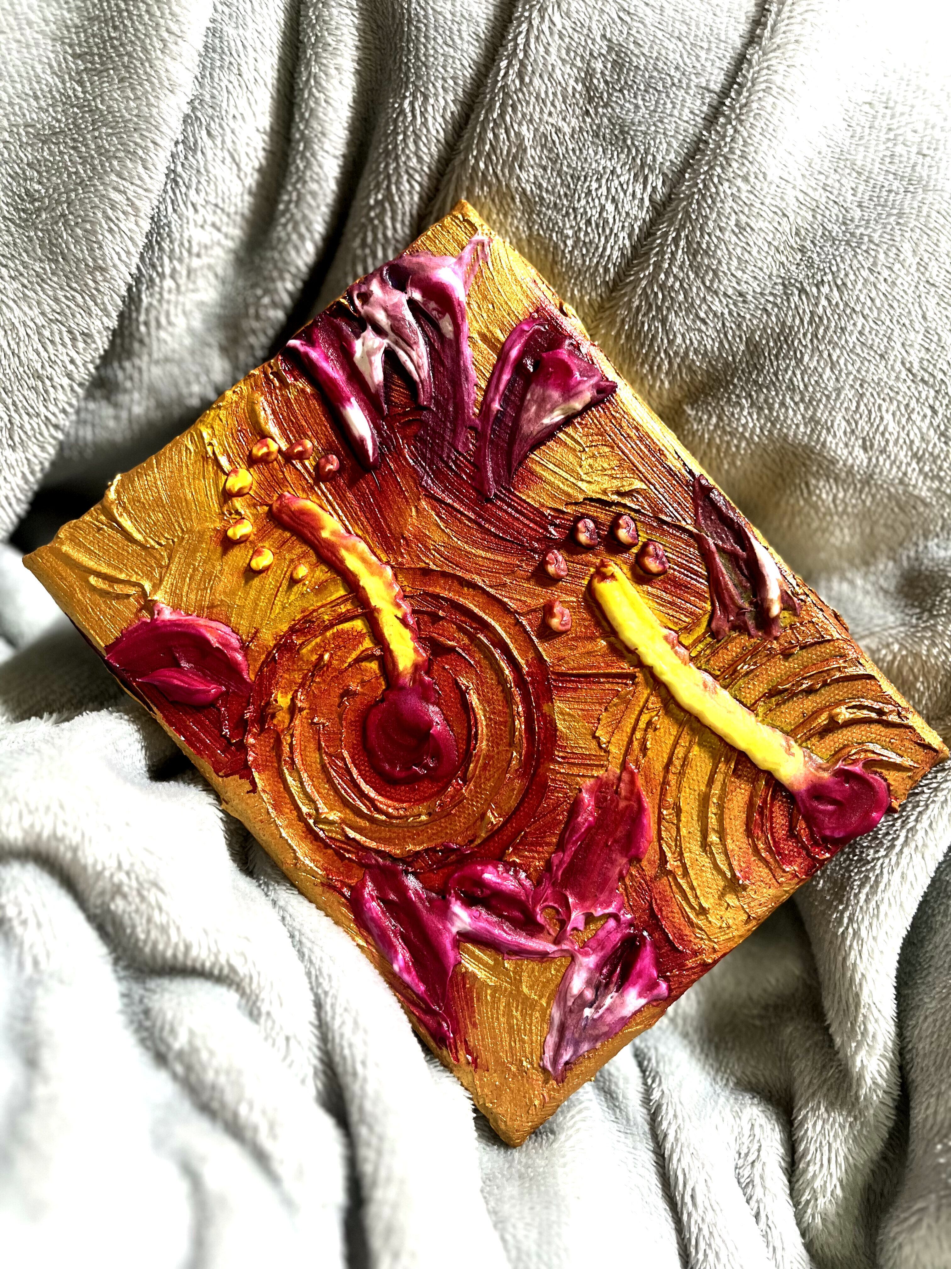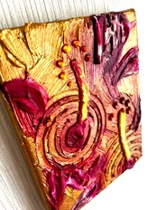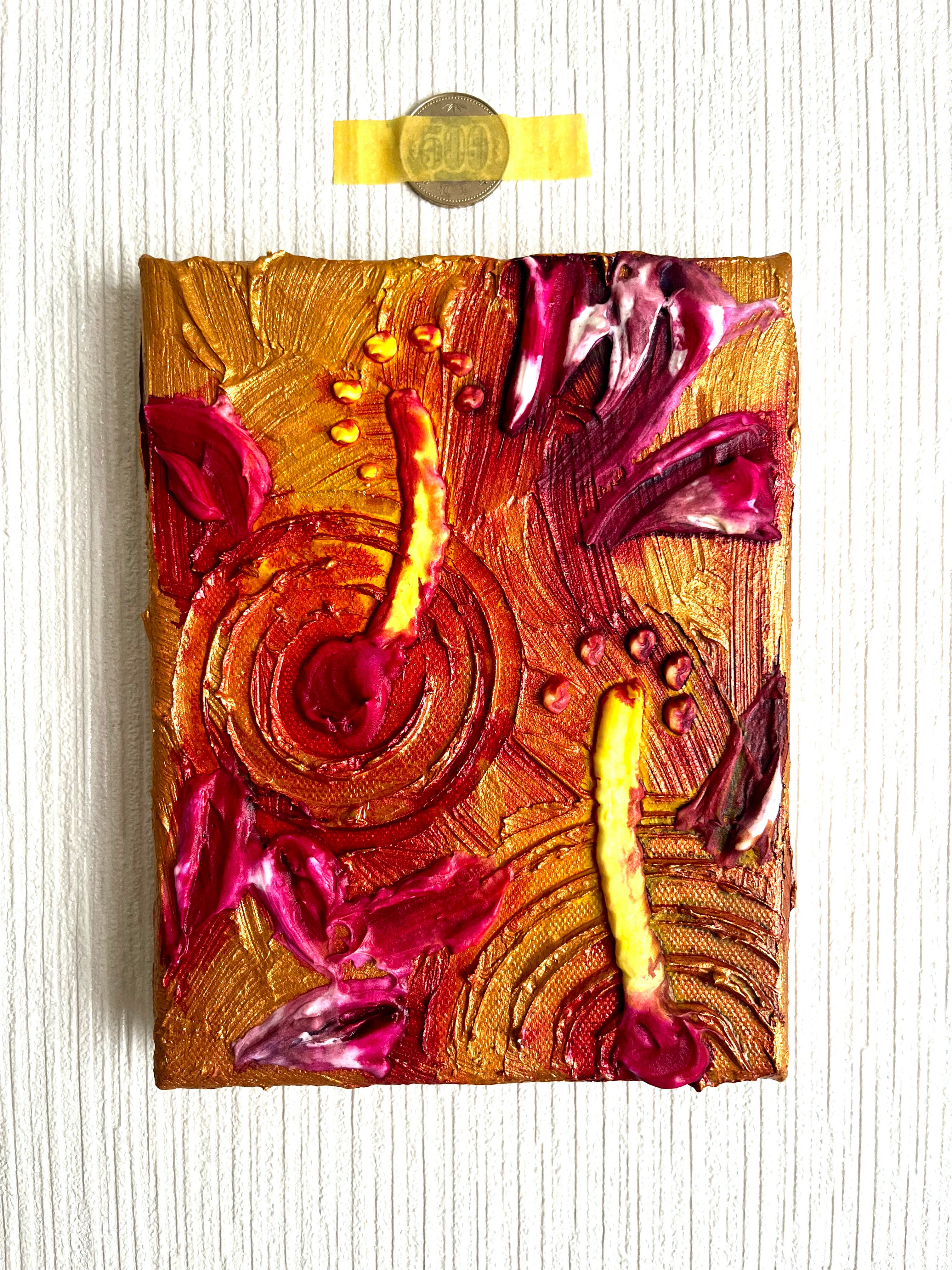 沖縄で強い日差しの中に咲くハイビスカスをイメージして作りました。黄金ジェッソとマゼンタがうまく混ざりあり、光り輝く太陽の反射を疑似体験する事ができます。ぜひ、このエネルギーをご家庭にも。