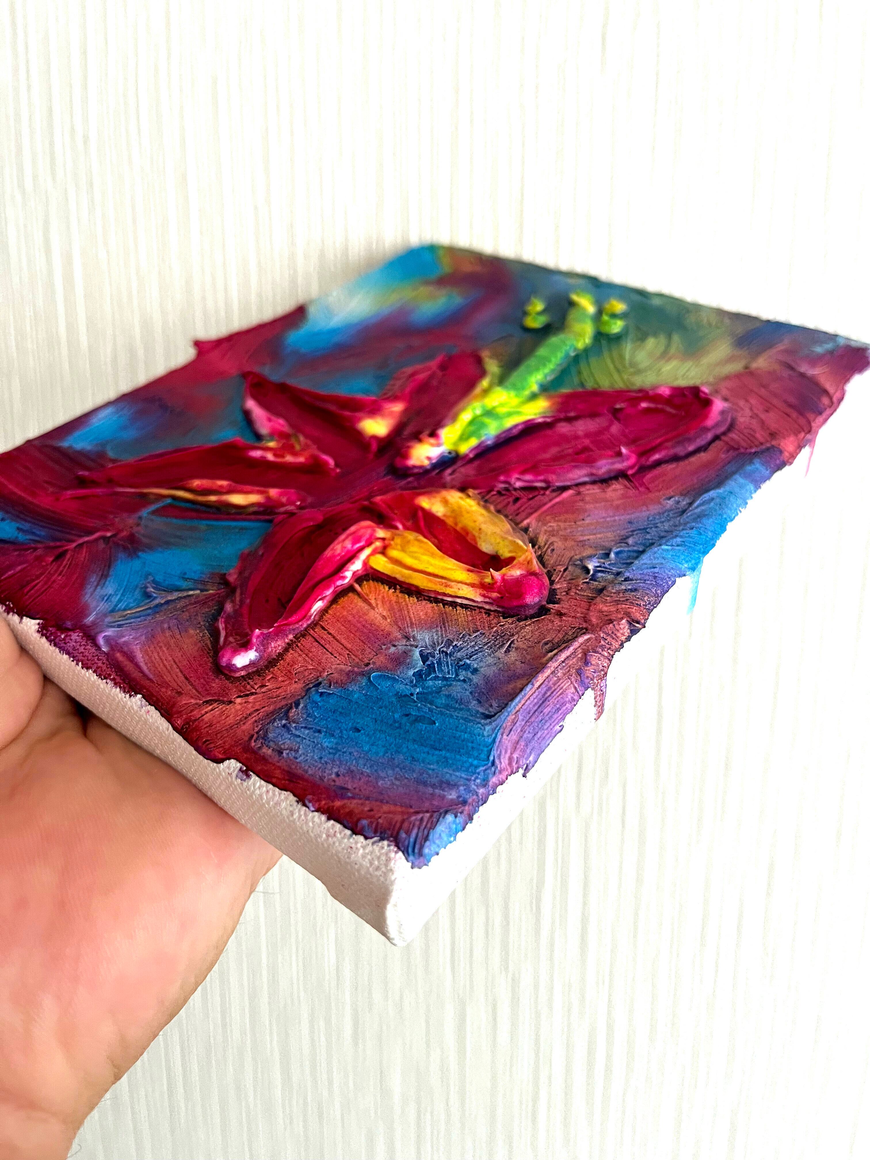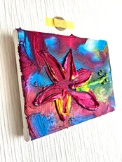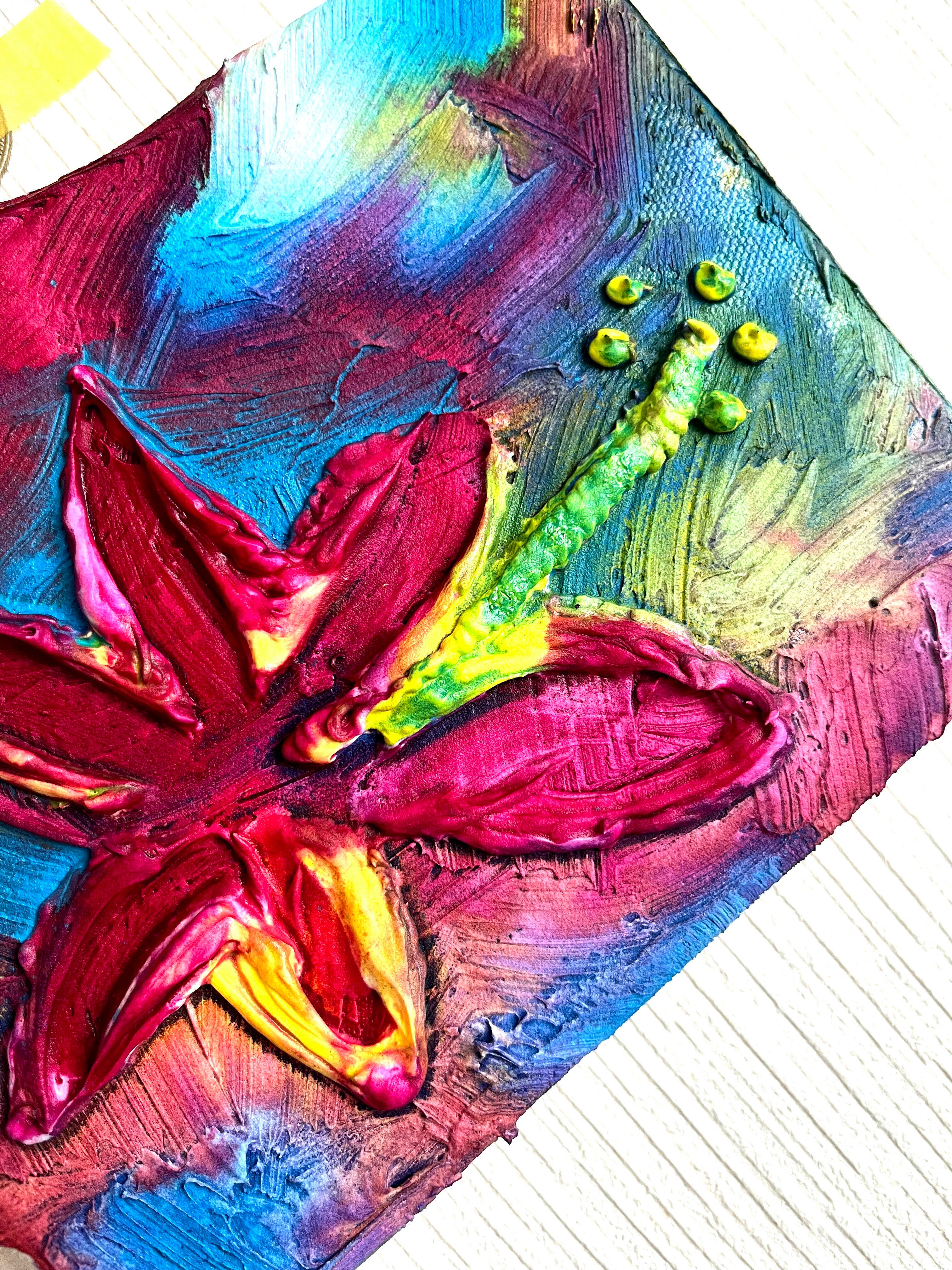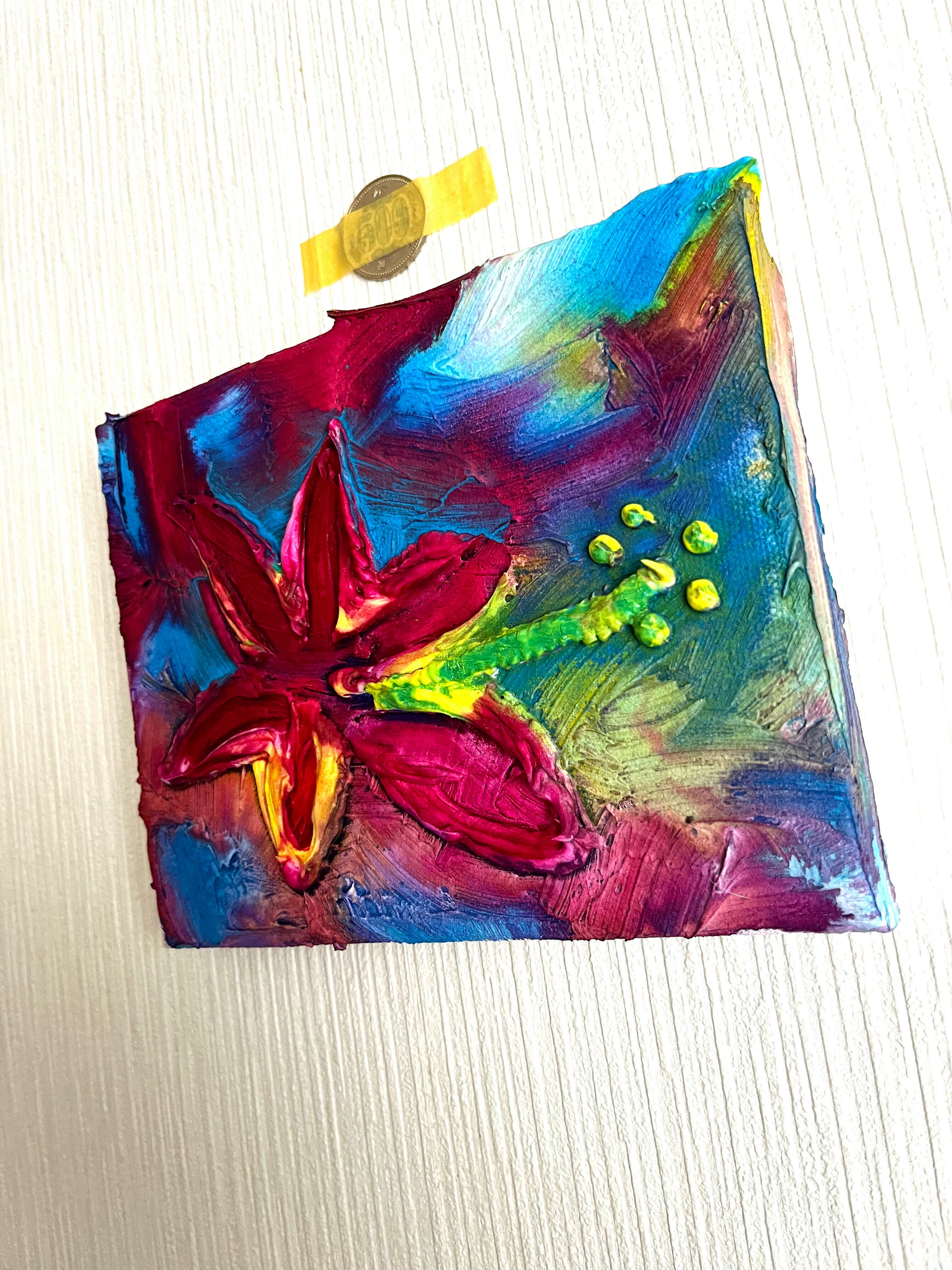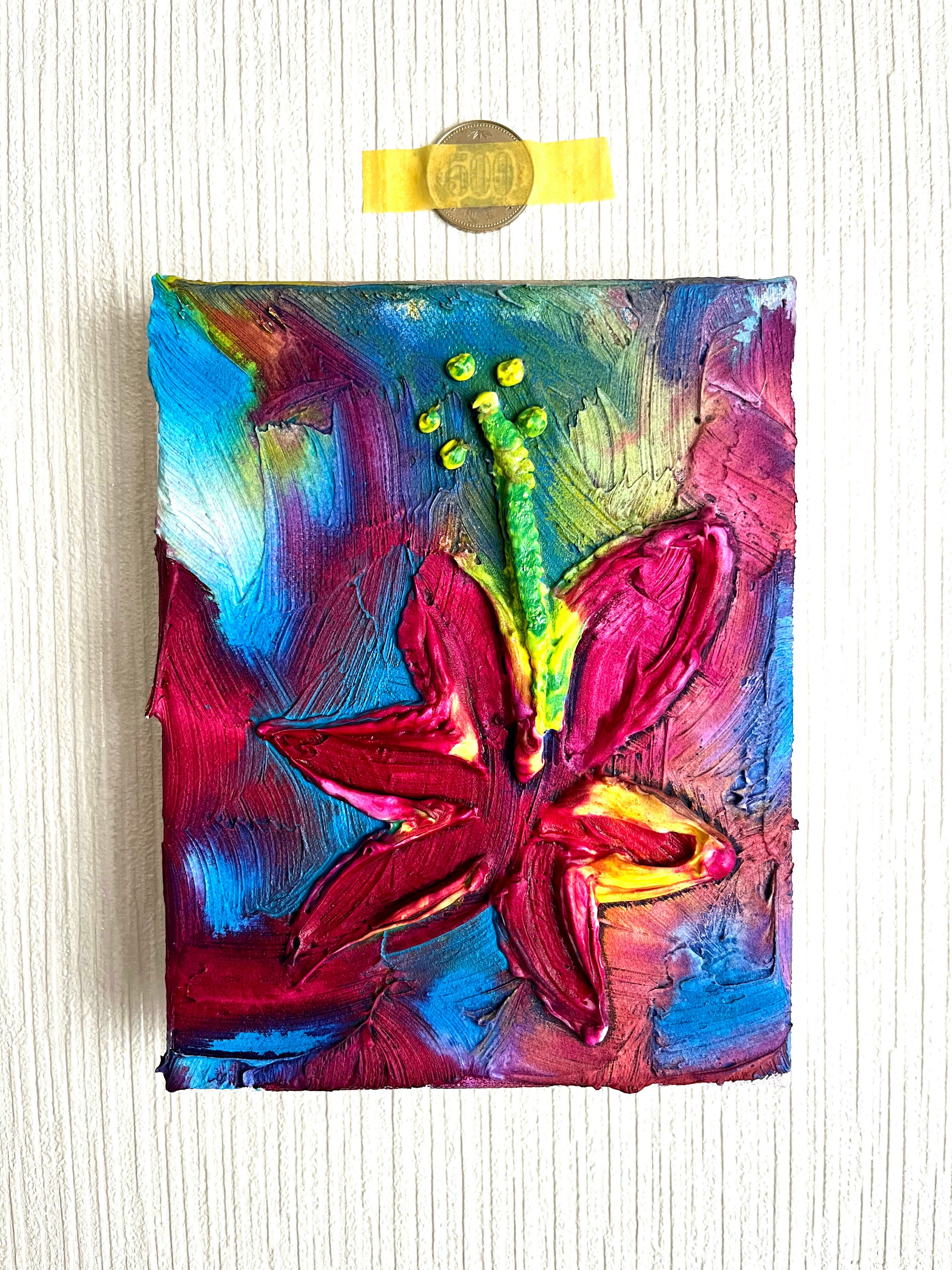 アクリルリキッドの色の三原色、シアン・マゼンタ・イエローをふんだんに使い、トロピカル感を目指しました。偶然に折り重なった色とりどりの偶然をお楽しみください。
