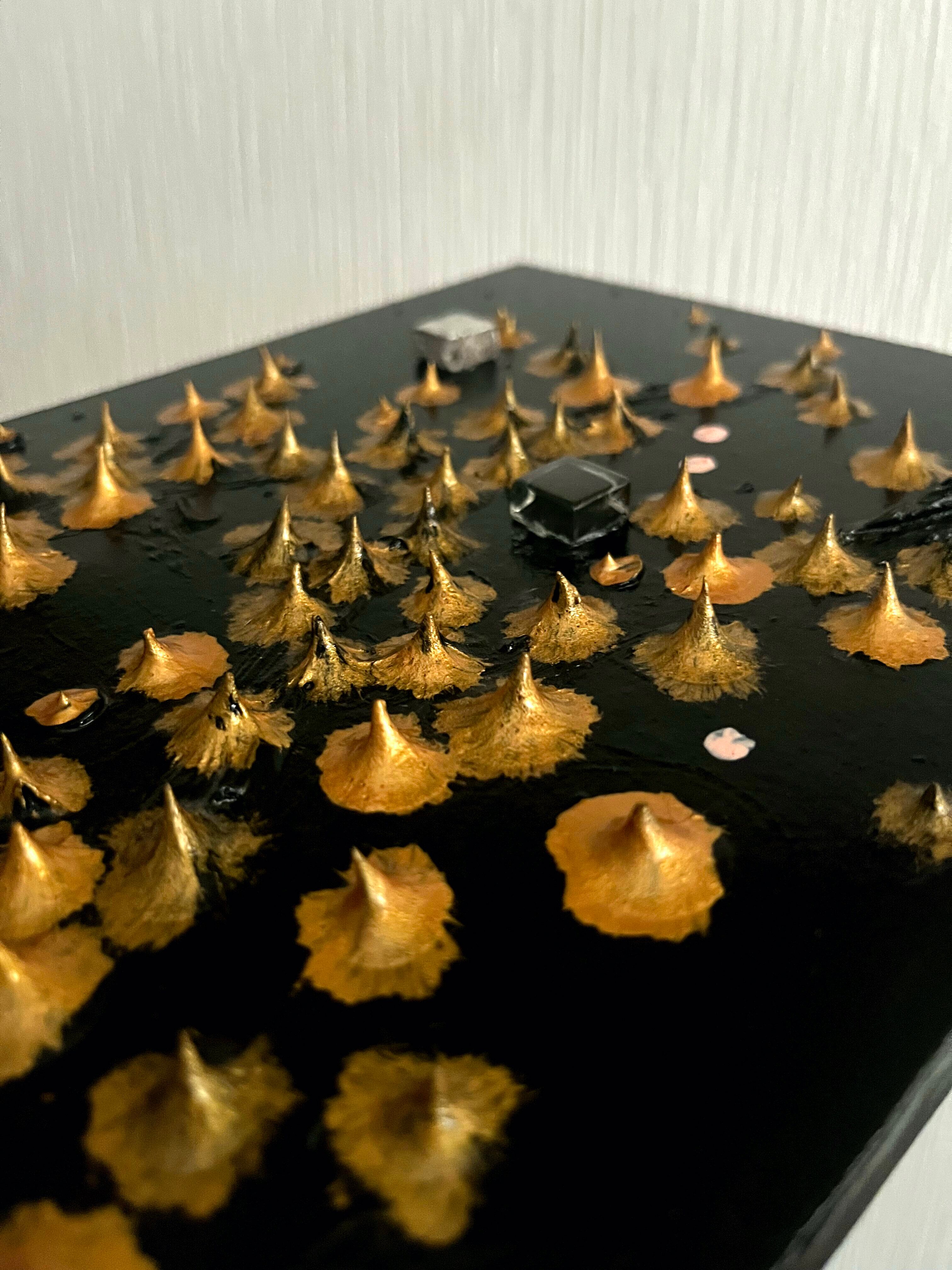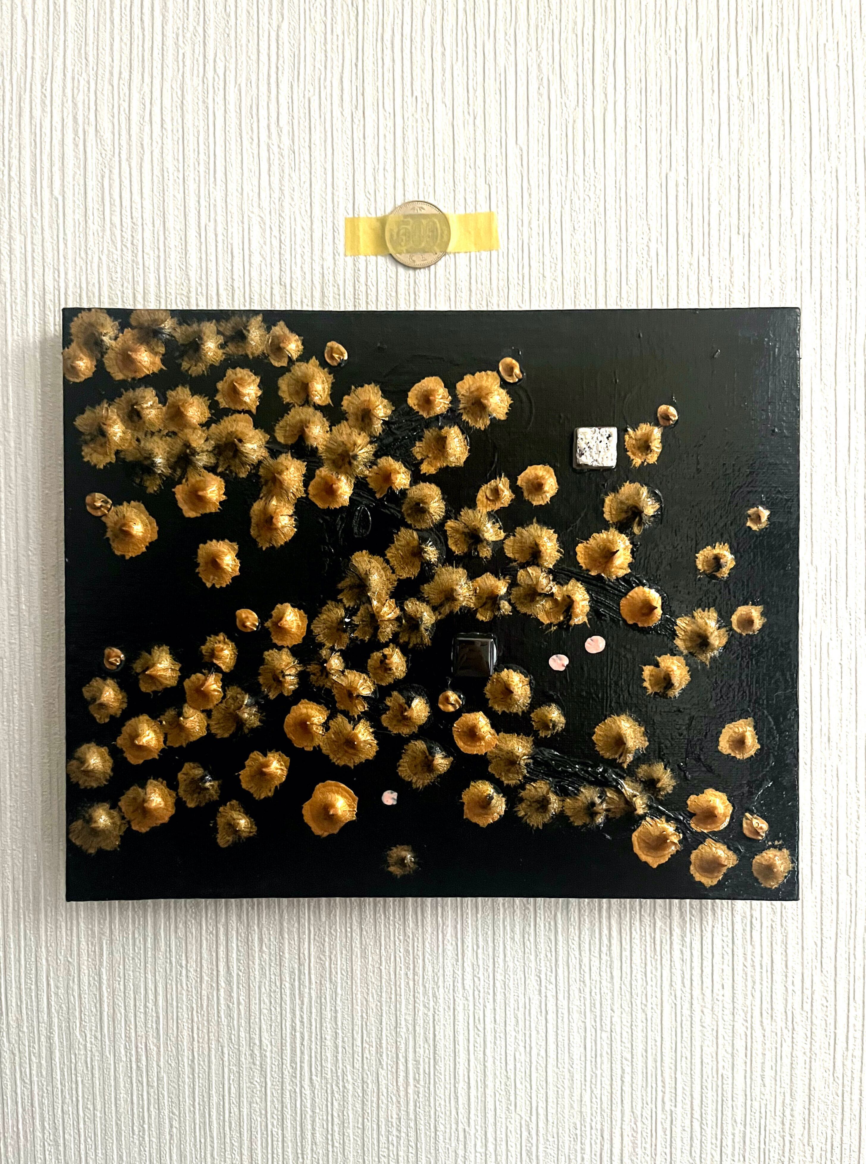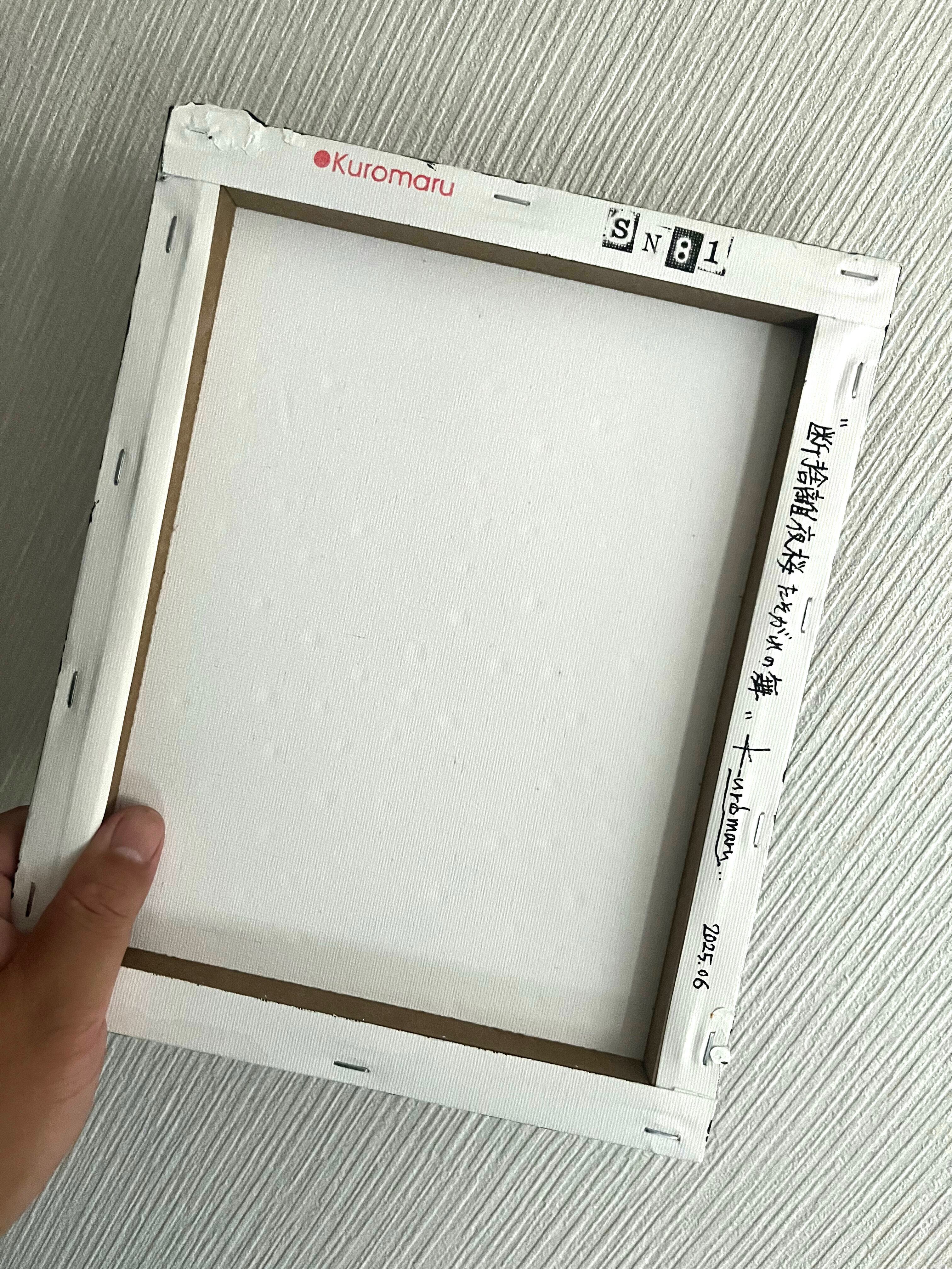 夜桜シリーズに設置しているストーンの数は全て偶数(2,4,6)。これは「割れる」を意味し、執着から解放するための「念」を絵画に込めています。昼の桜とは表裏一体の存在です。