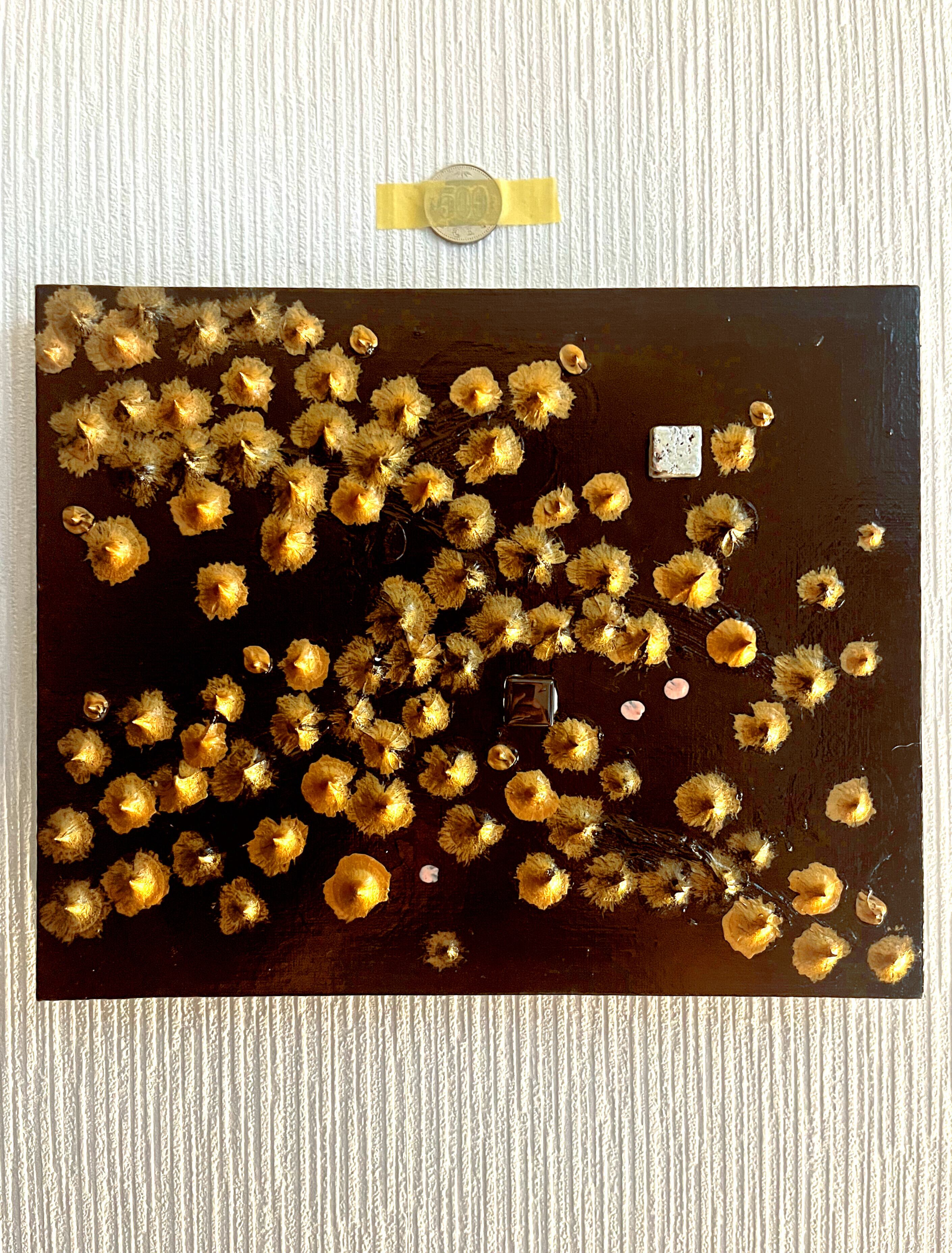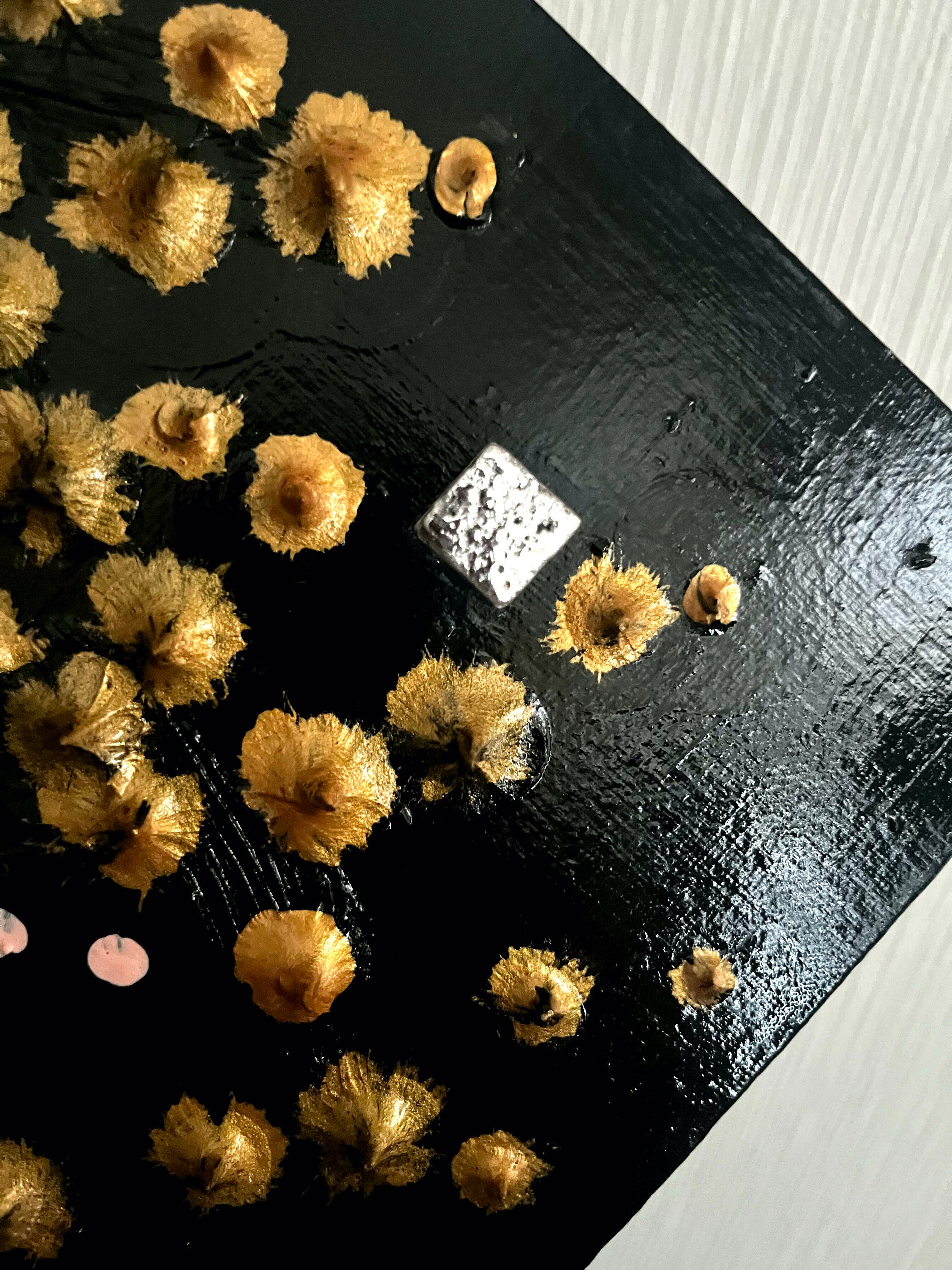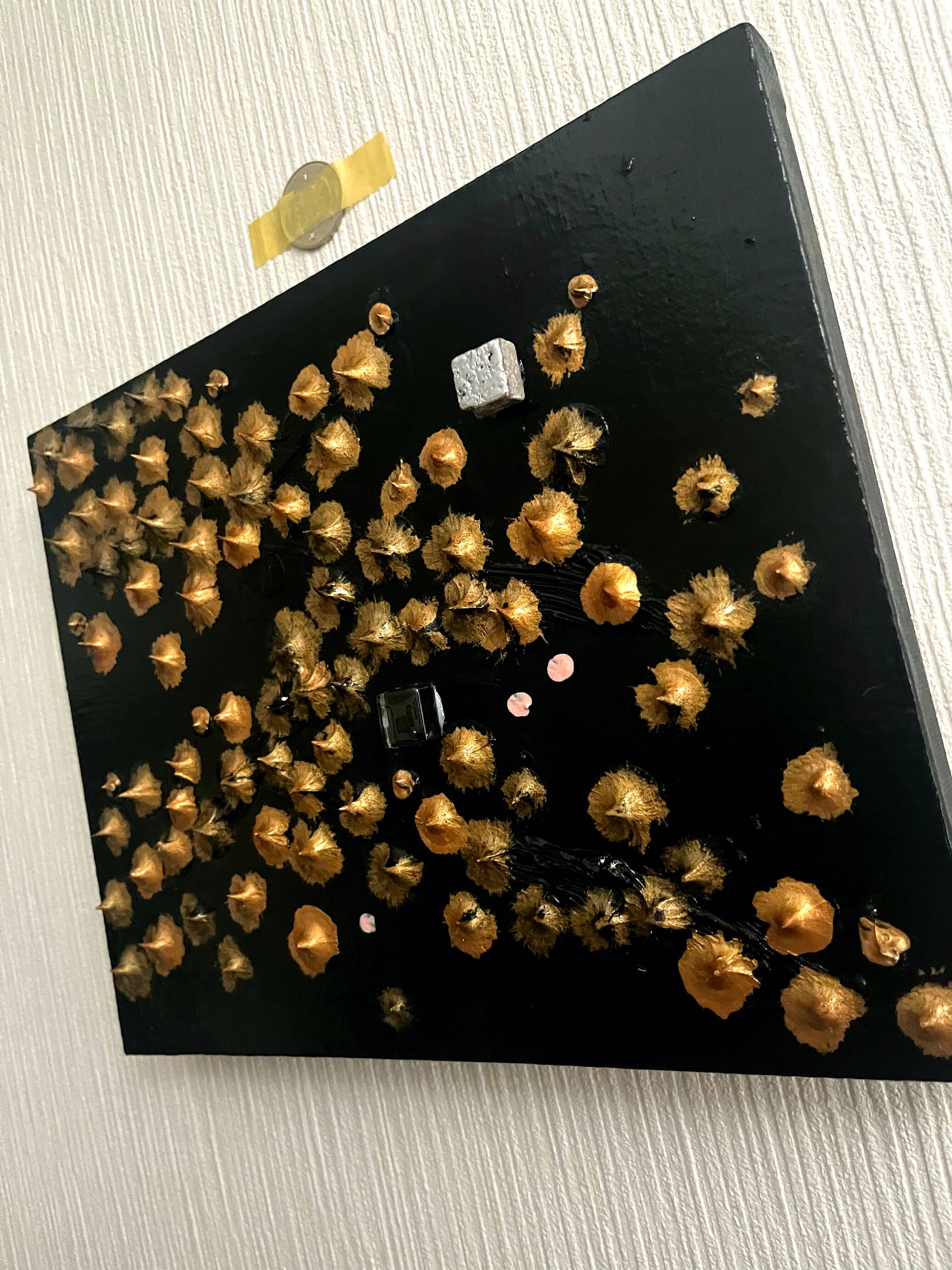夜桜シリーズに設置しているストーンの数は全て偶数(2,4,6)。これは「割れる」を意味し、執着から解放するための「念」を絵画に込めています。昼の桜とは表裏一体の存在です。