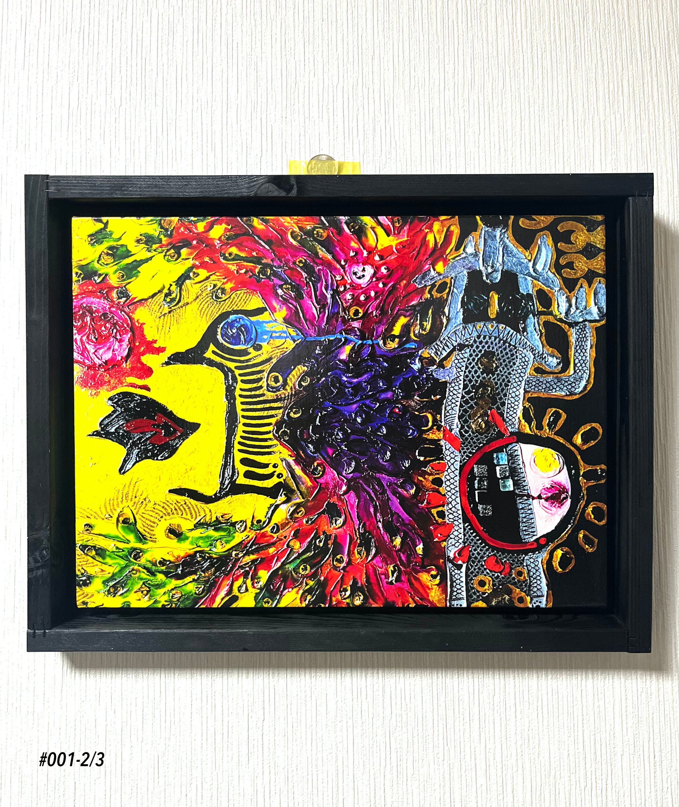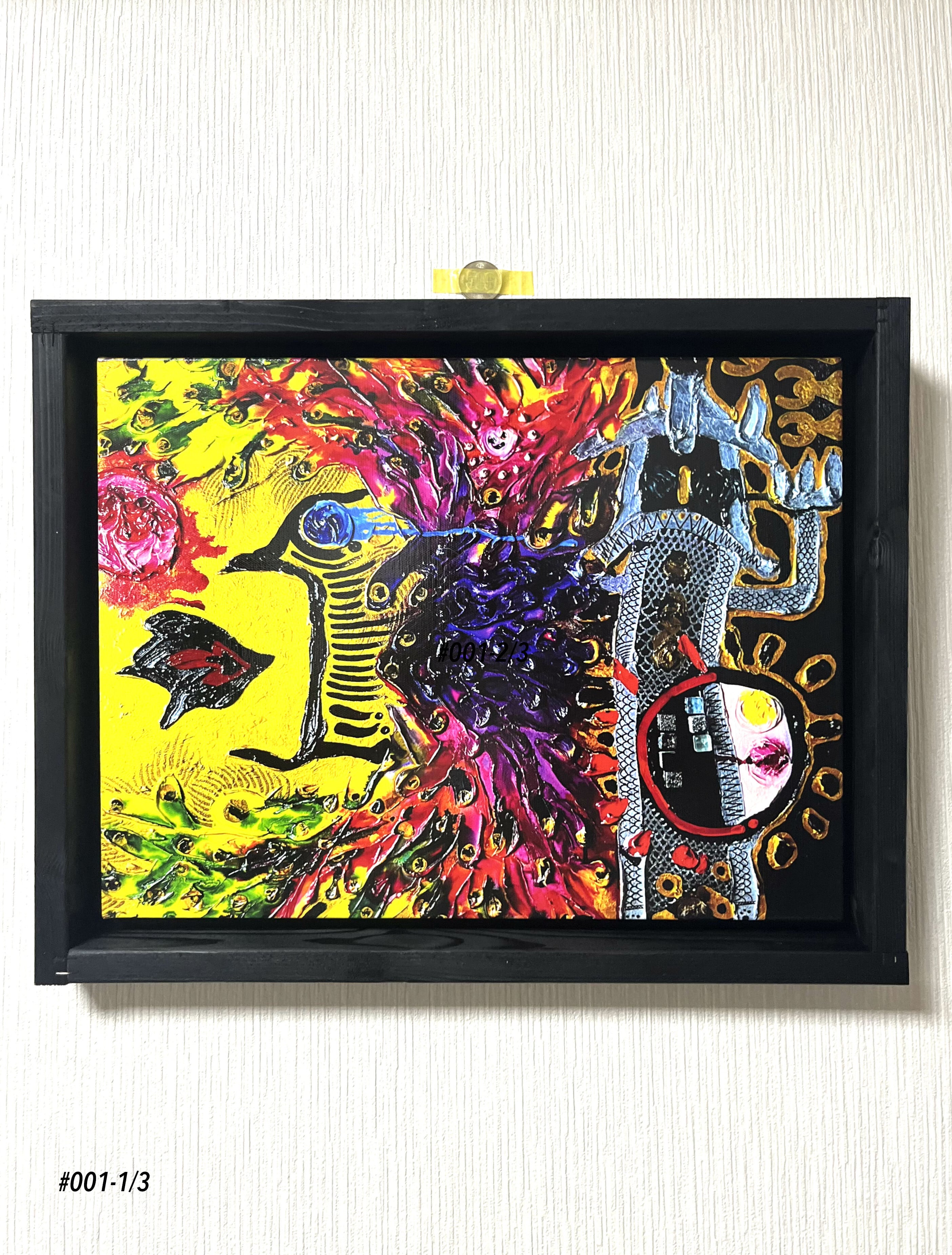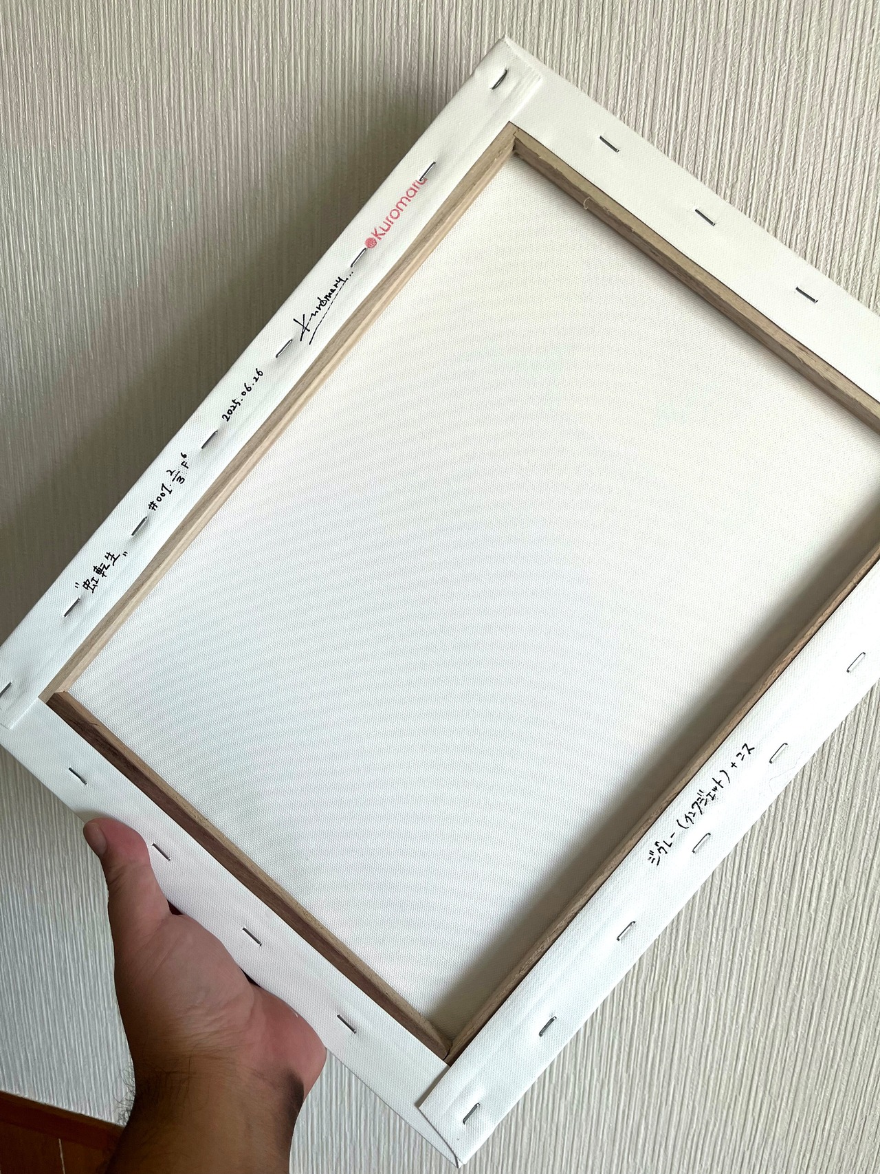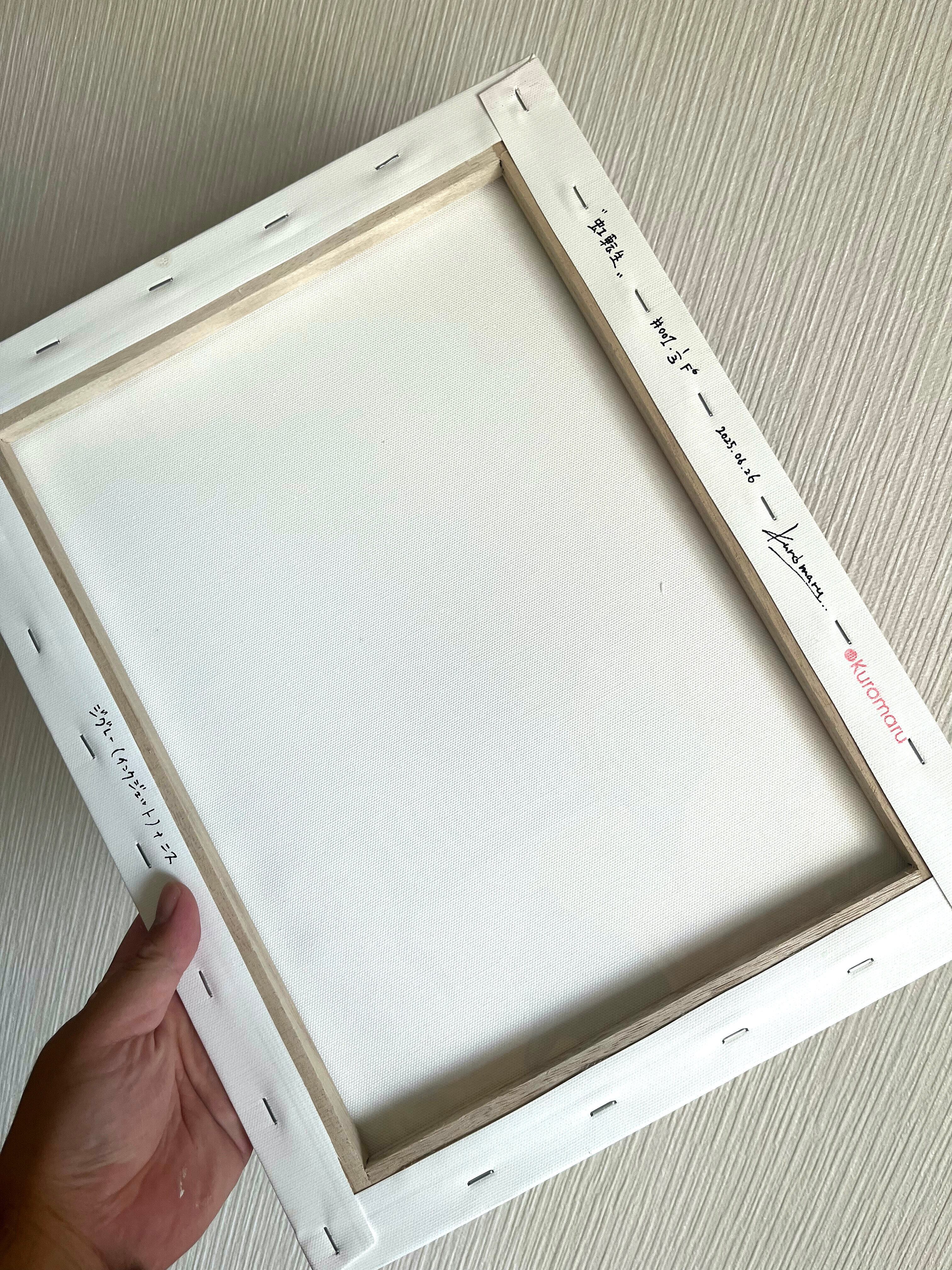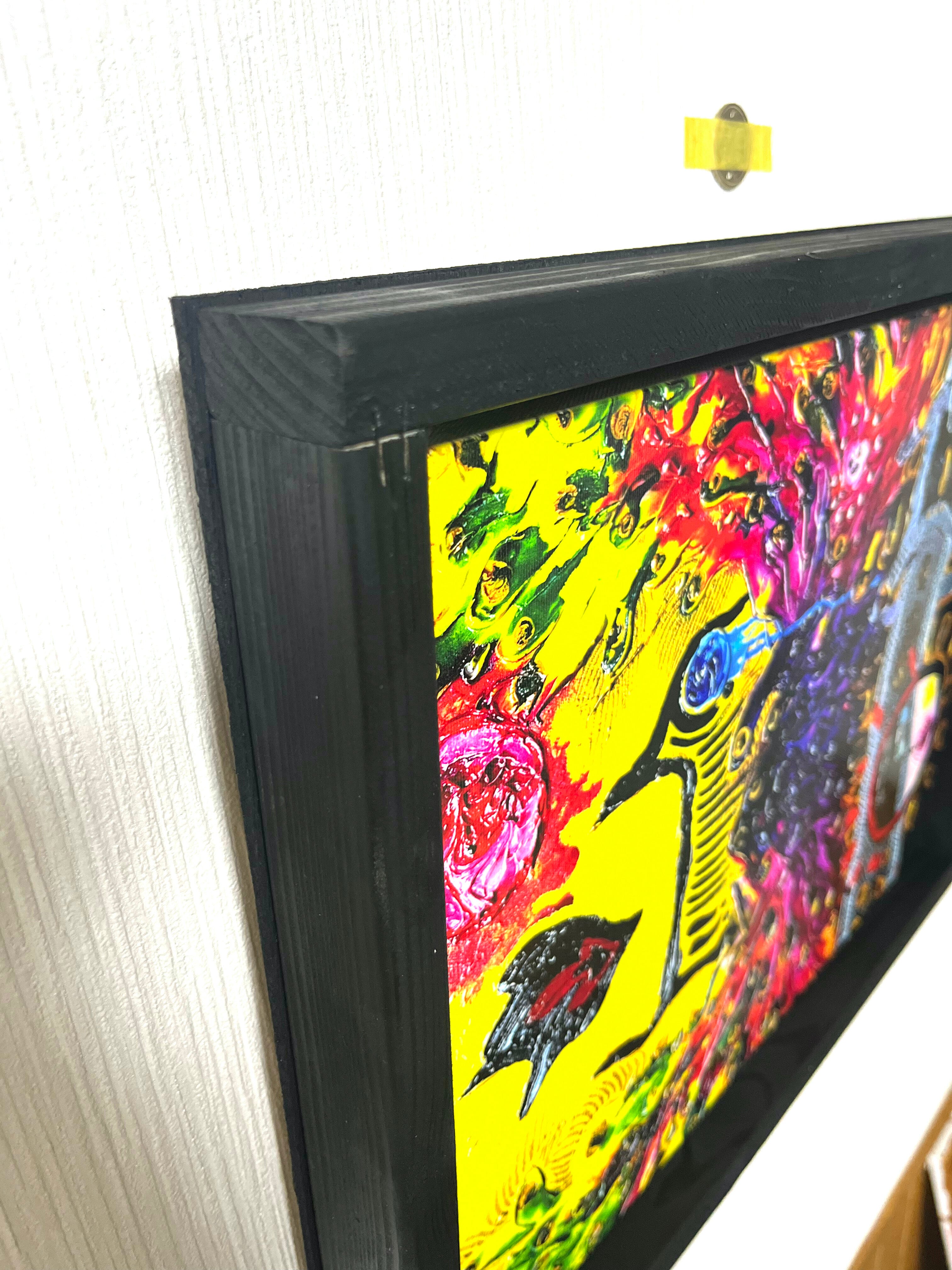 額装:くろまる手作り額装・ホワイトウッドをアクリルスプレーで黒色に塗装(額装と絵画はタッカーで固定されています。アクリル板は御座いません。絵画は露出しています。額装は汚れ、タッカーミス、穴あけミス、補助線などそのままですが味として受け取っていただければ幸いです。)