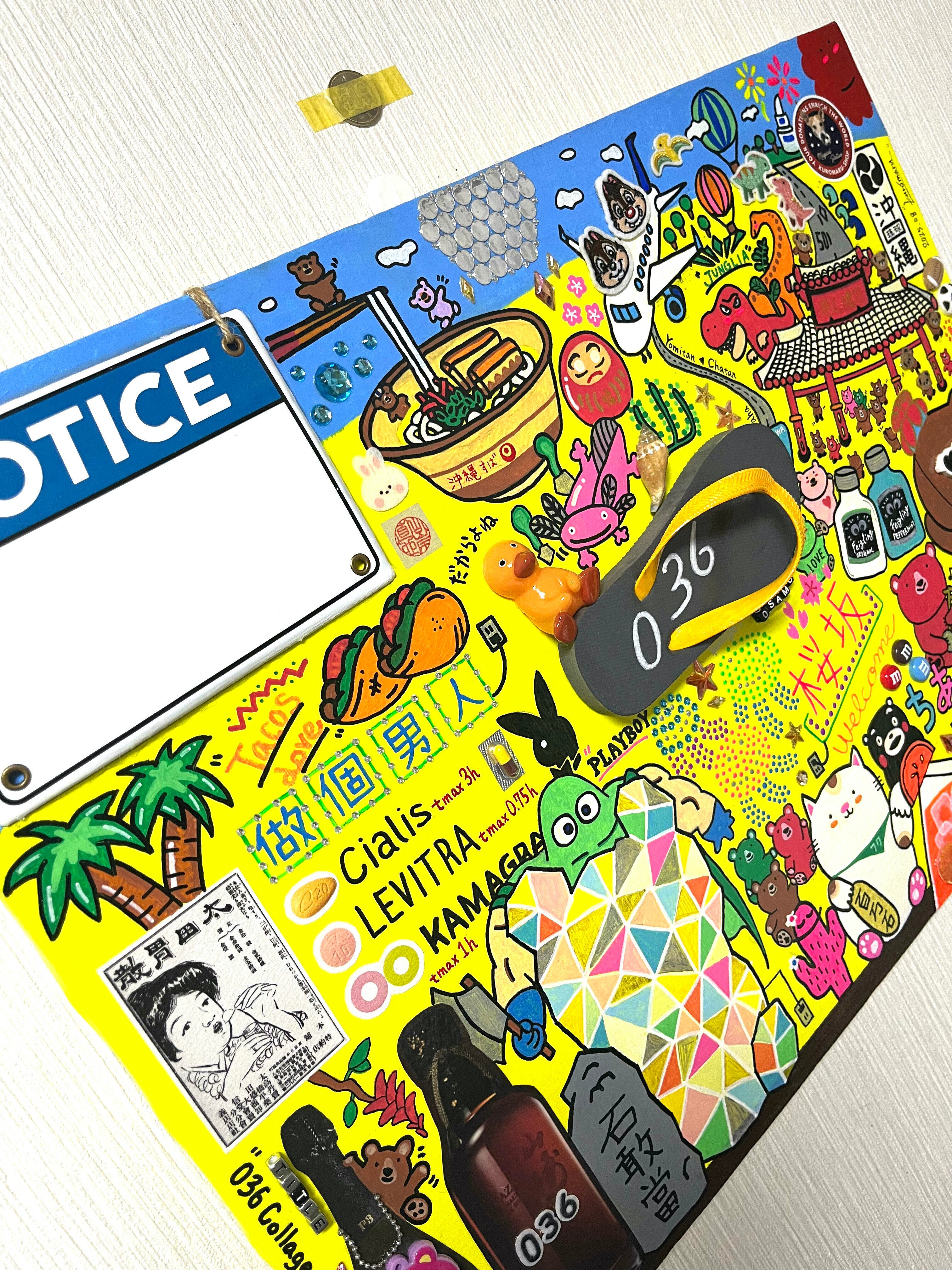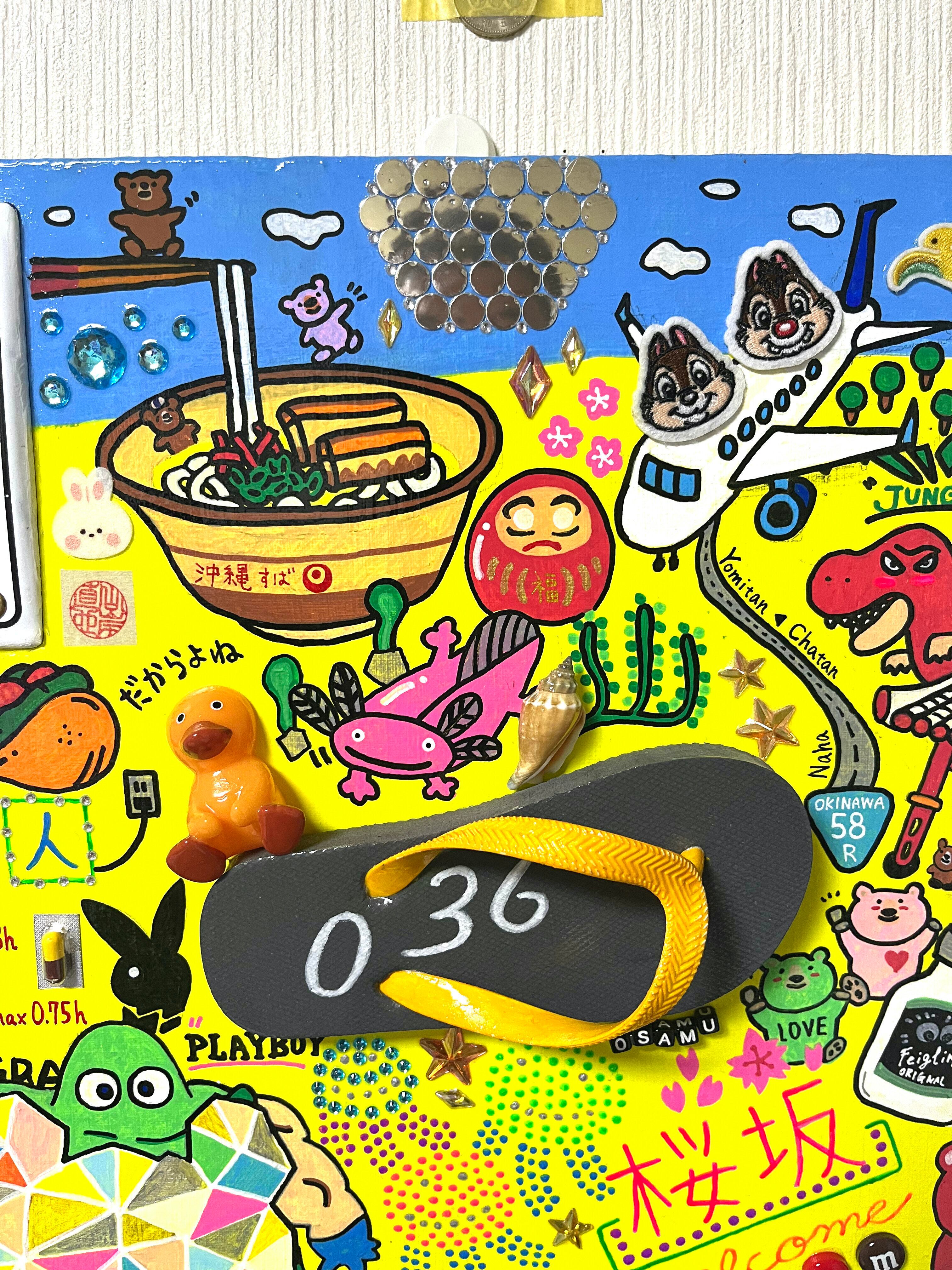036さんを訪れた方にはわかると思いますが、店内に無数にあるグッズ達をモチーフに作成しました。036さんの煌びやかで賑やかな店内をイメージできると思います。全体的に、沖縄の、男色の、夜の街をテーマで、各種モチーフを散らばしております。