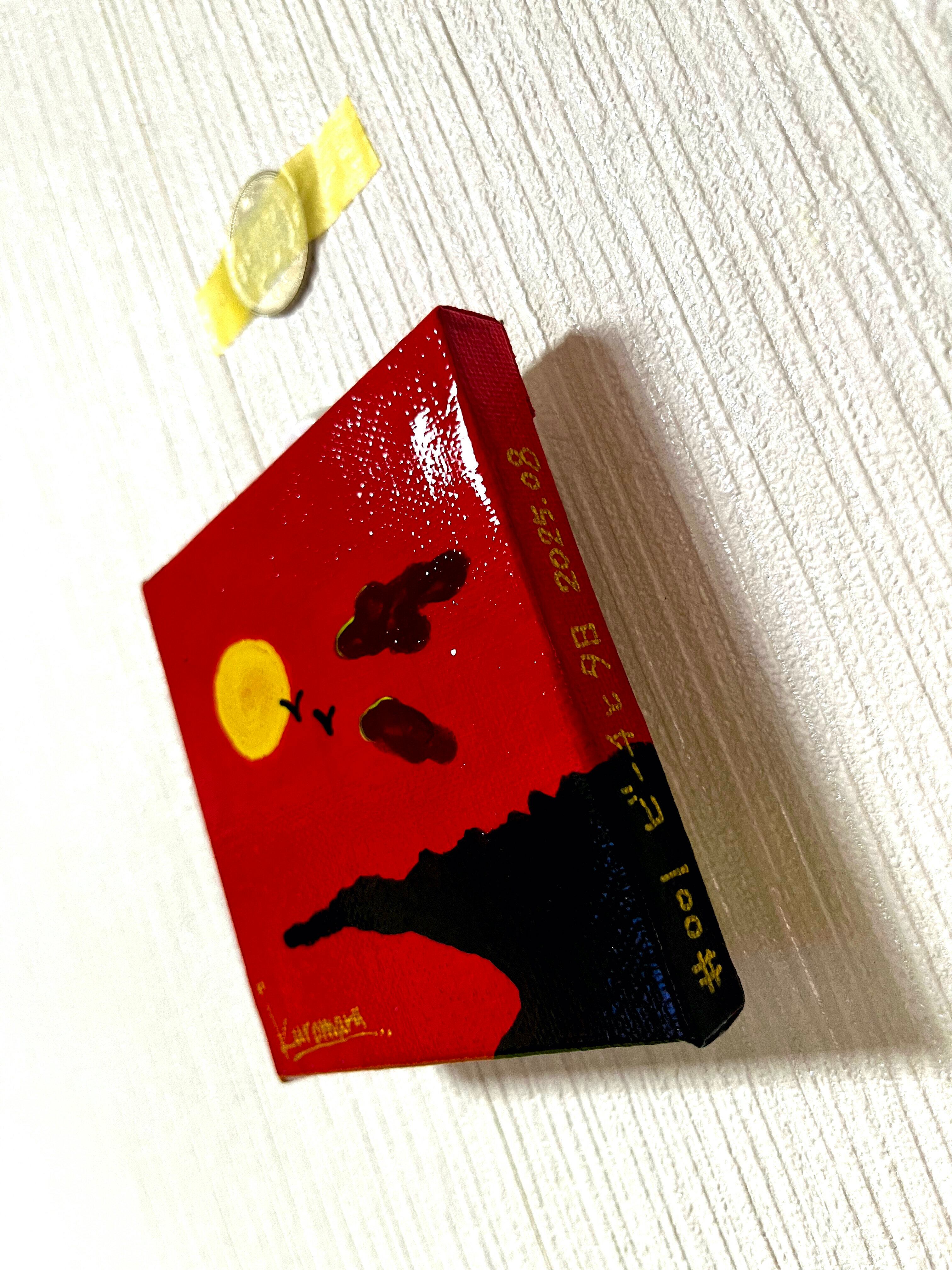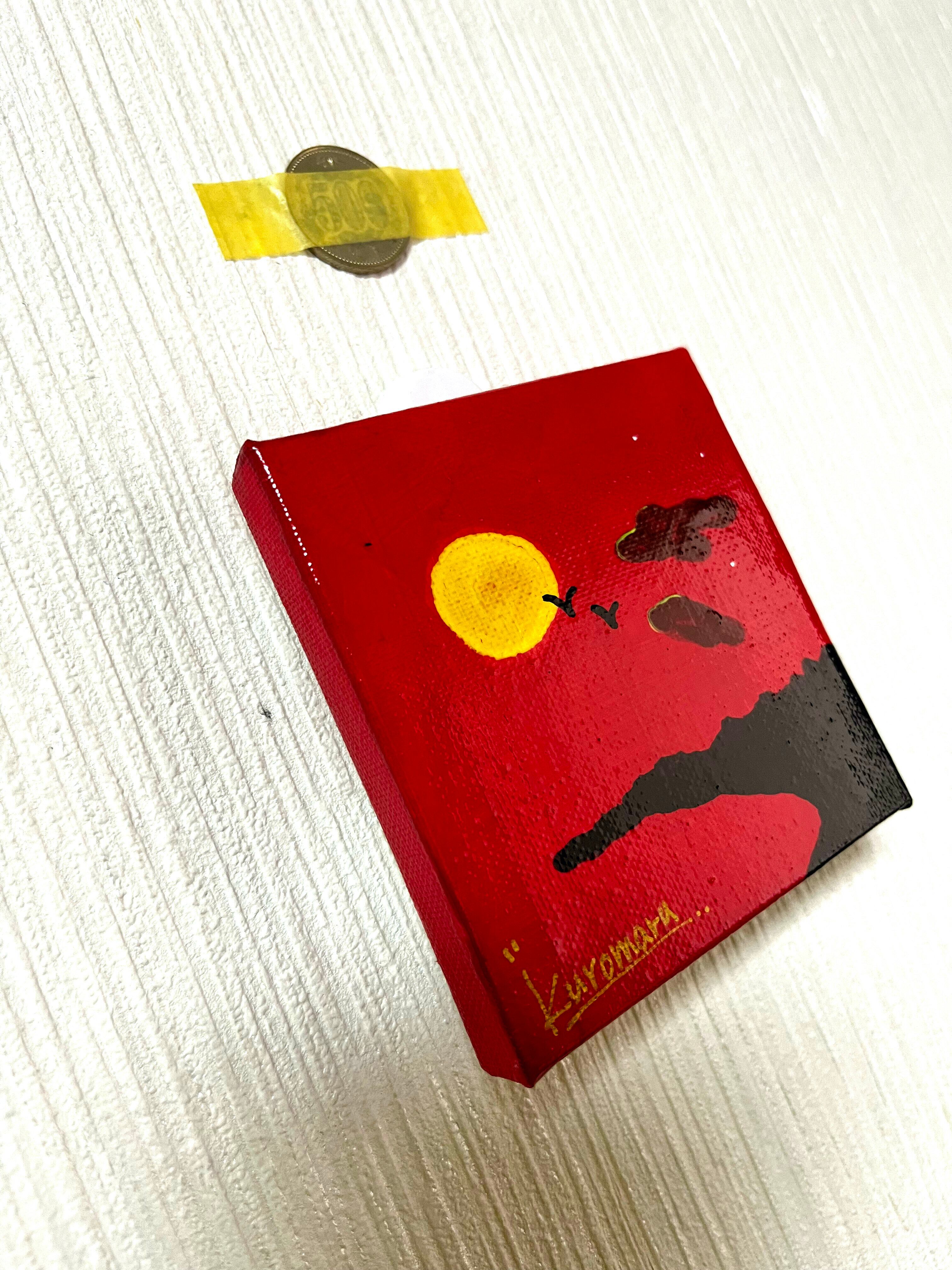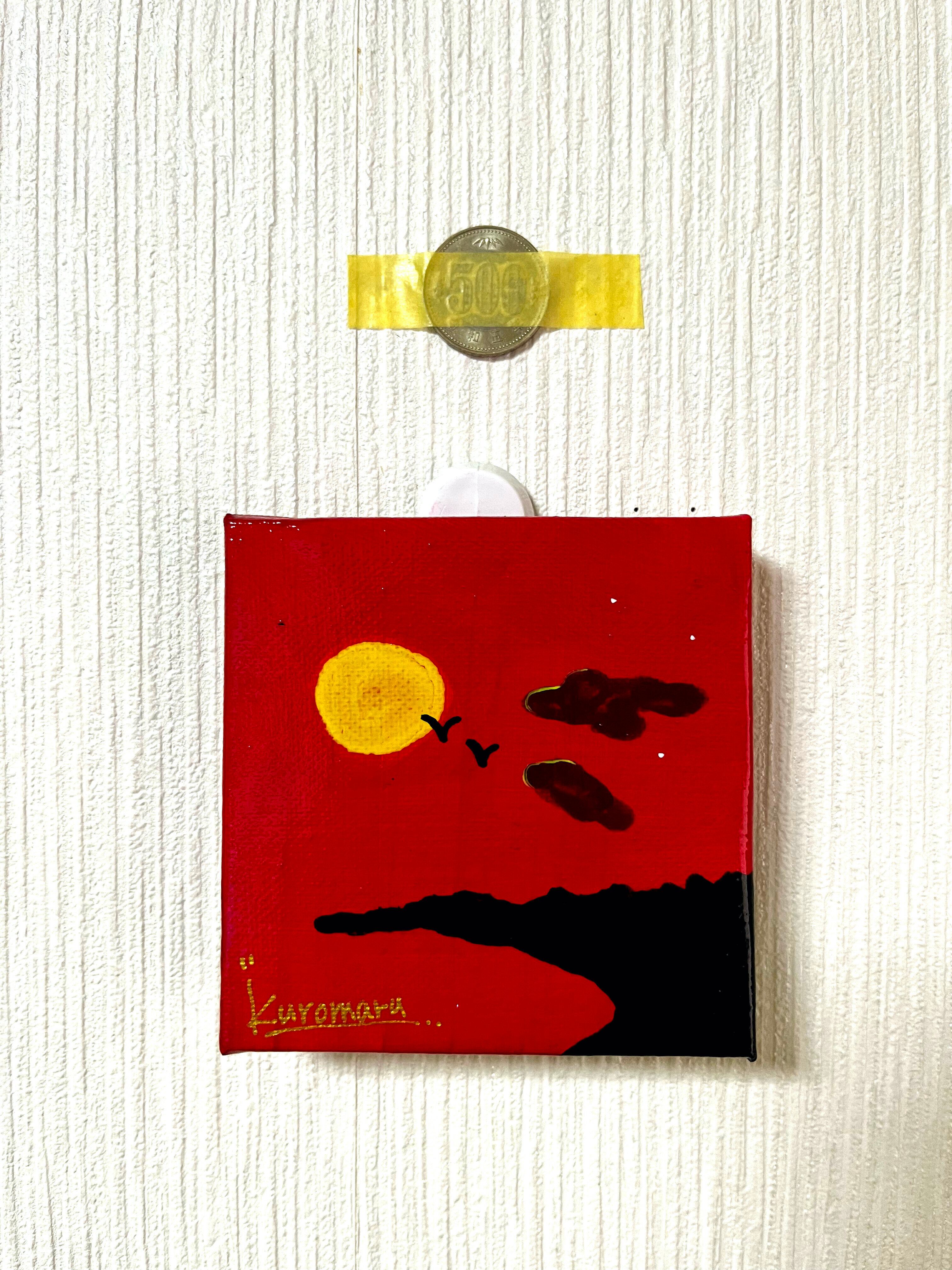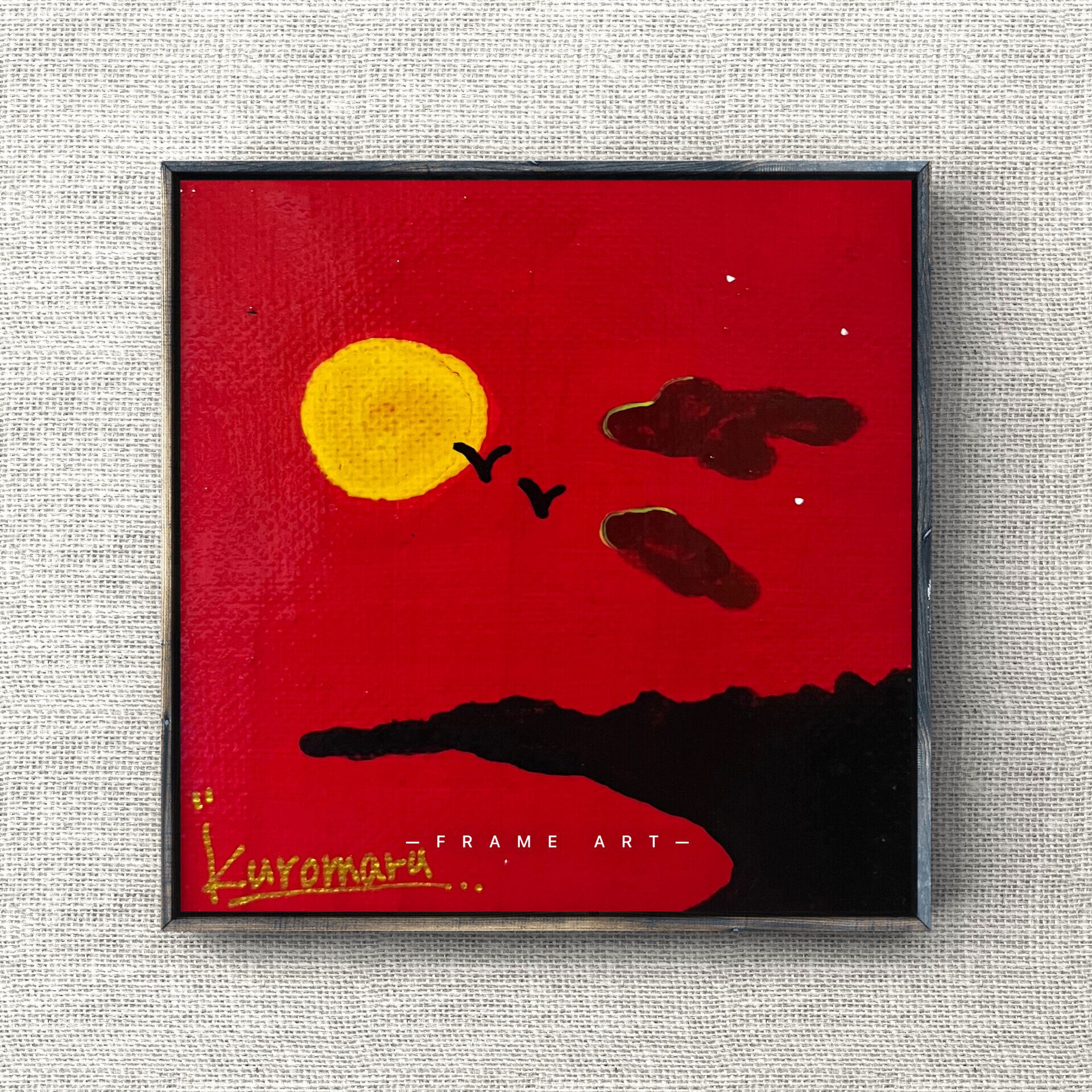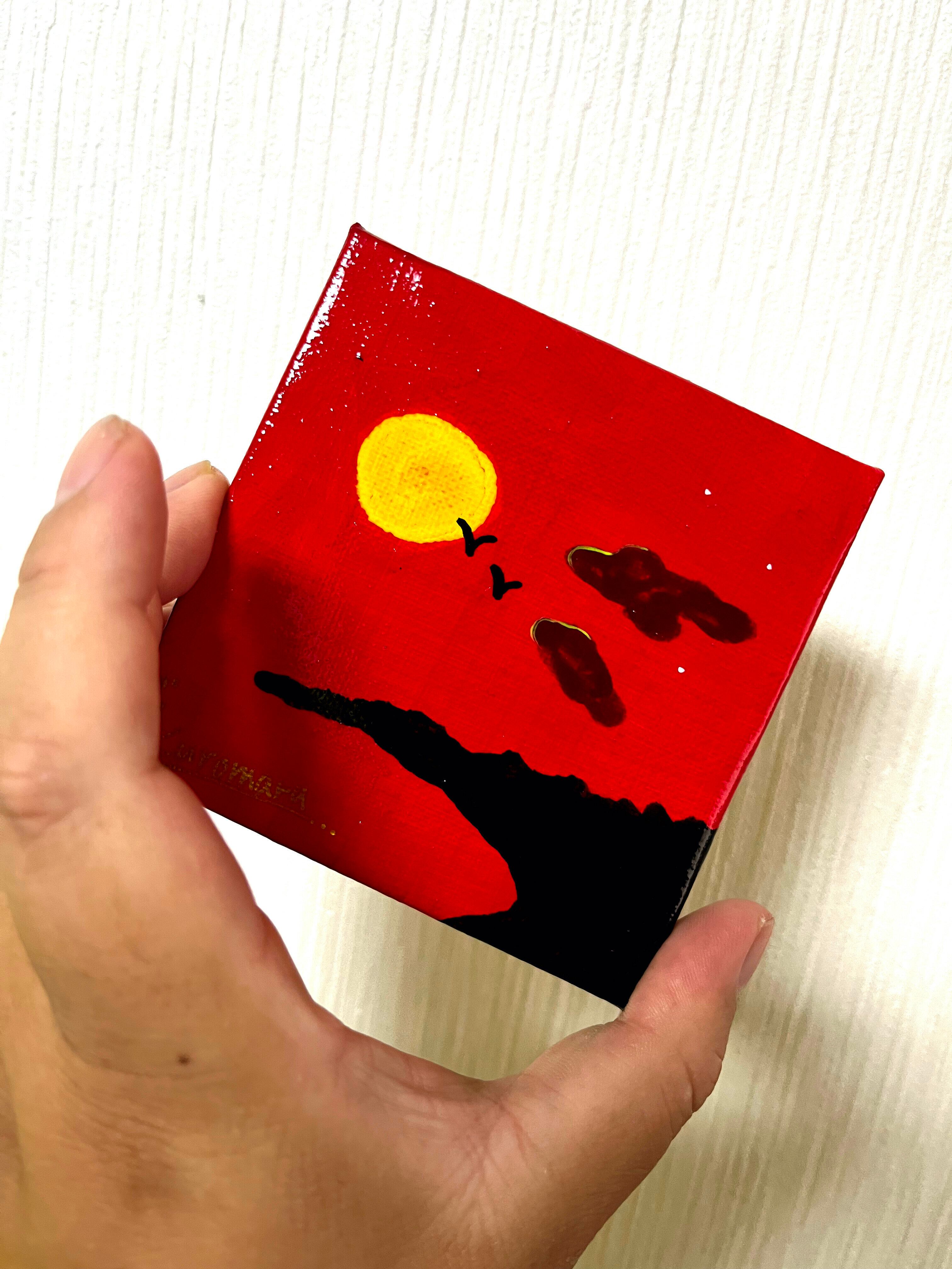 真っ赤に染まる空と黄色に輝く夕日を描きました。暗くなり始めたビーチと夕日の絵画です。四重ニスより更なるメルティ感と、ニスによる絵の具の発色を最大限に引き出しています。あなたのお家にゆっくり寛げる優しい絵画を迎えませんか?
