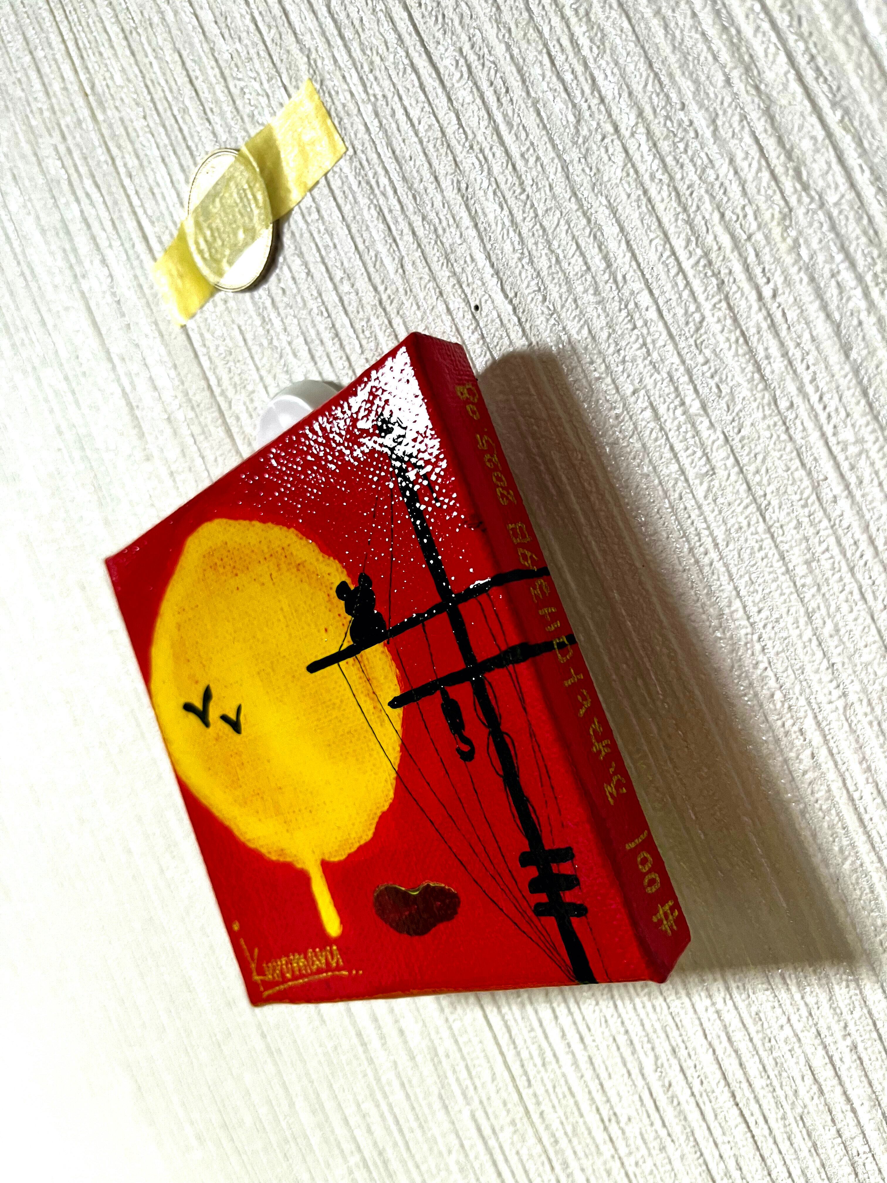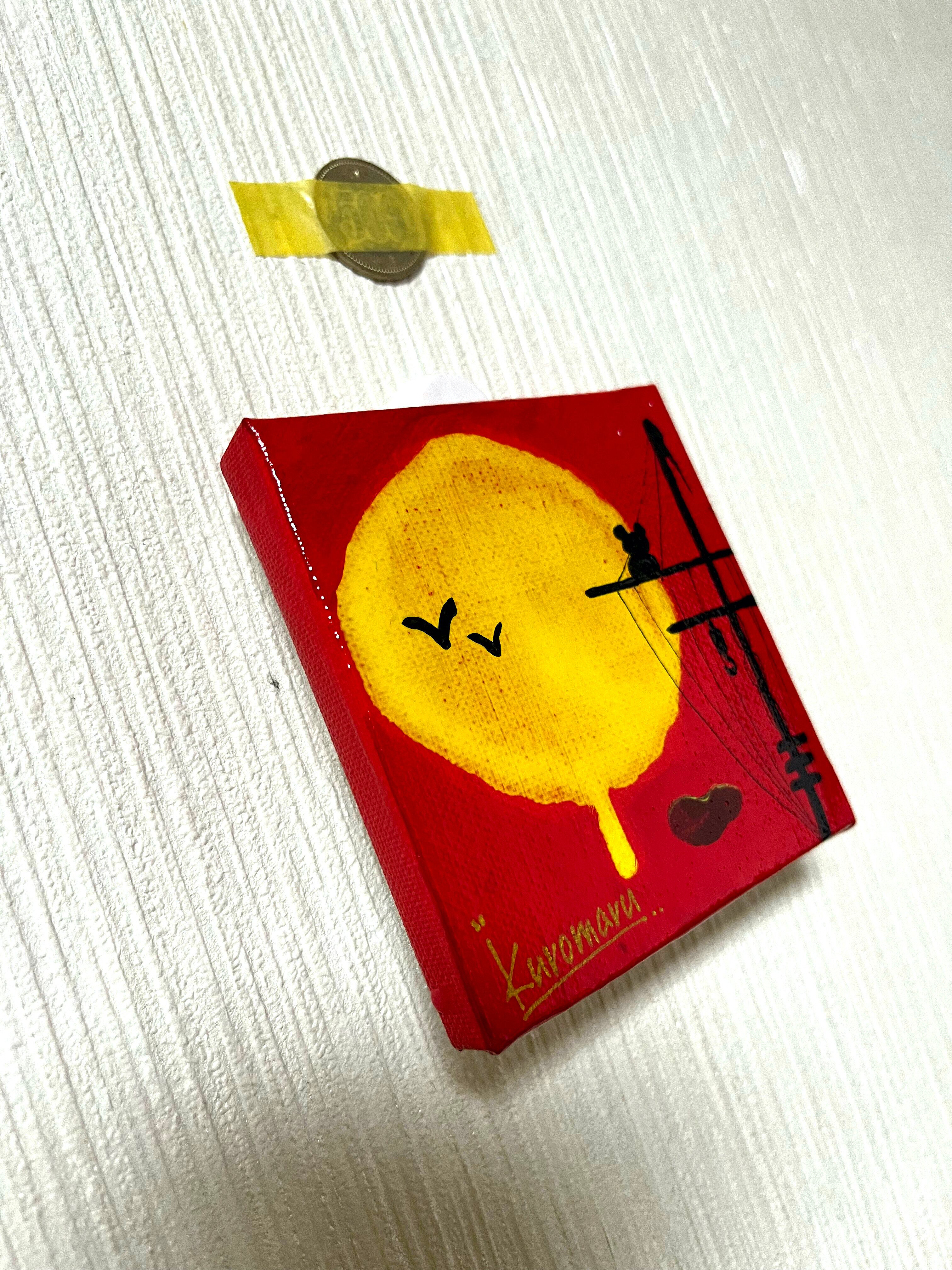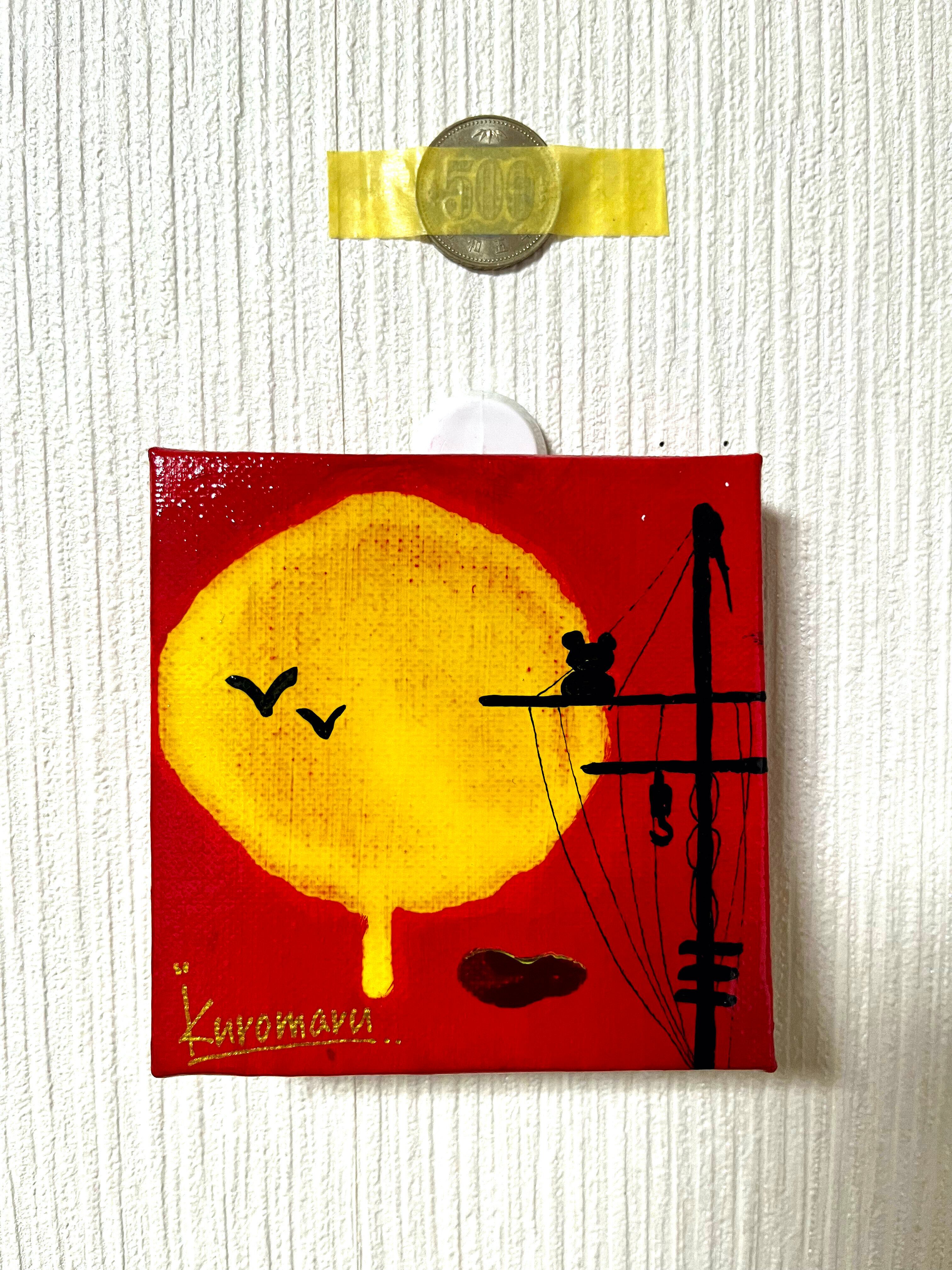 真っ赤に染まる空と黄色に輝く夕日と船を描きました。四重ニスより更なるメルティ感と、ニスによる絵の具の発色を最大限に引き出しています。あなたのお家にゆっくり寛げる優しい絵画を迎えませんか?