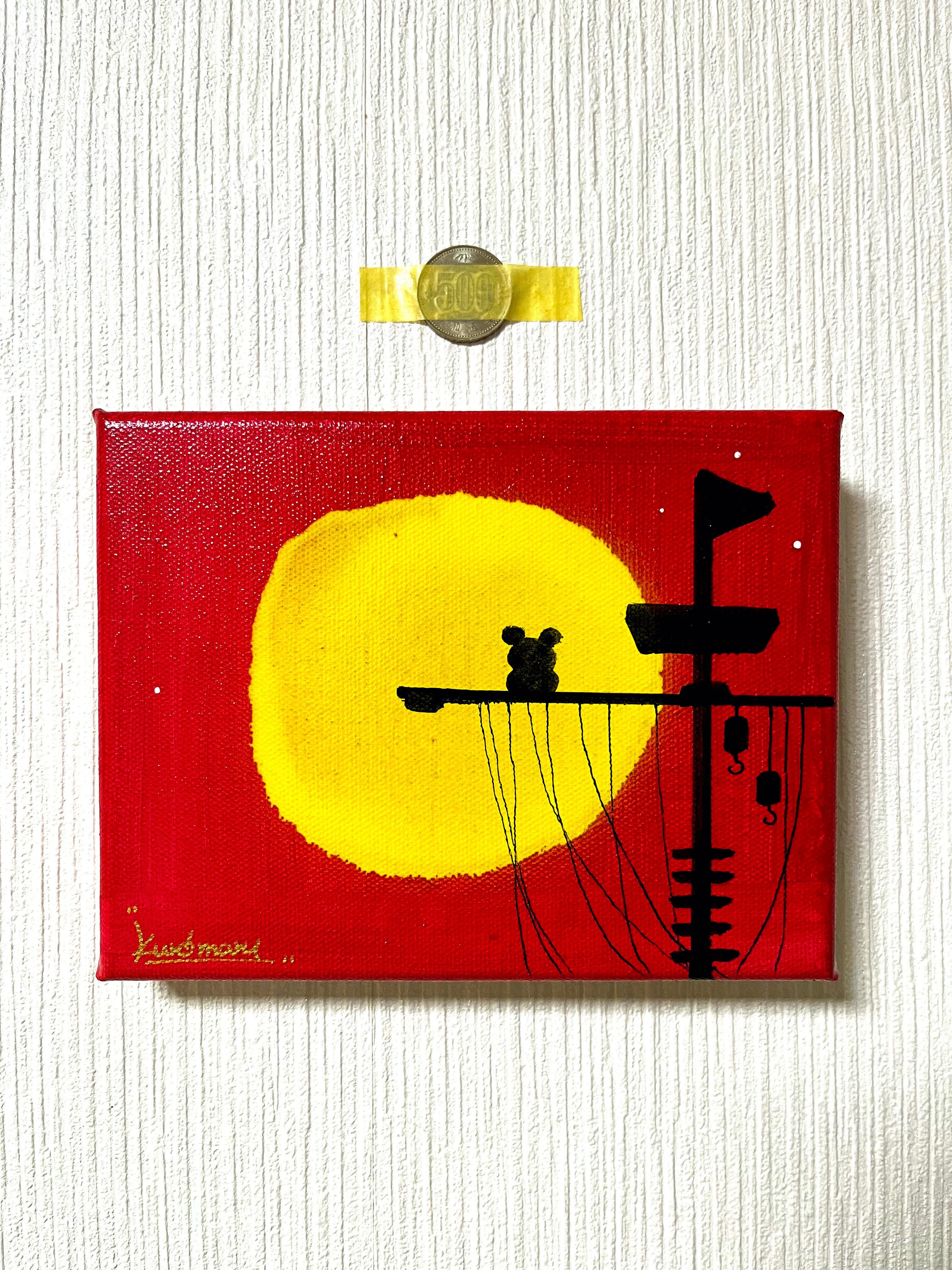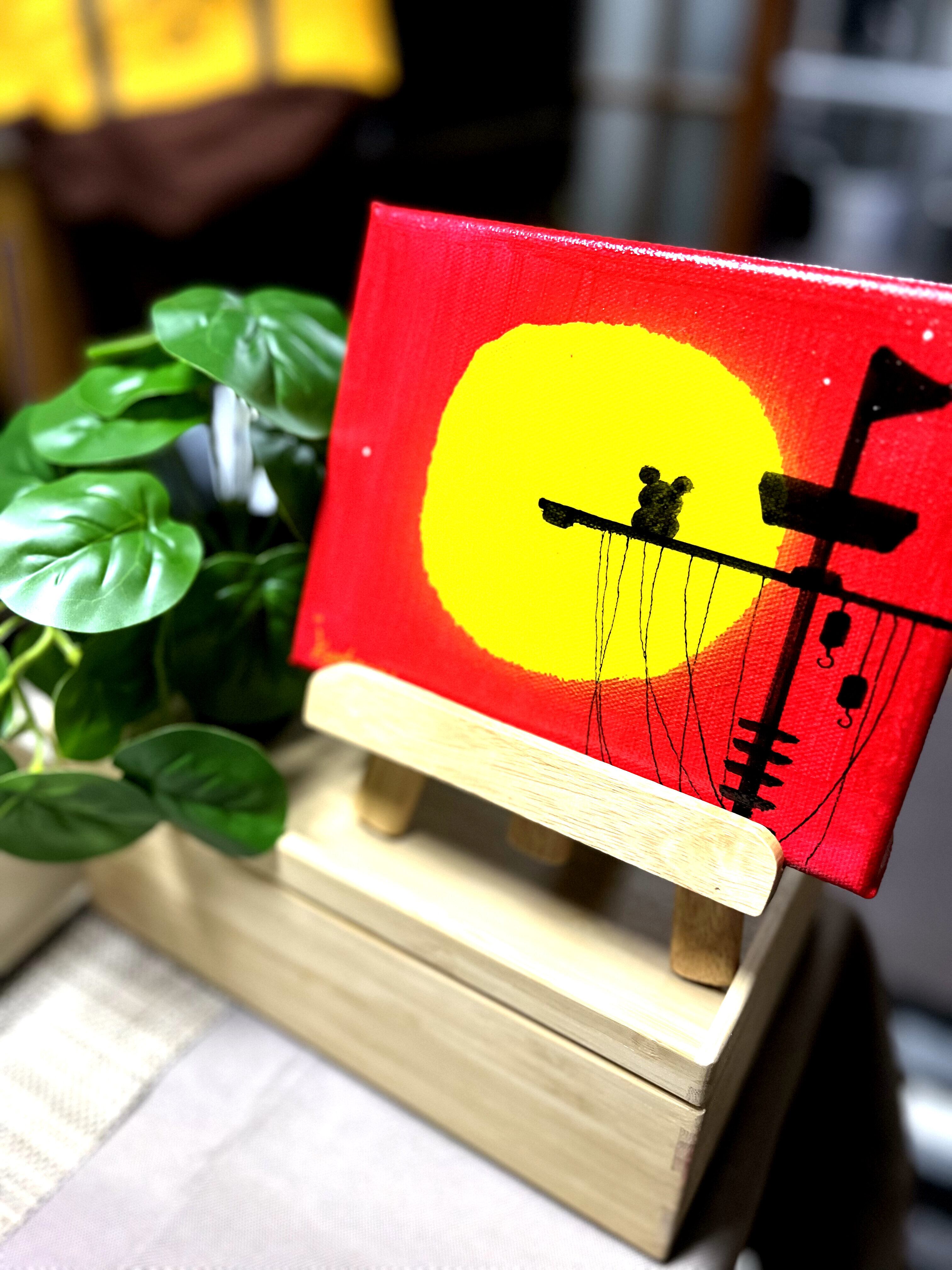 真っ赤に染まる空と黄色に輝く夕日を描きました。那覇から浦添、その上にある宜野湾市。ヨットハーバーがある宜野湾コンベンションセンターなど、マリンスポーツが人気の区域です。四重ニスより更なるメルティ感と、ニスによる絵の具の発色を最大限に引き出しています。あなたのお家にゆっくり寛げる優しい絵画を迎えませんか?