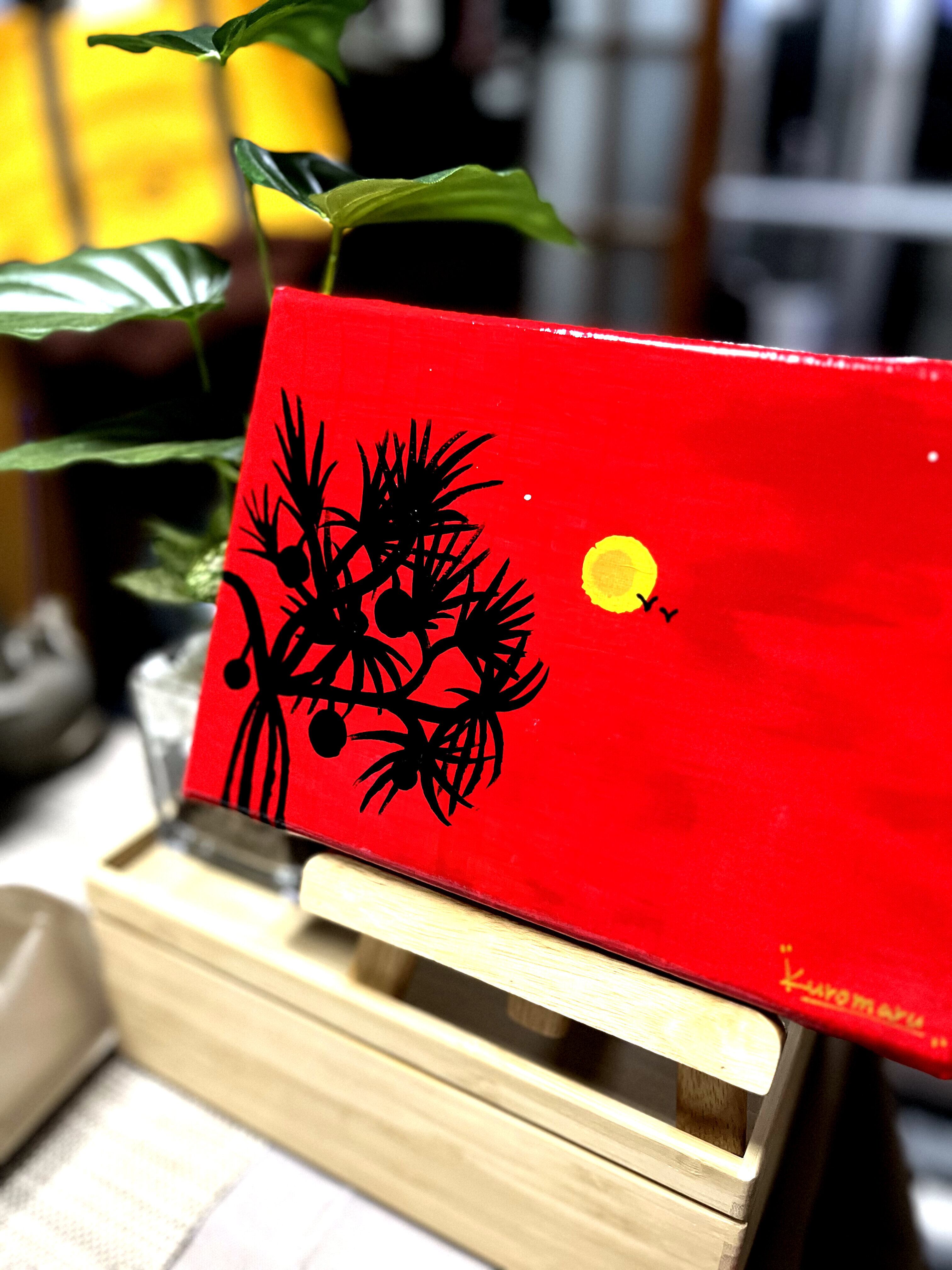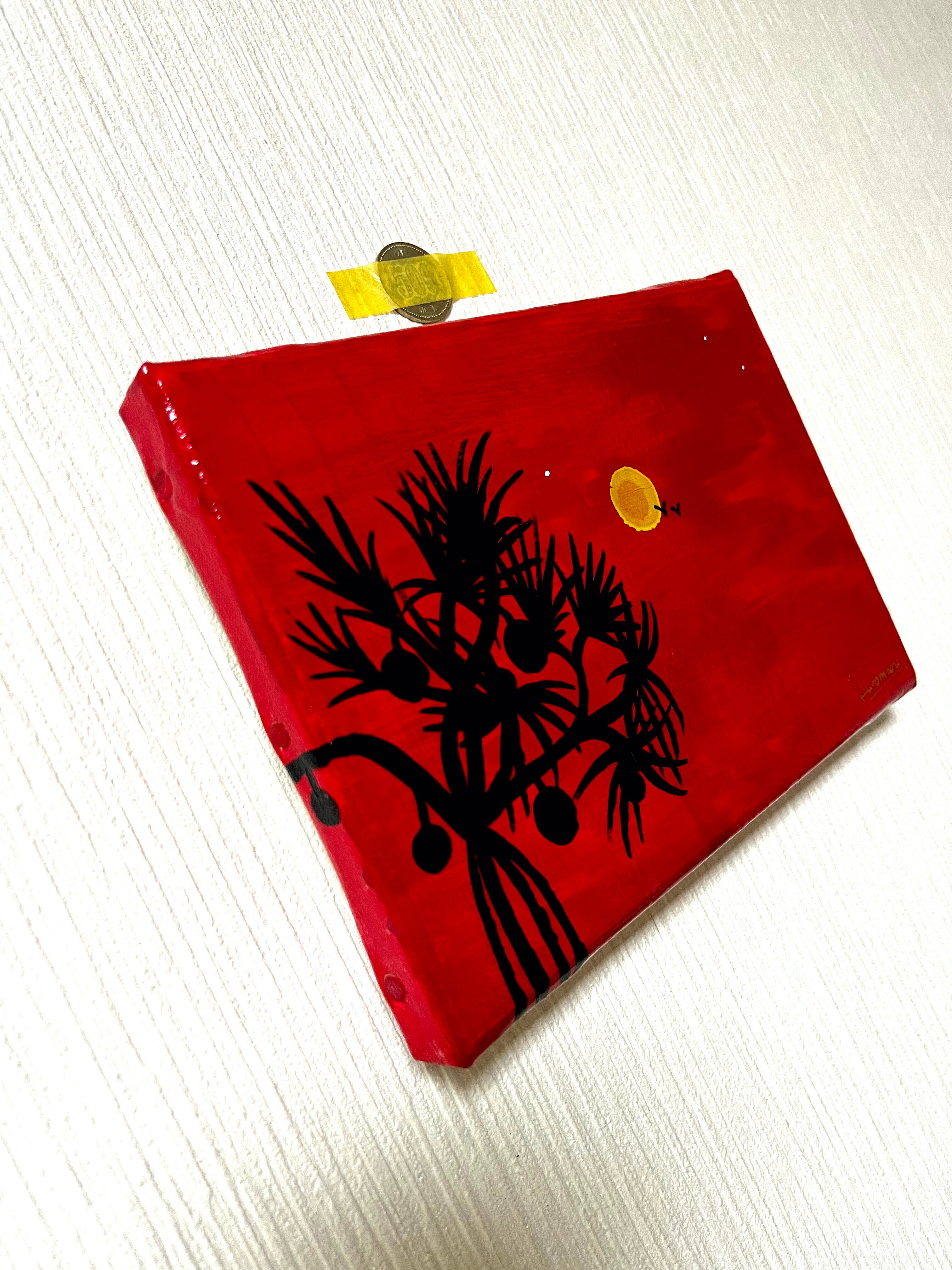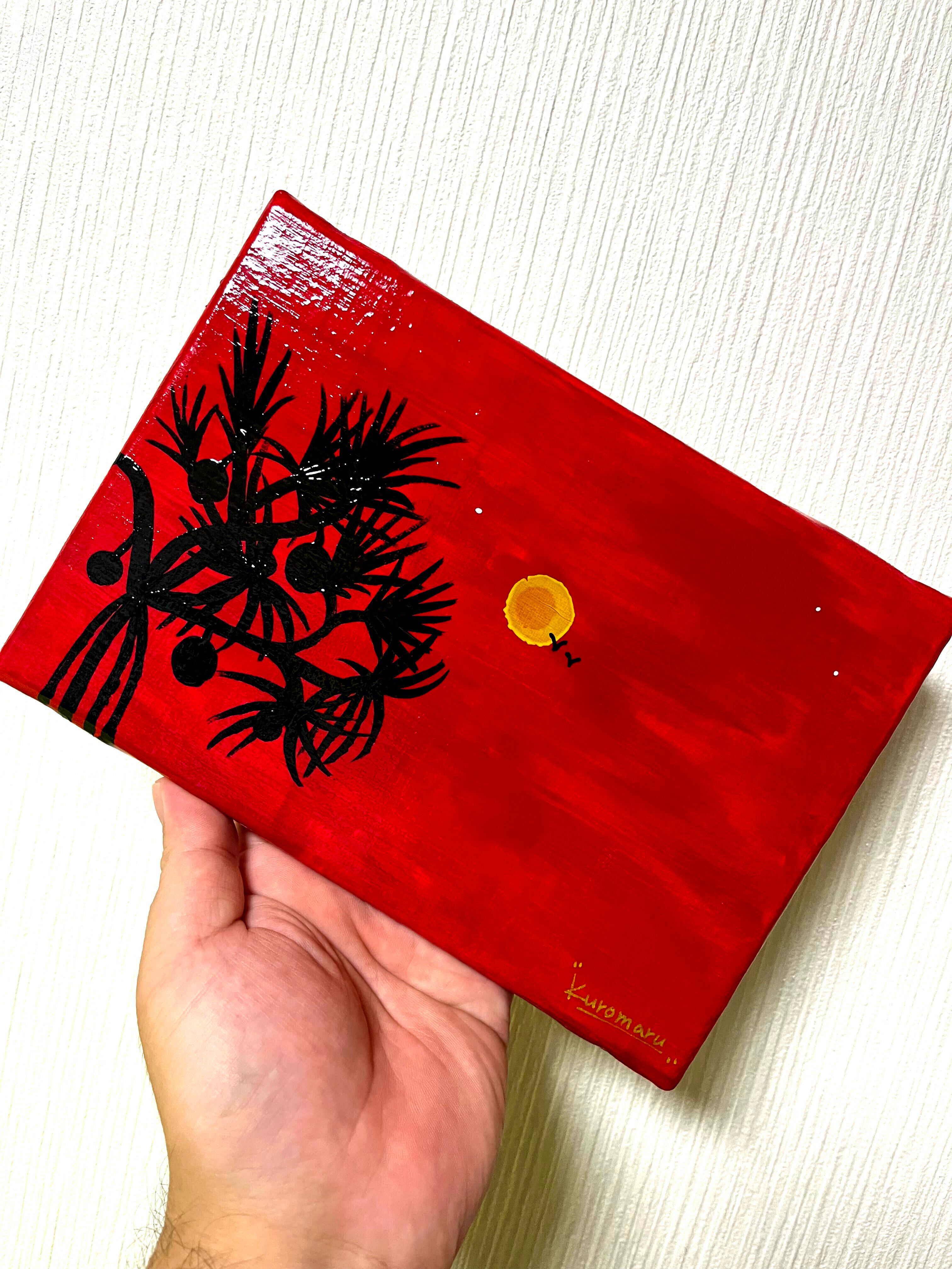 真っ赤に染まる空と黄色に輝く夕日を描きました。アダンとは南国に生息する植物で、食べれないパイナップルのような実を付けます。四重ニスより更なるメルティ感と、ニスによる絵の具の発色を最大限に引き出しています。あなたのお家にゆっくり寛げる優しい絵画を迎えませんか?
