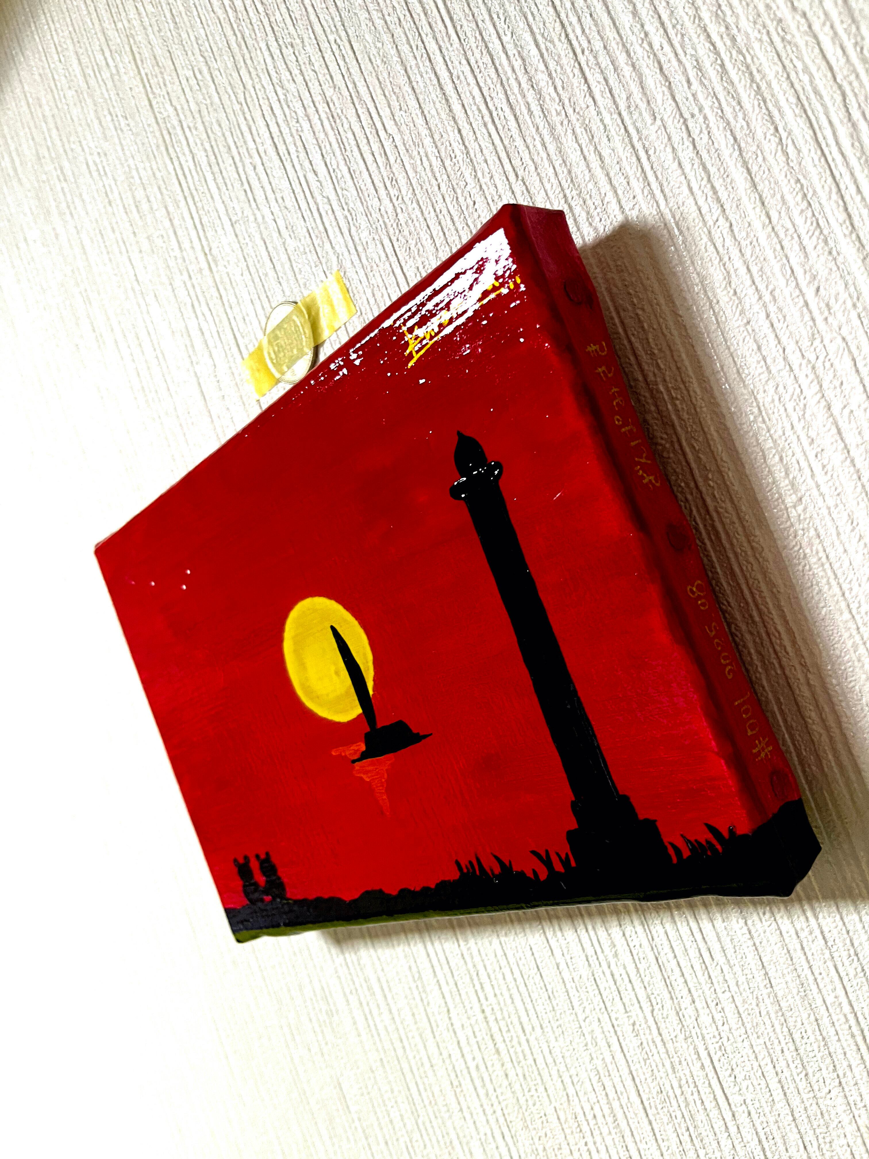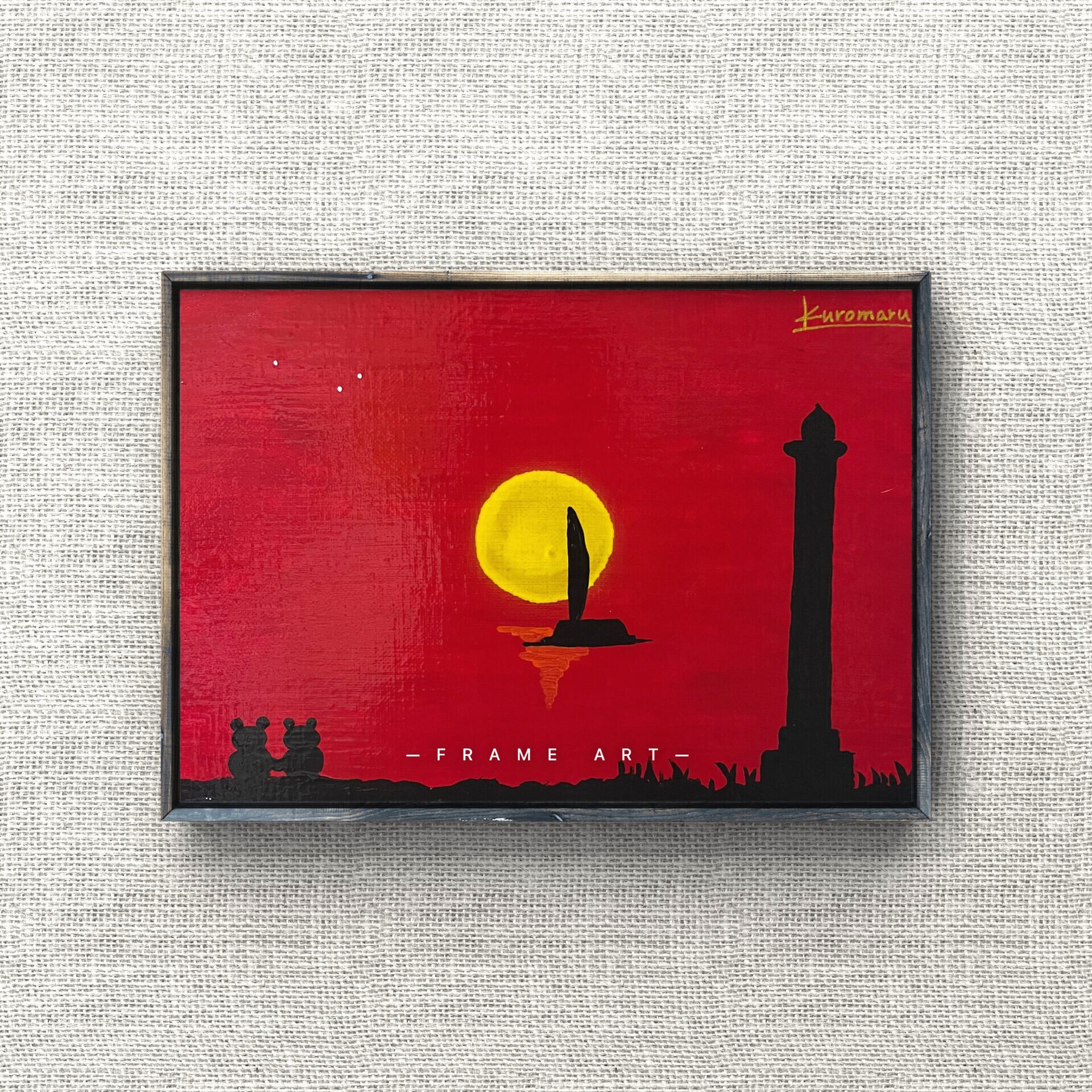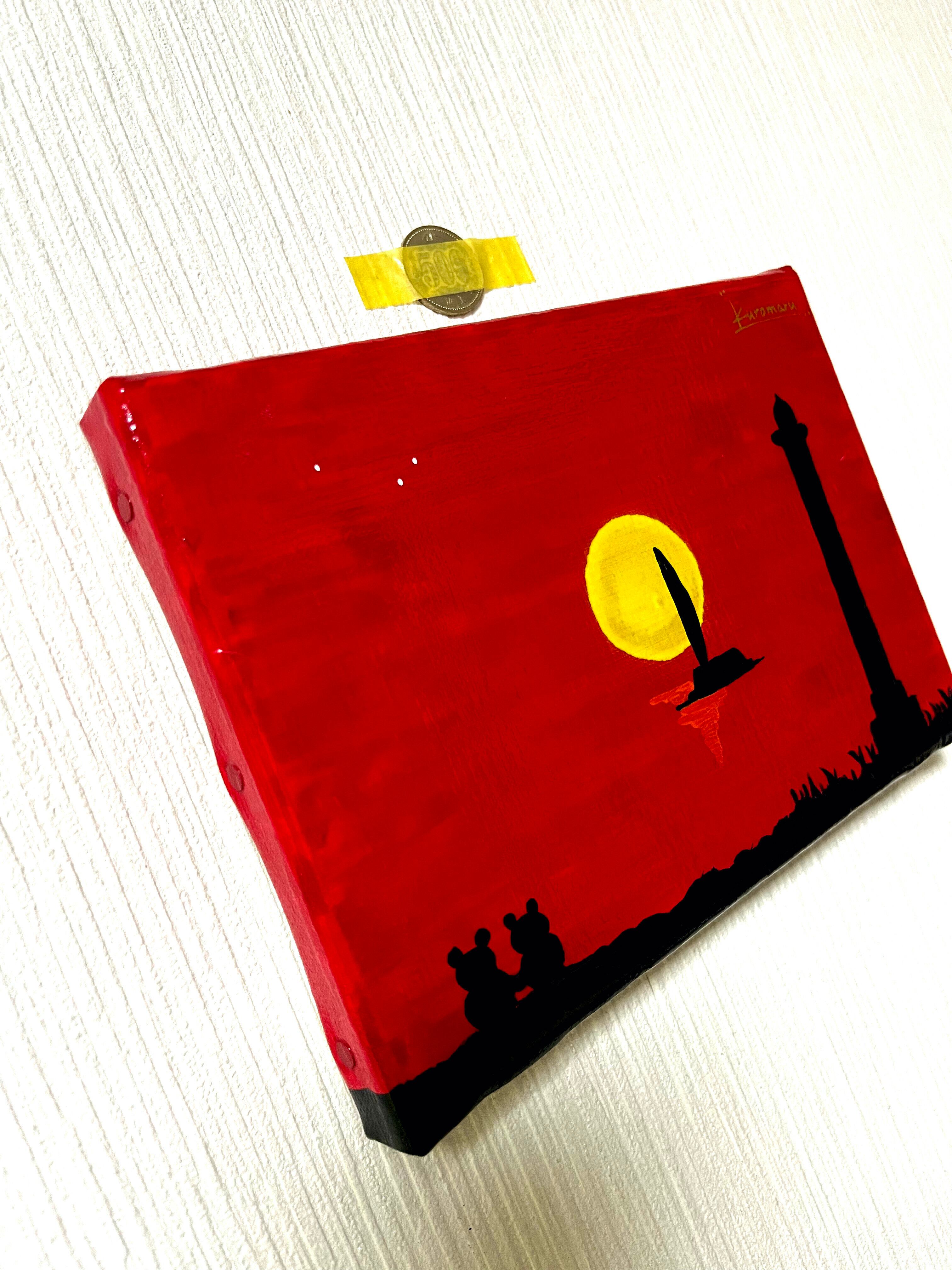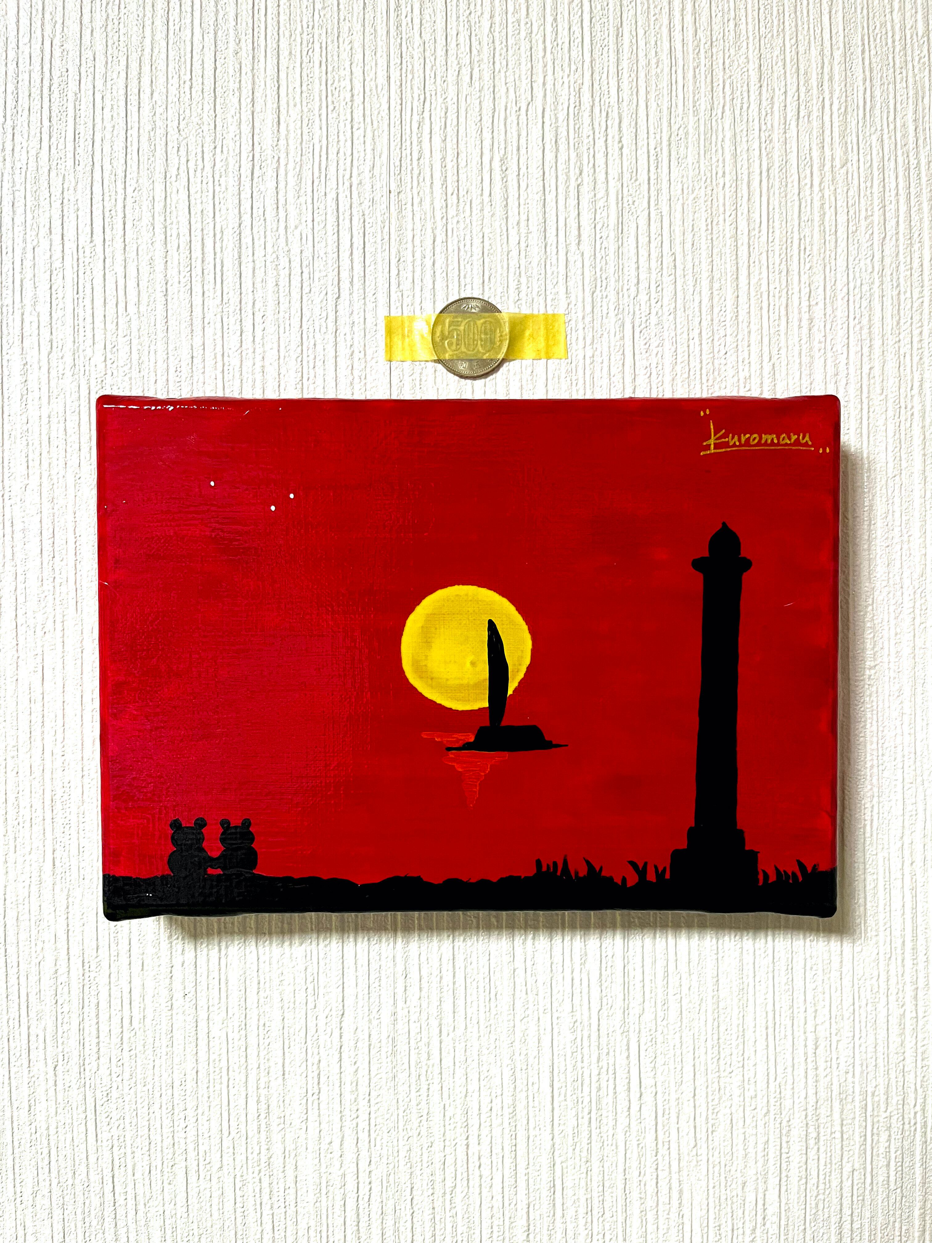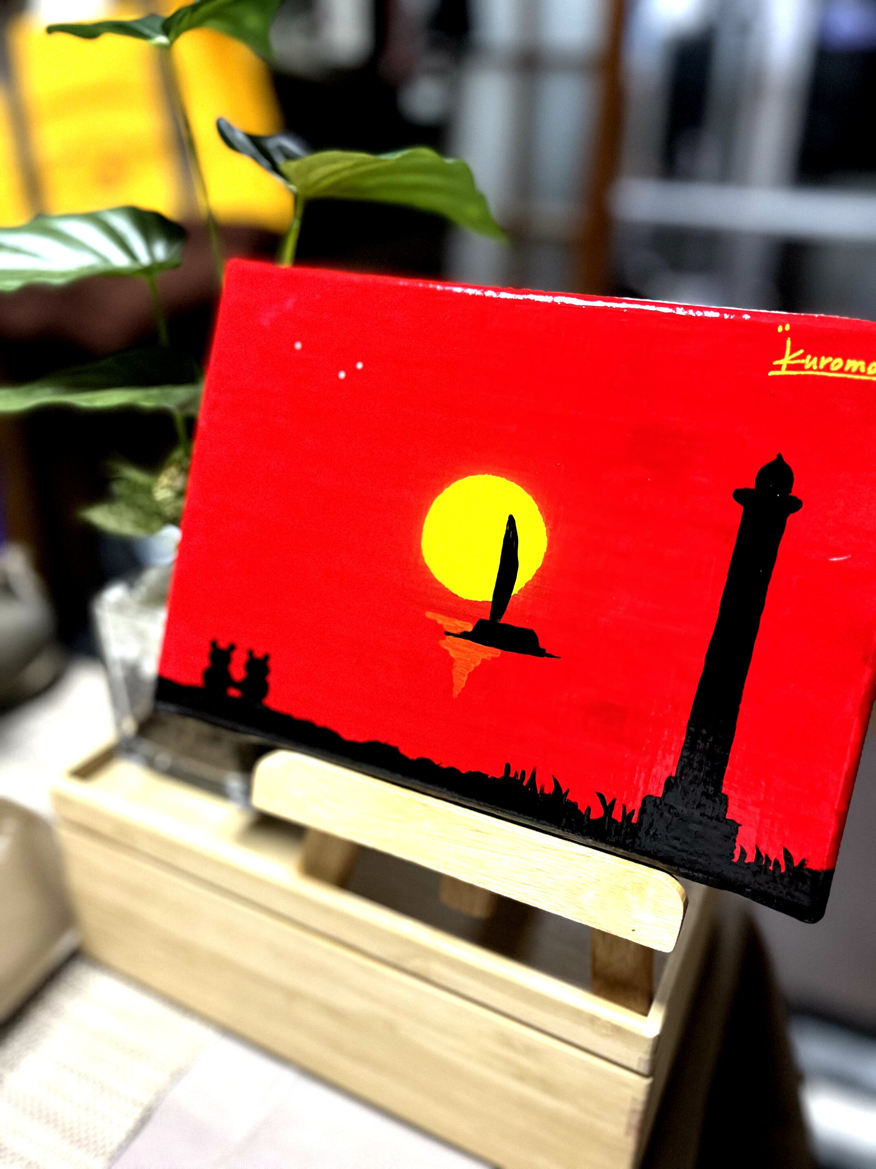 真っ赤に染まる空と黄色に輝く夕日を描きました。残波岬は読谷村にある岬で、この灯台がモチーフになっています。四重ニスより更なるメルティ感と、ニスによる絵の具の発色を最大限に引き出しています。あなたのお家にゆっくり寛げる優しい絵画を迎えませんか?