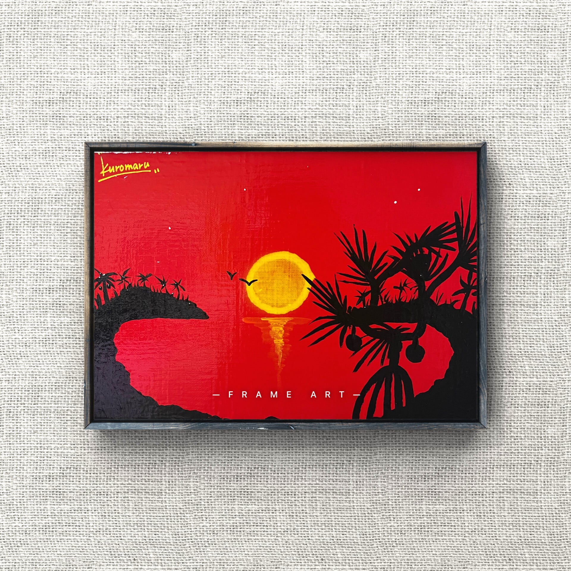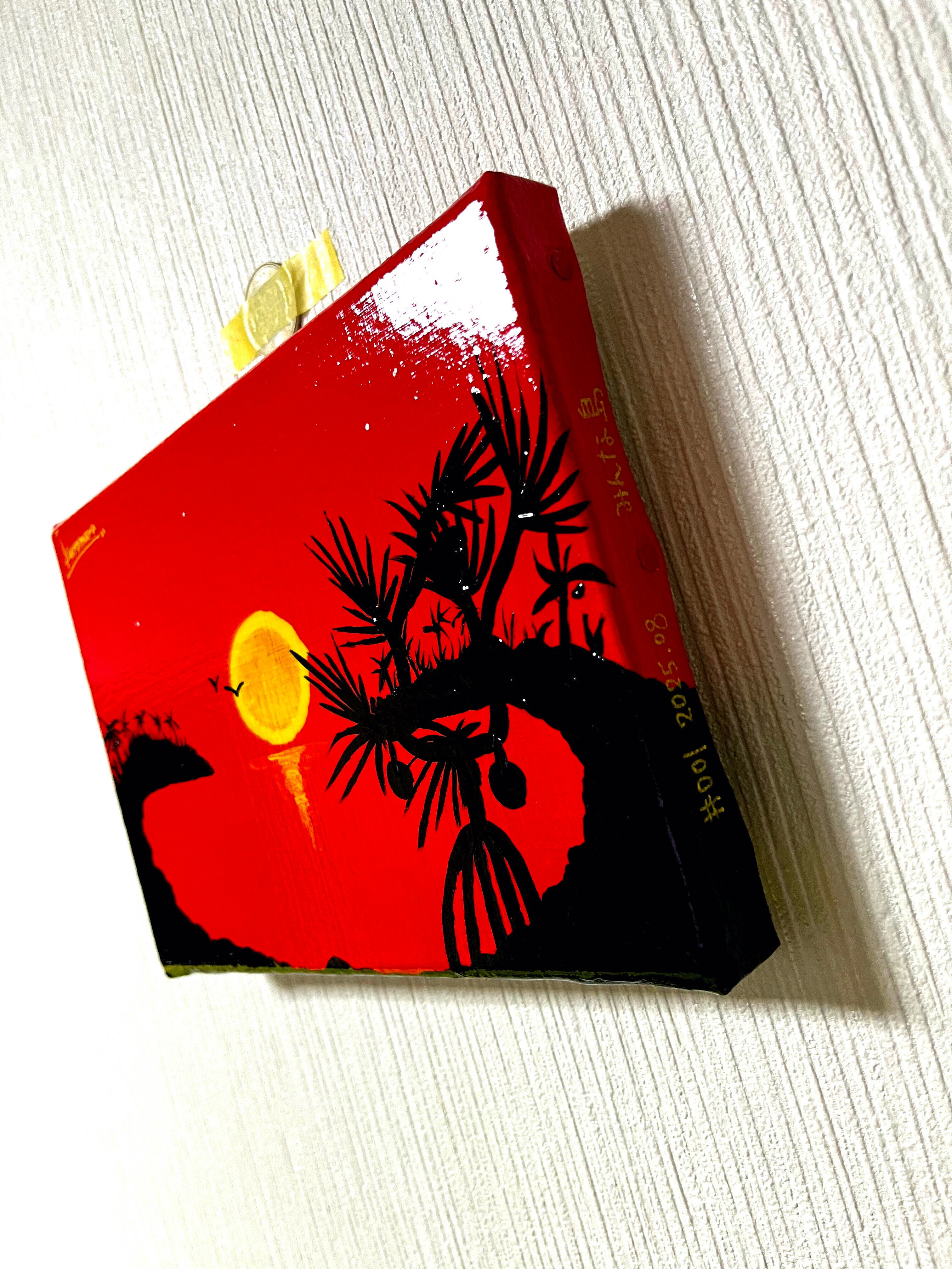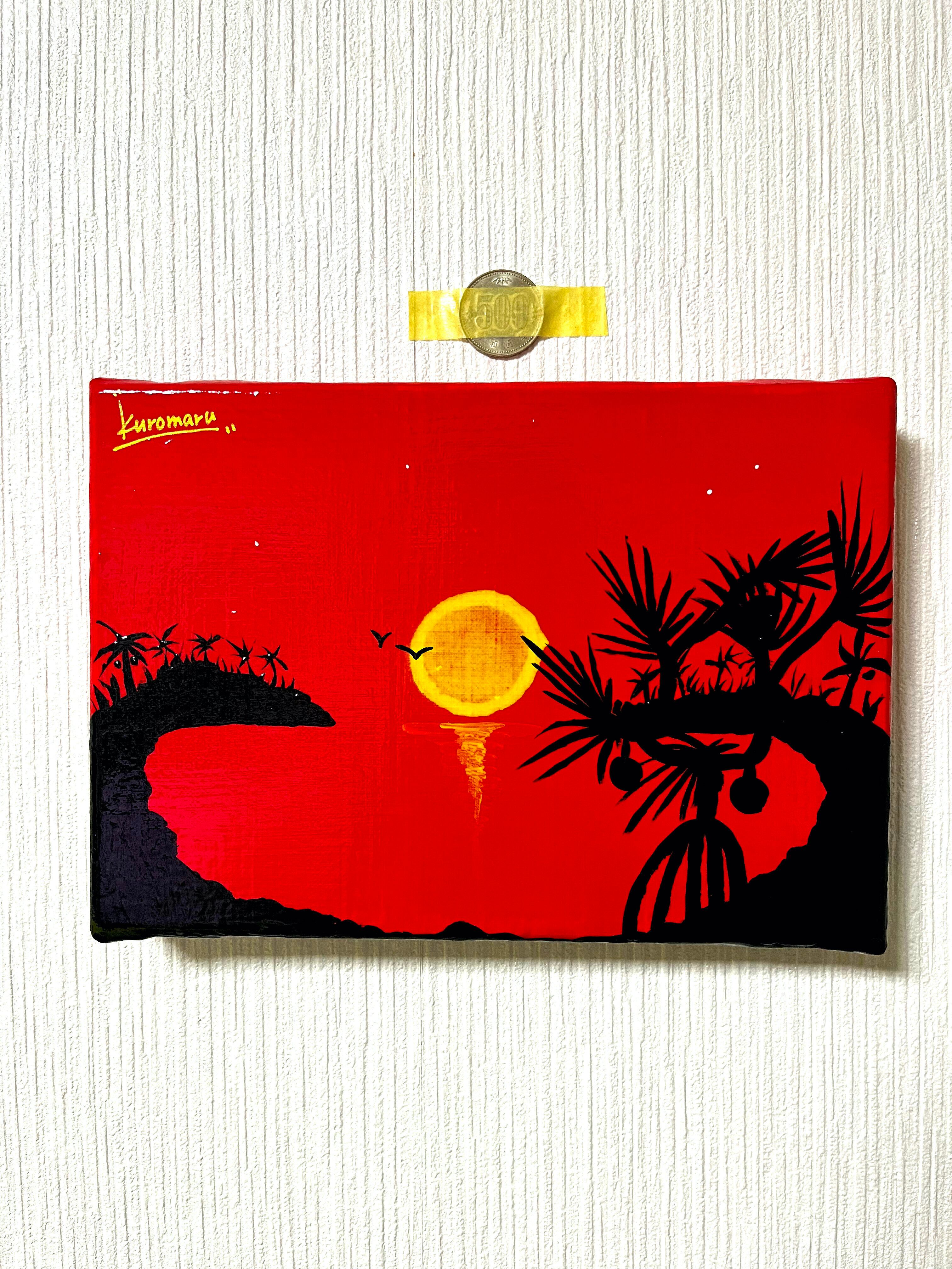 真っ赤に染まる空と黄色に輝く夕日を描きました。水納島は本部町から船で行く沖縄県の離島です。月のような形の入江がモチーフになっています。四重ニスより更なるメルティ感と、ニスによる絵の具の発色を最大限に引き出しています。あなたのお家にゆっくり寛げる優しい絵画を迎えませんか?