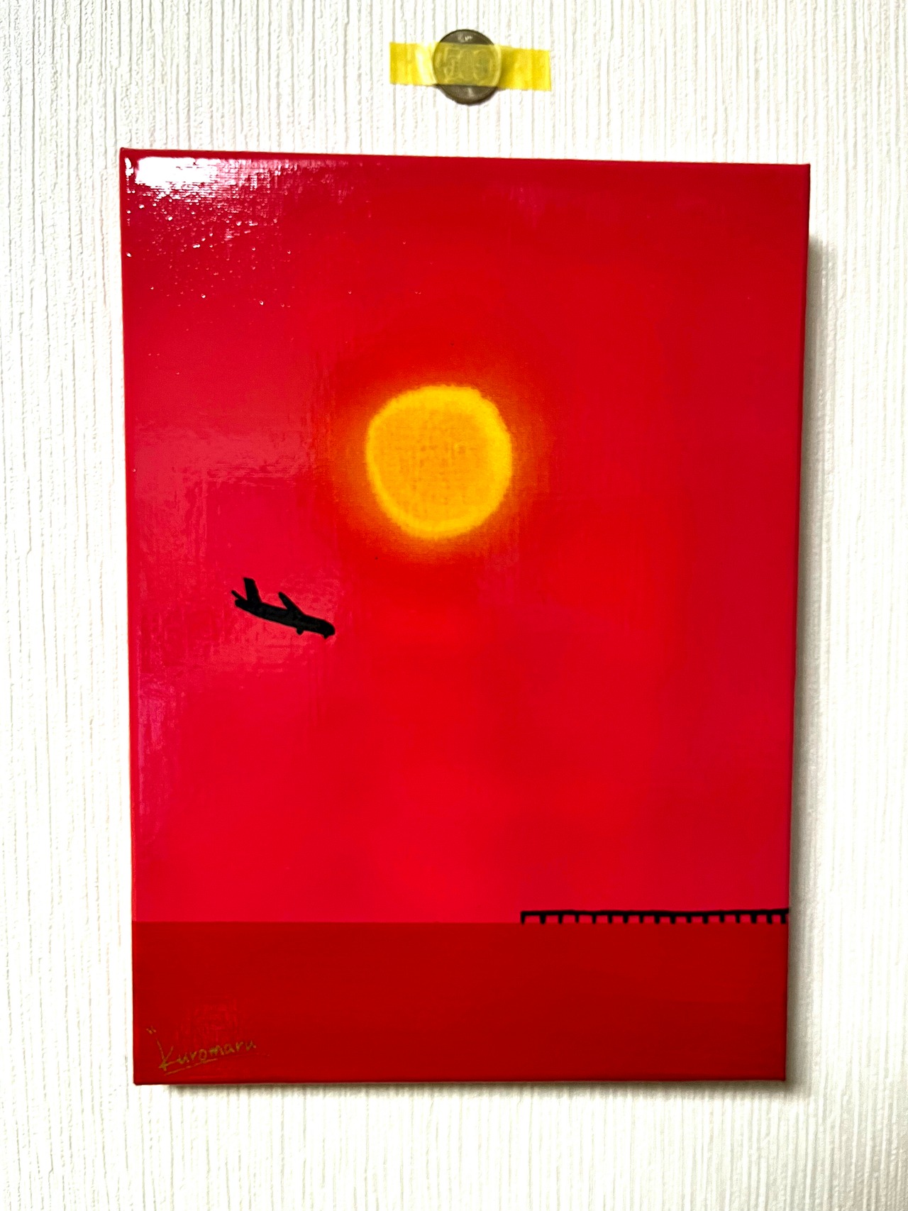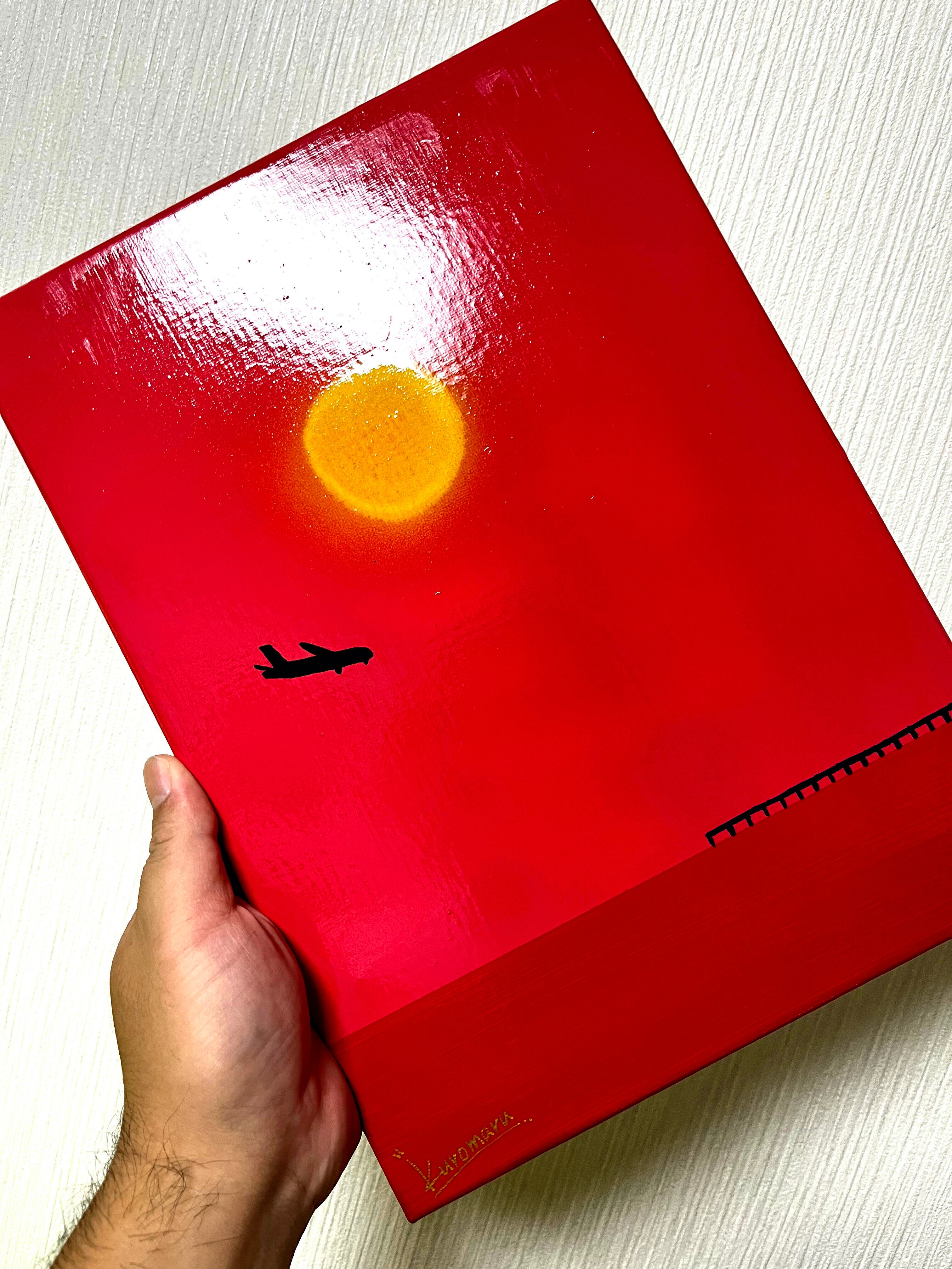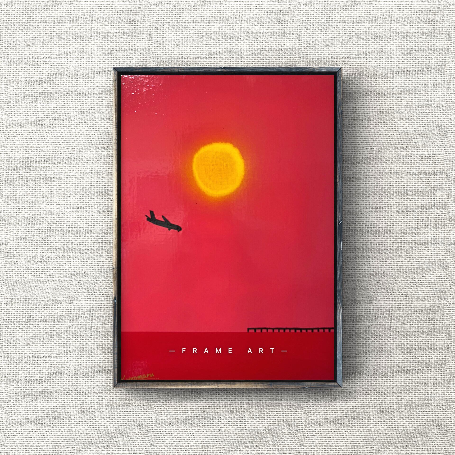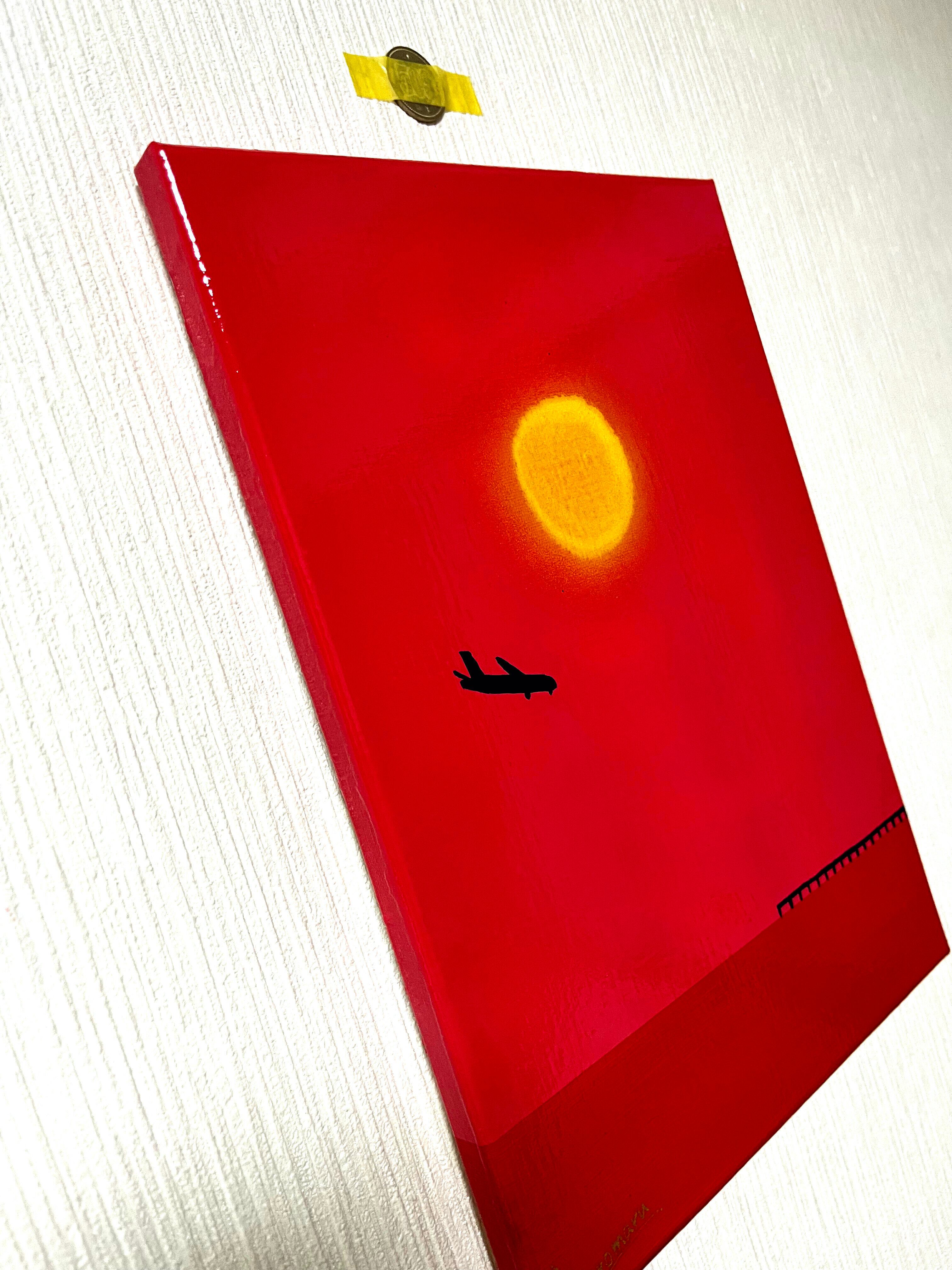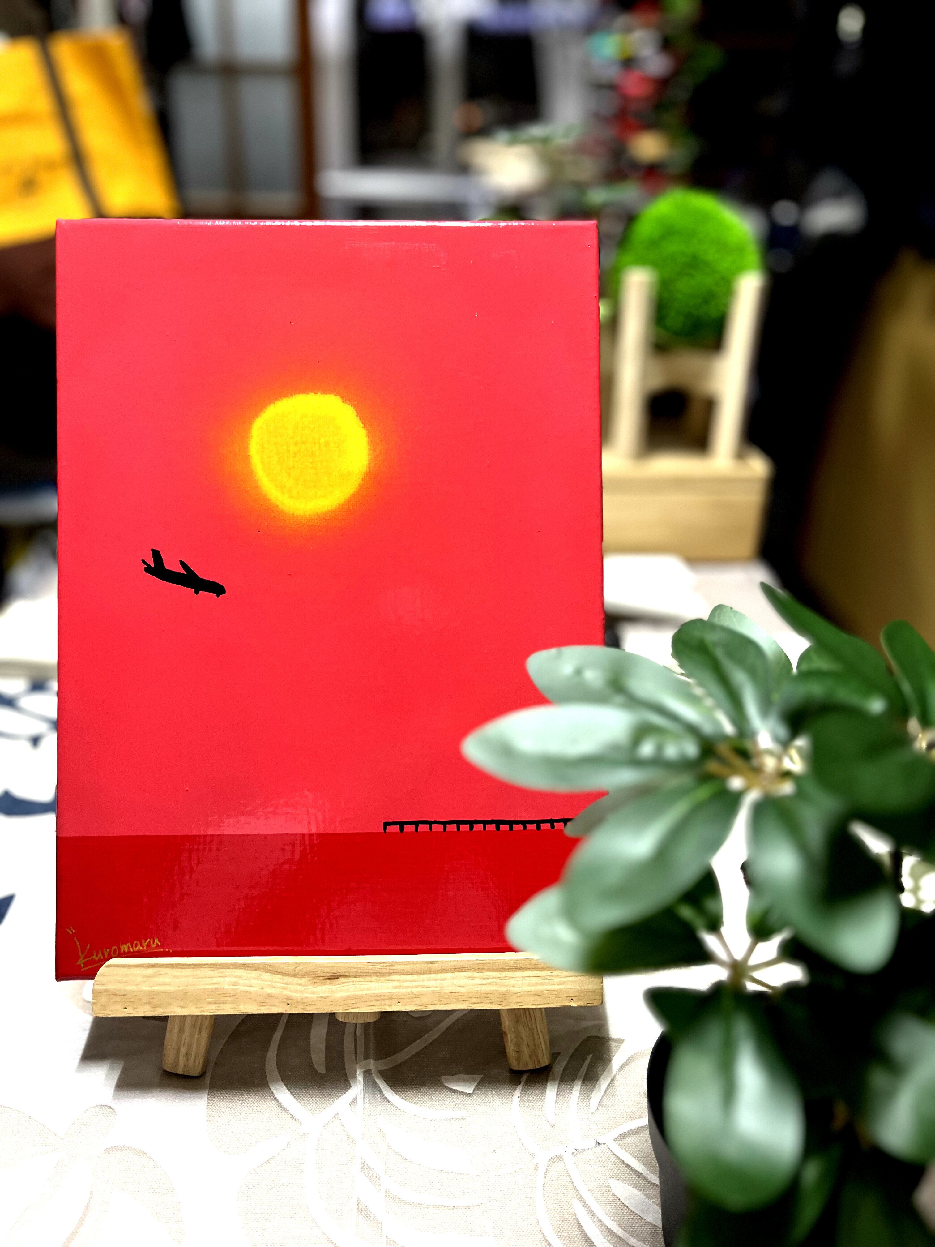 真っ赤に染まる空と黄色に輝く夕日を描きました。瀬長島は那覇市から最も近い車で行ける離島です。那覇空港からも近いので飛行機の離着陸を見る事ができます。四重ニスより更なるメルティ感と、ニスによる絵の具の発色を最大限に引き出しています。あなたのお家にゆっくり寛げる優しい絵画を迎えませんか?