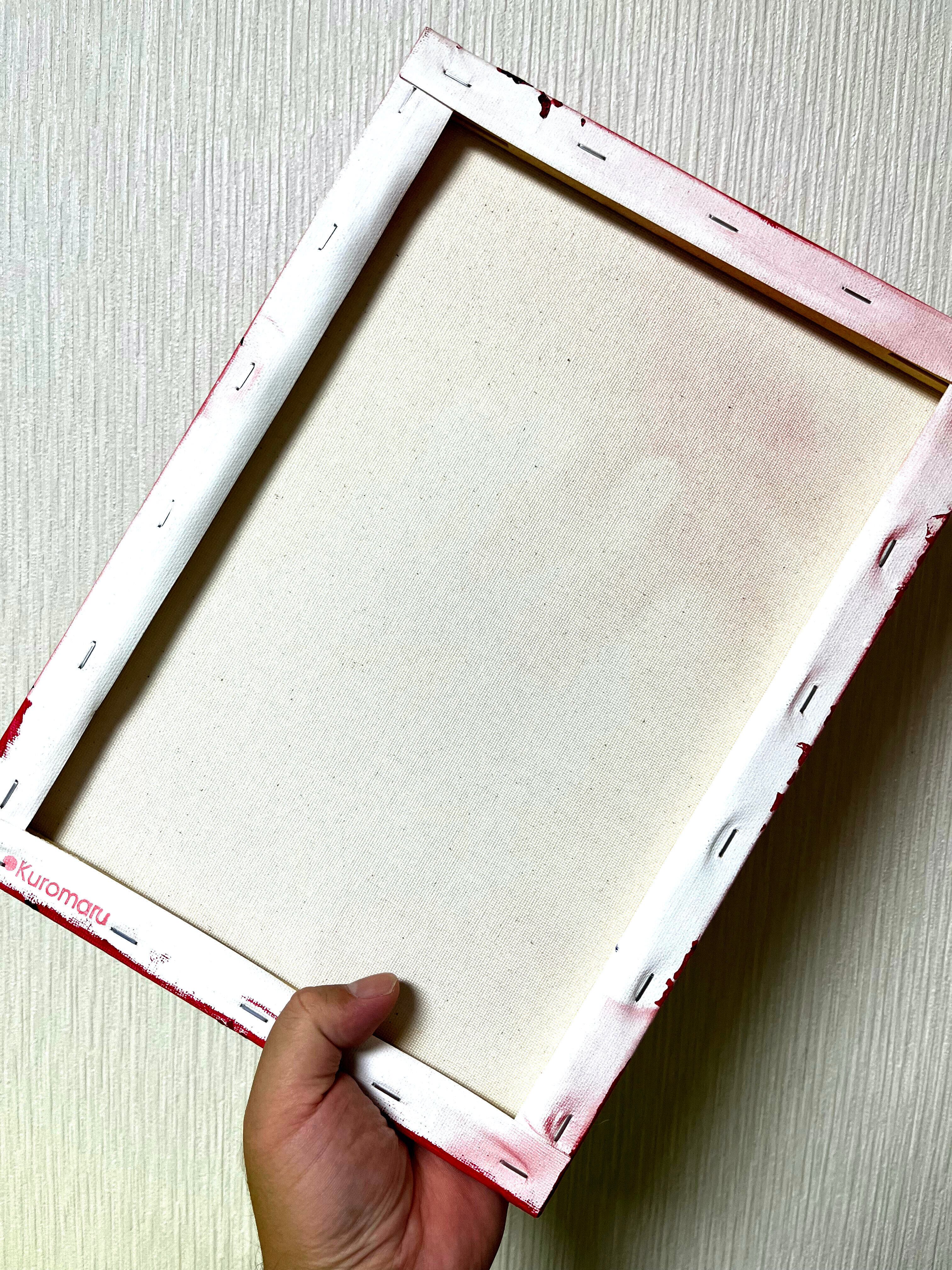 A4よりも一回り大きく、キャンバスですから額なしでもそのまま飾れます。額をつければ迫力は倍増。お好みでお遊びください。