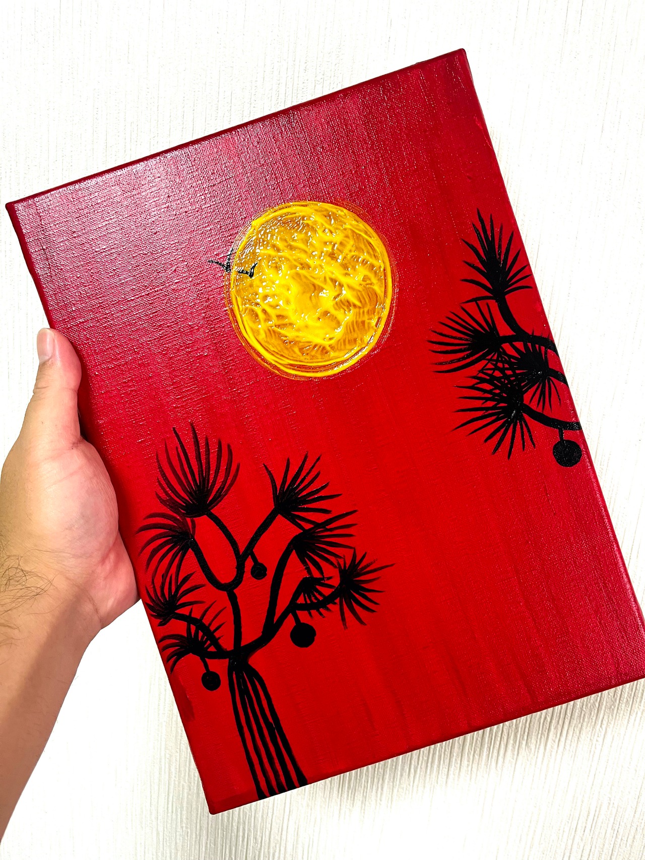 夕日シリーズの油絵作品です。アクリルは水分が飛んで乾燥しますが、その時に絵の具が平らに痩せてしまいます。反面、油絵の具は化学変化で乾燥するので絵の具が痩せません。従って非常に凹凸のある作品を作る事が可能ですが、化学変化に非常に時間がかかり通常では数ヶ月かかります。ですので特殊な薬品を使って化学変化を促したり、結構手間がかかる描き方になります。