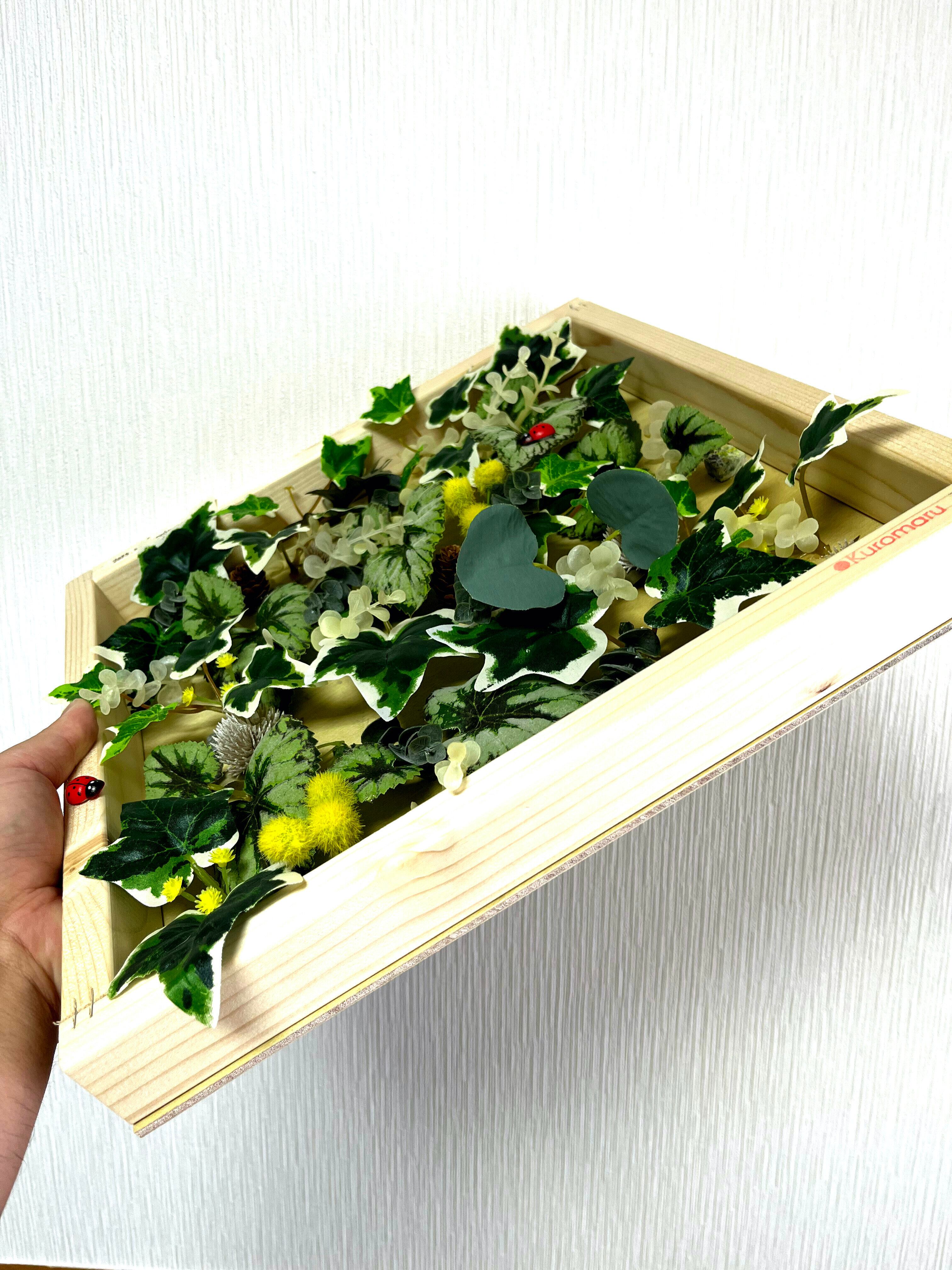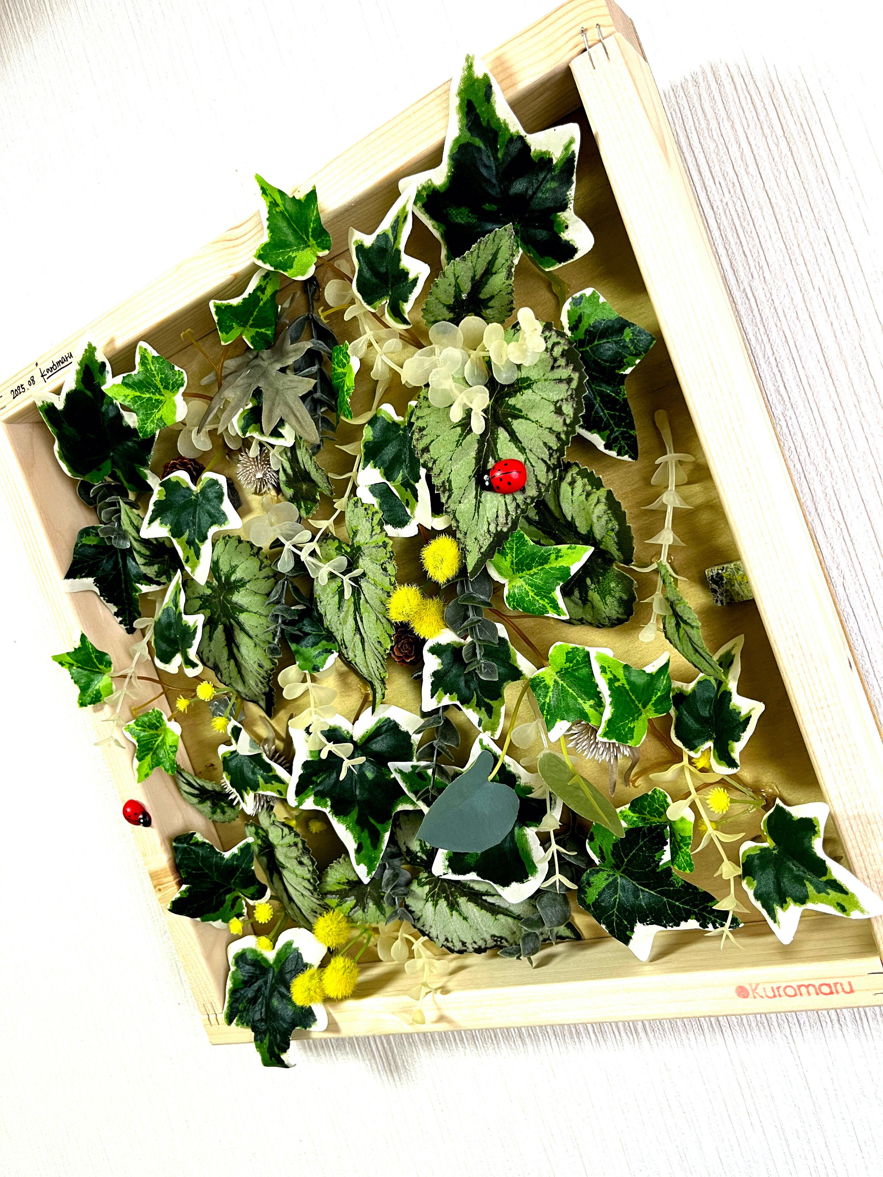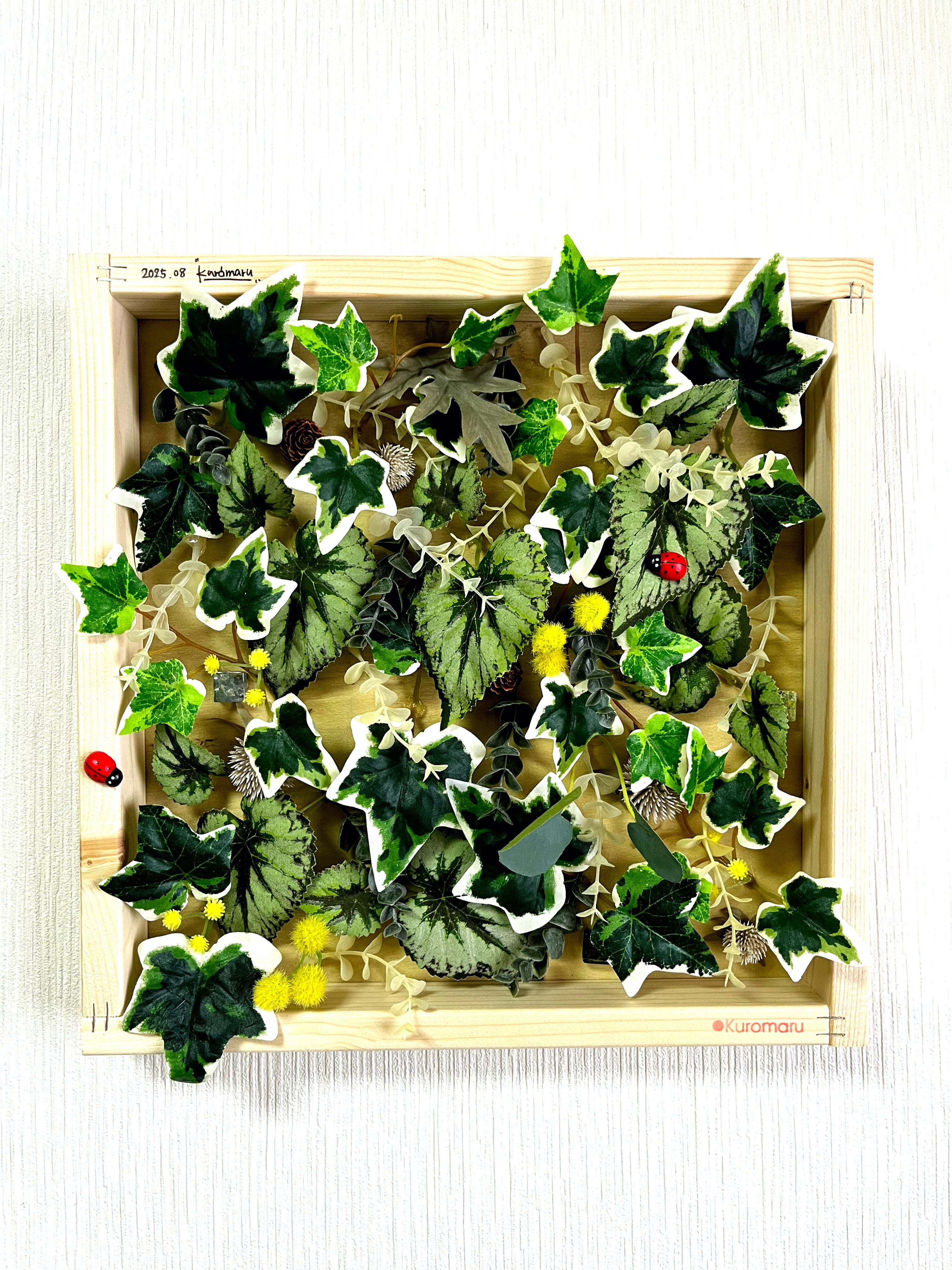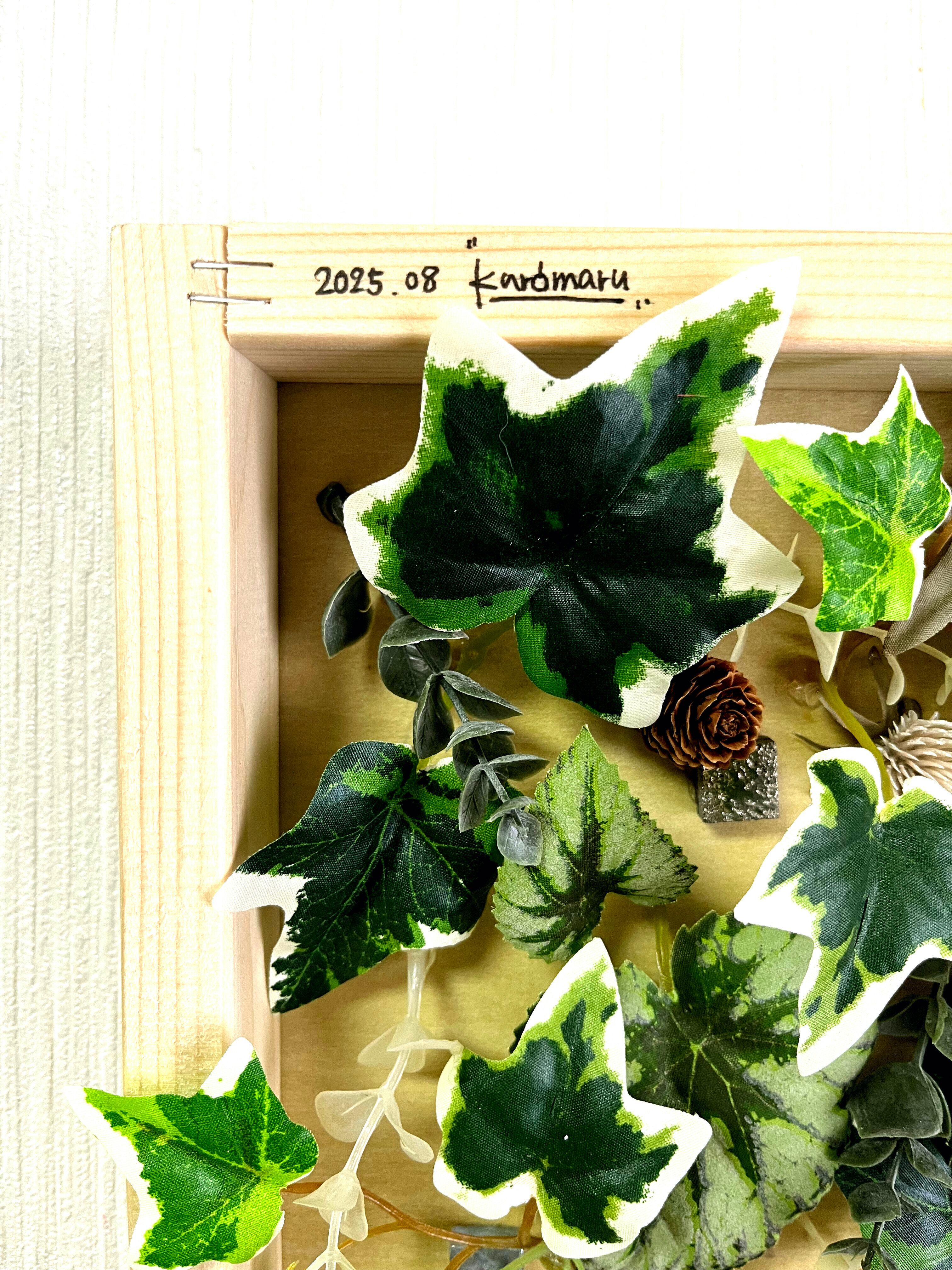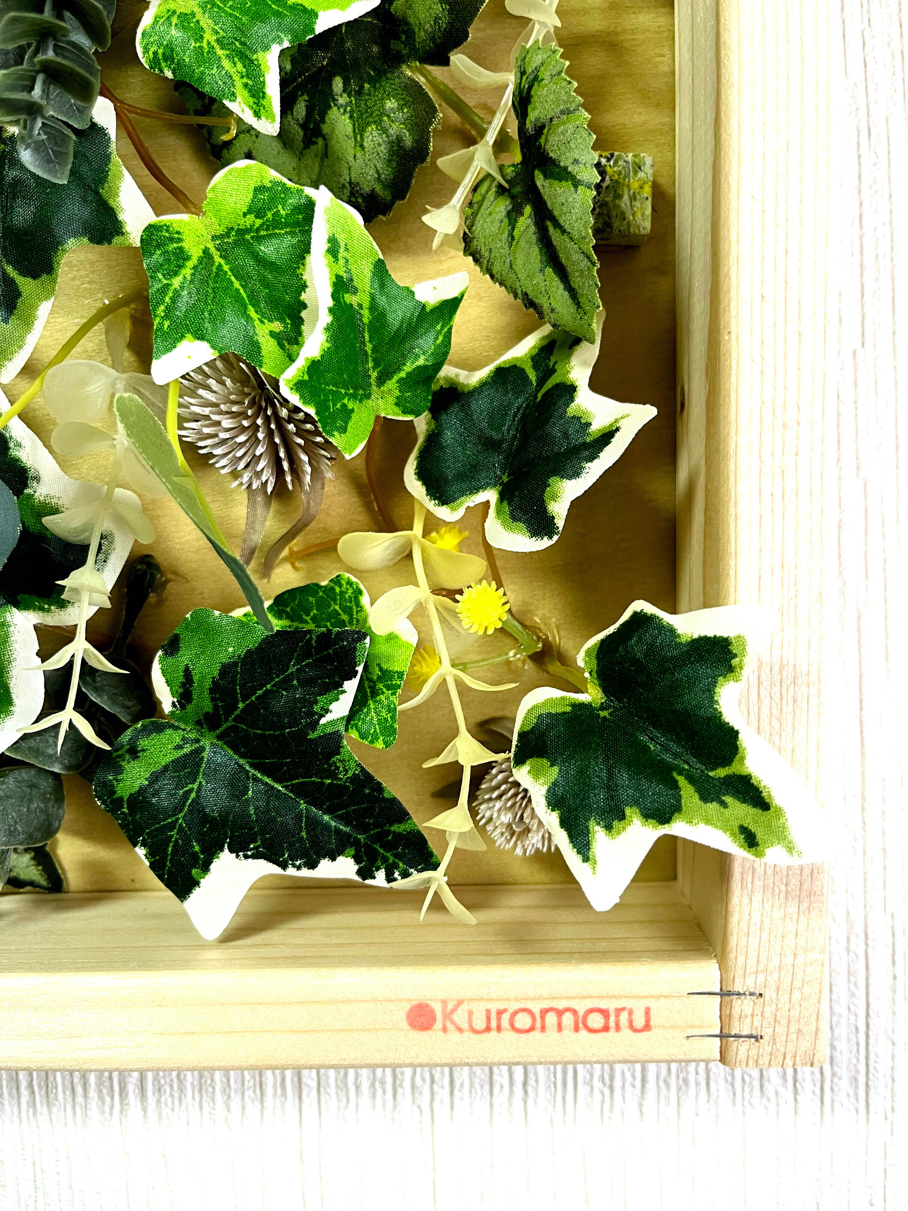 お部屋に緑が欲しいけどお手入れが大変。フェイク植物もいいけど絵画タイプがない。と言うことで開発したのがこちらの商品です。まず支持体の額にはくろまるがオリジナルで手掛けたホワイトウッドの額縁です。ベニア板面に絵画専用の強力接着剤で各種パーツを生けました。お部屋に飾ることにより一気にグリーン感を演出する事ができます。設置した植物は白を基調としたもので統一しております。是非ご利用ください。