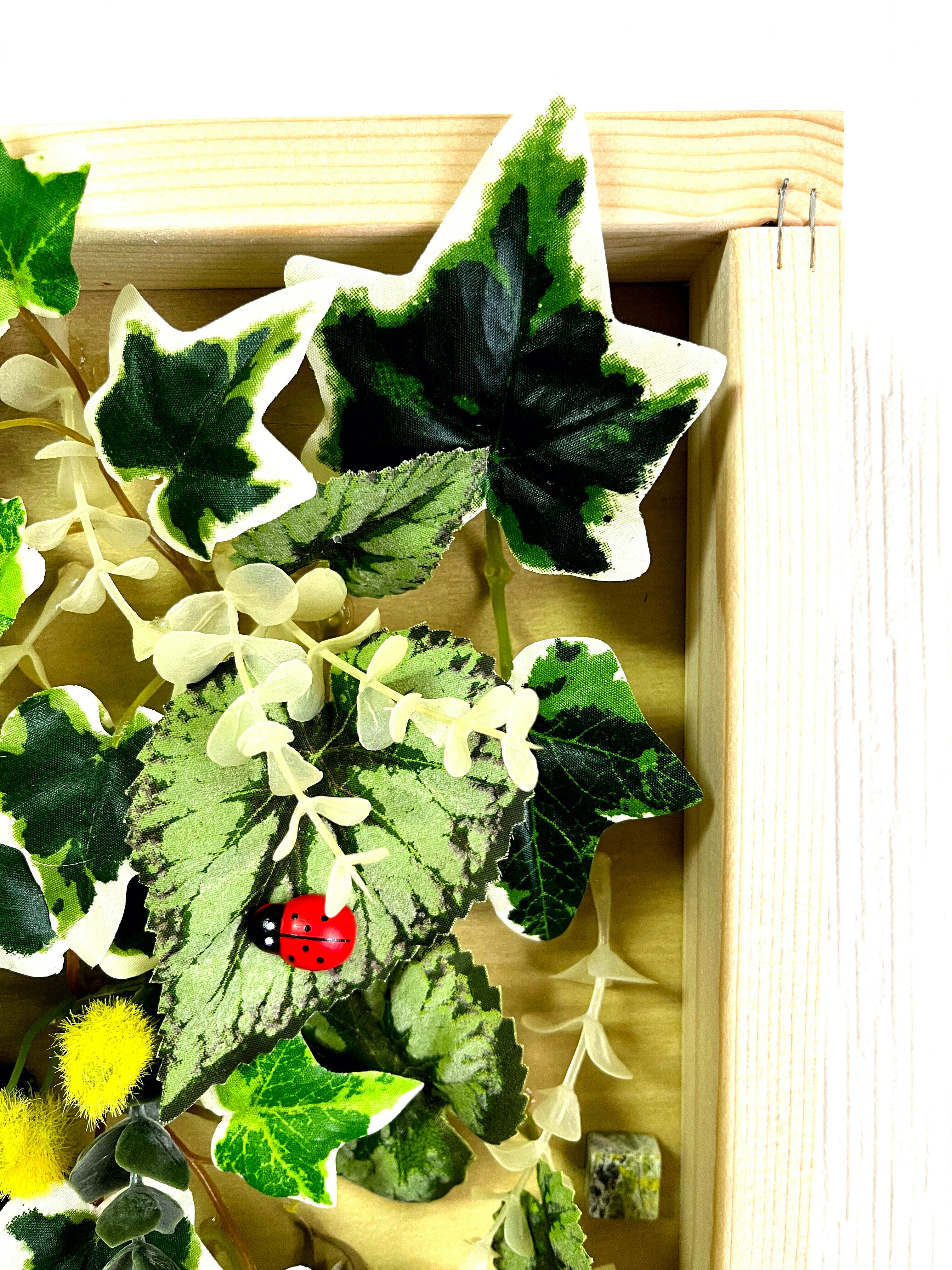 絵の具:フェイク植物、てんとう虫の玩具、松ぼっくり、ストーン