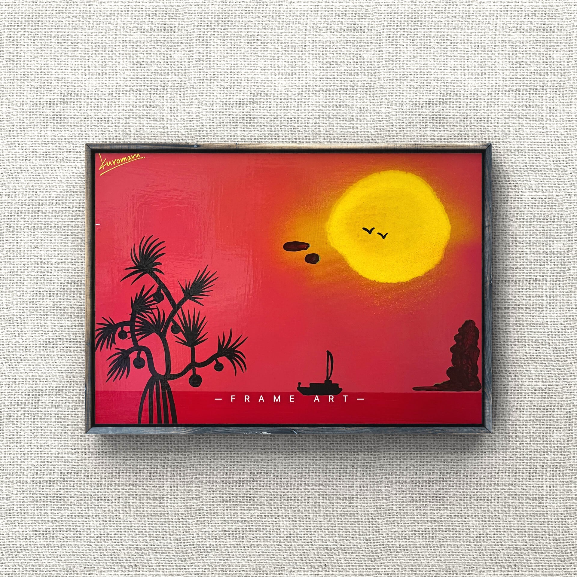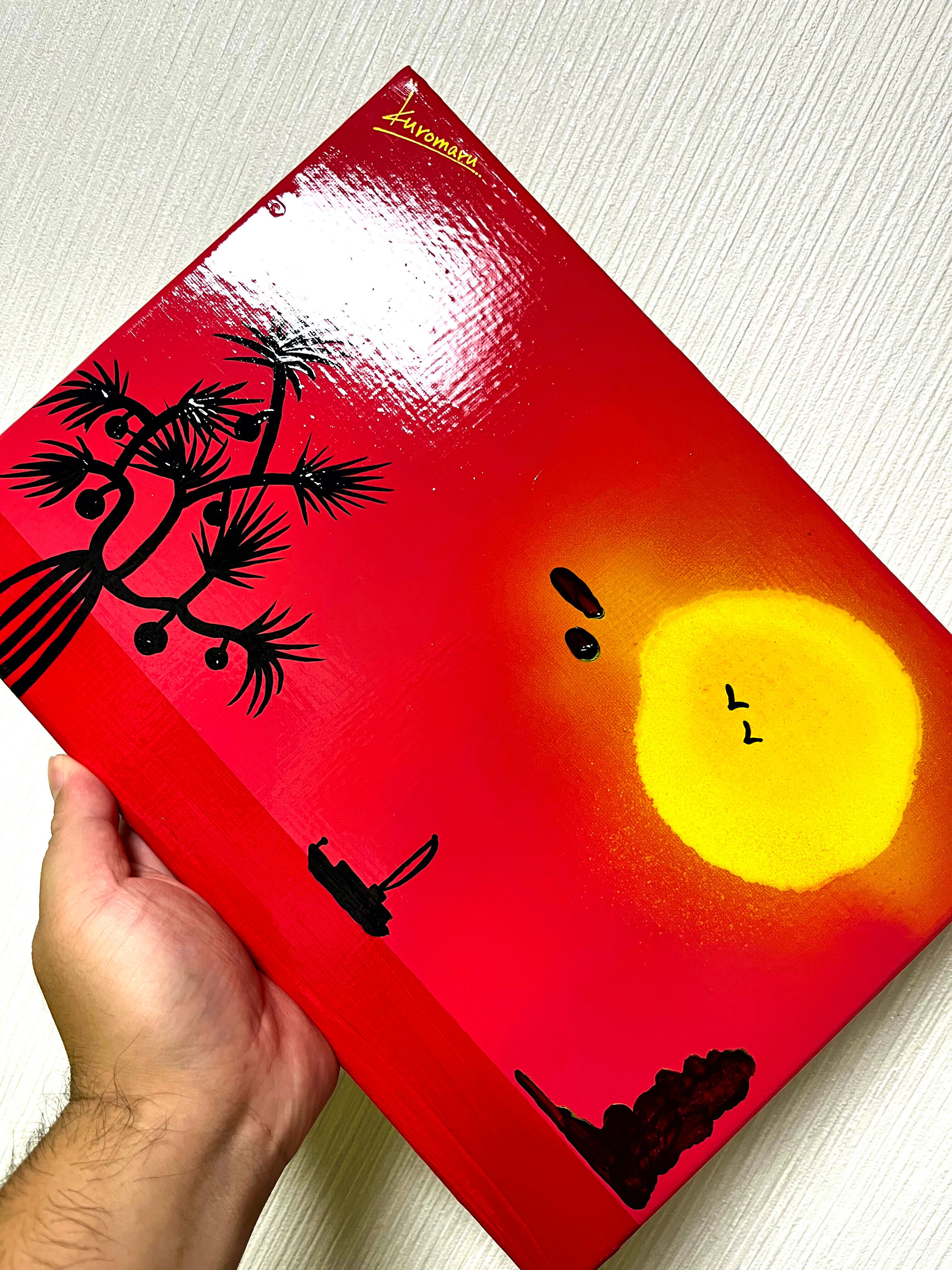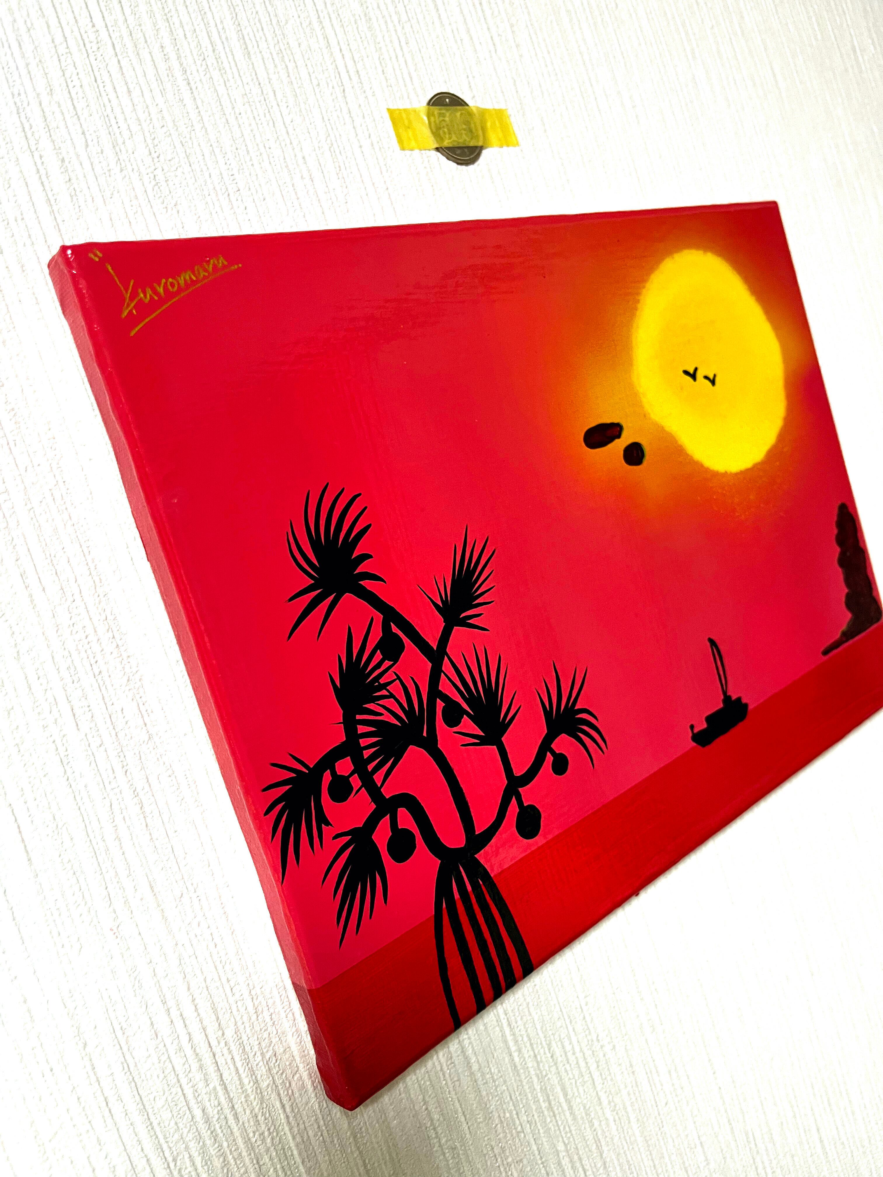 真っ赤に染まる空と黄色に輝く夕日を描きました。宮城島にある知る人でしか行けない満点のビーチ。あなたはここが探せますか?四重ニスより更なるメルティ感と、ニスによる絵の具の発色を最大限に引き出しています。あなたのお家にゆっくり寛げる優しい絵画を迎えませんか?