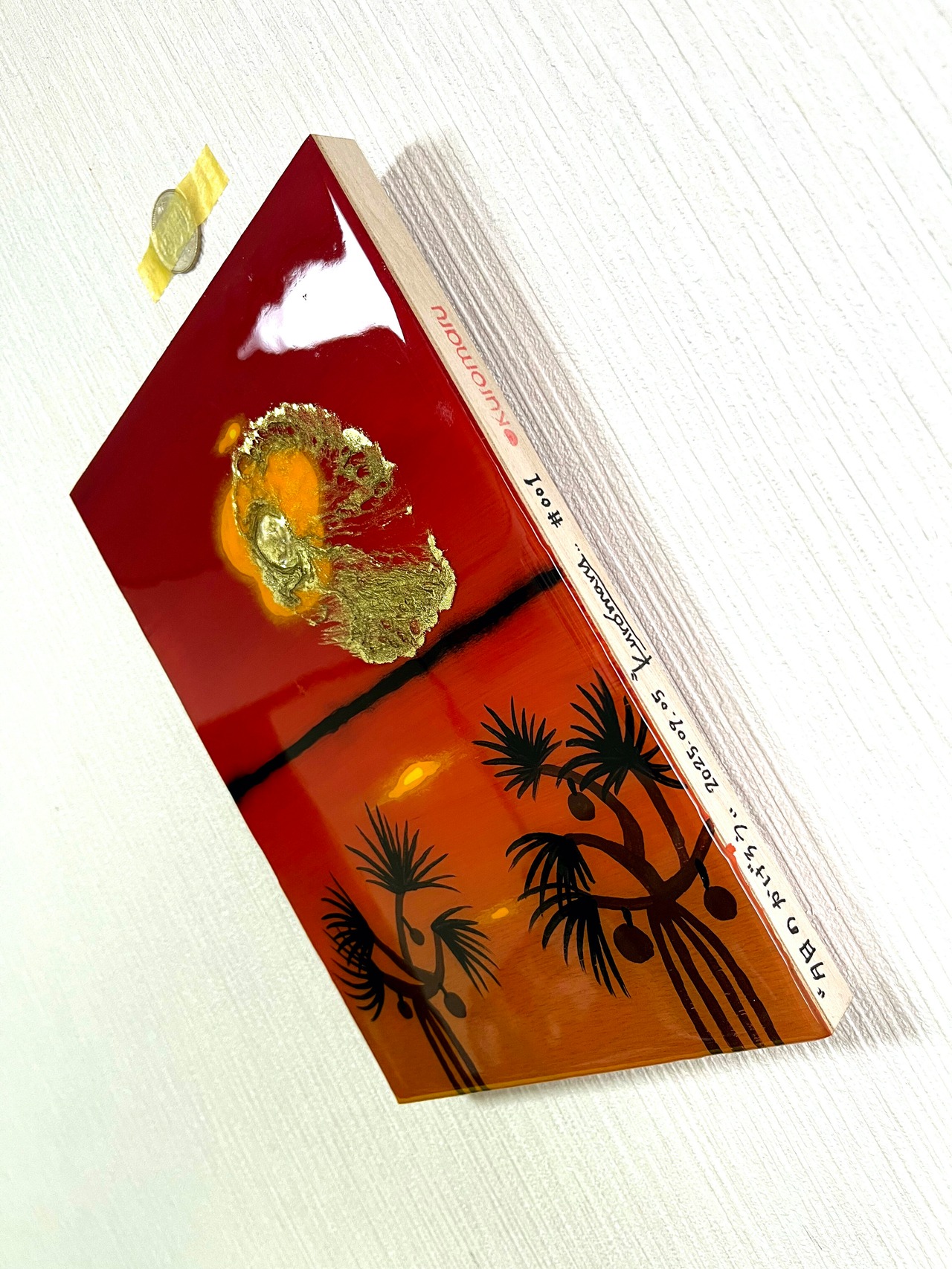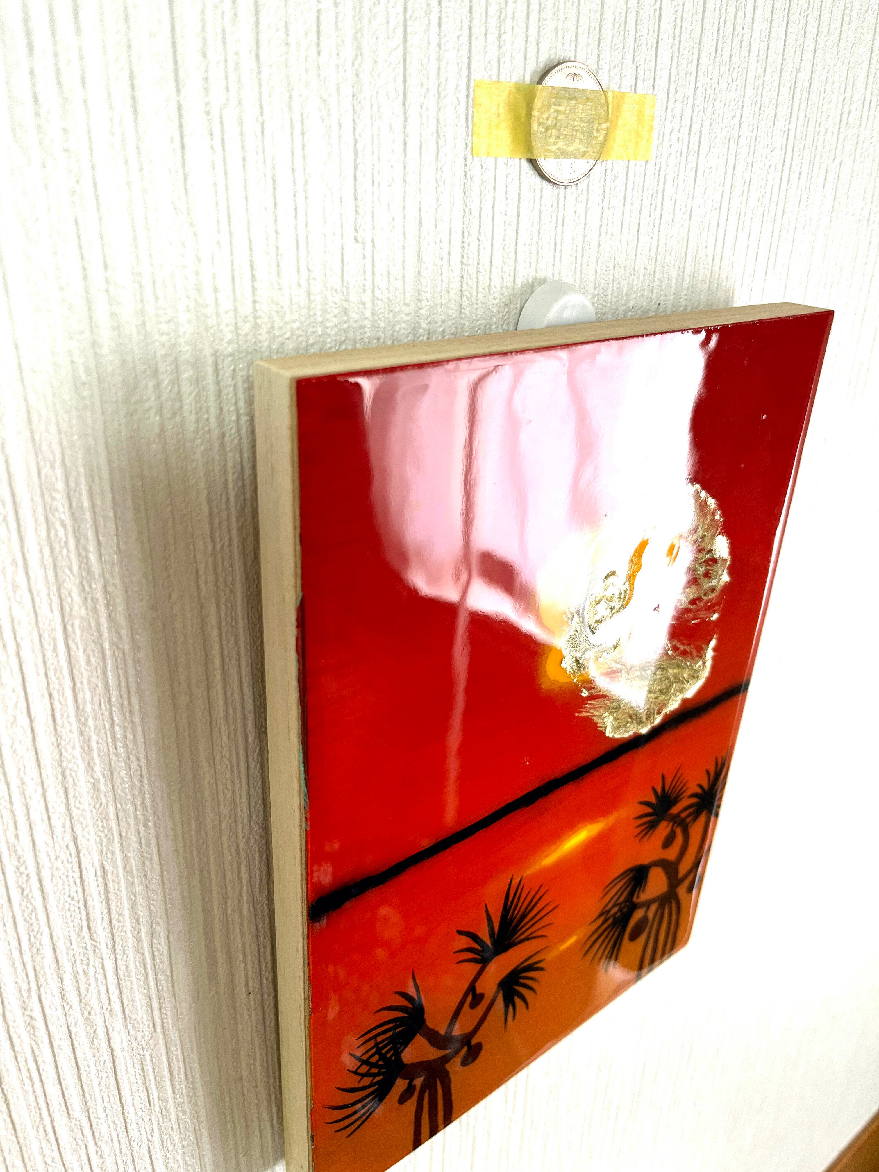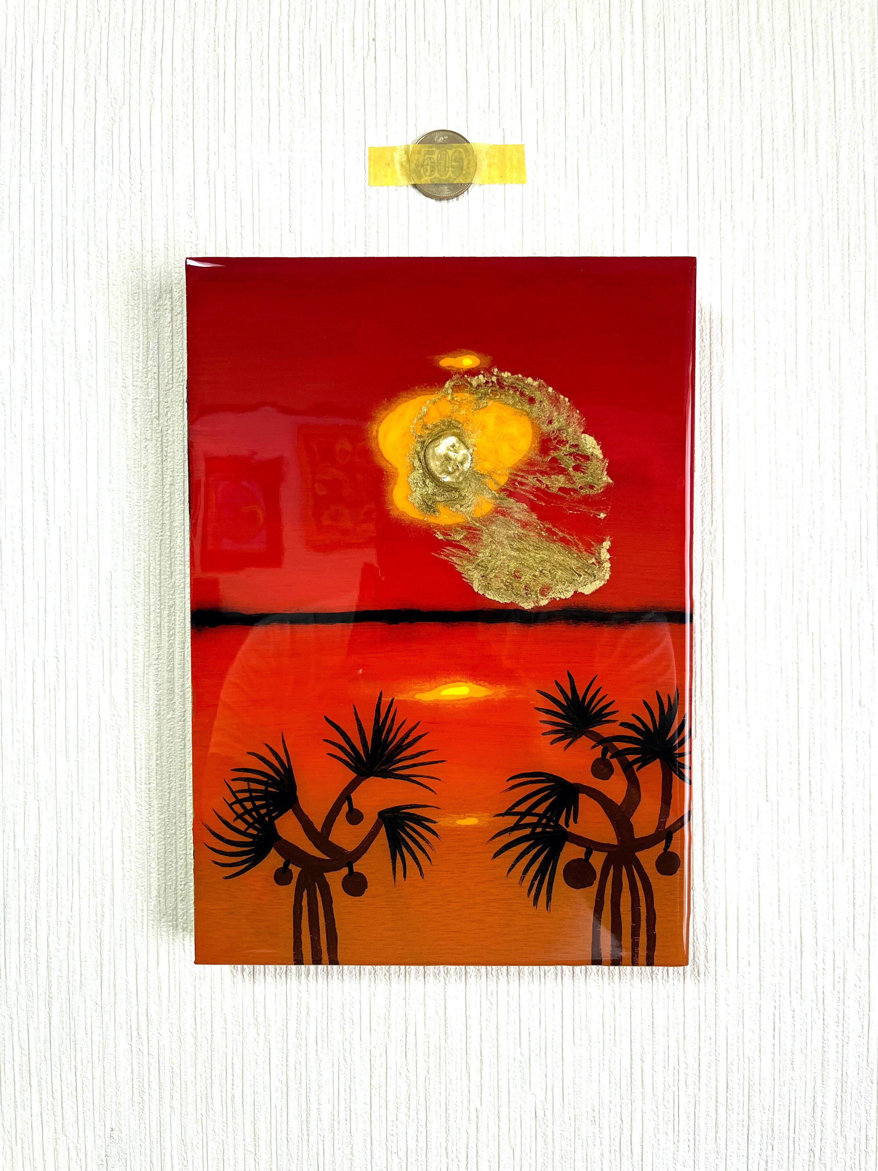 うるま市の海中道路から宮城島方面に沈む夕日をイメージして描きました。夕日の陽炎は金の顔料インクを使用してレジンらしく溶かして拡散しています。