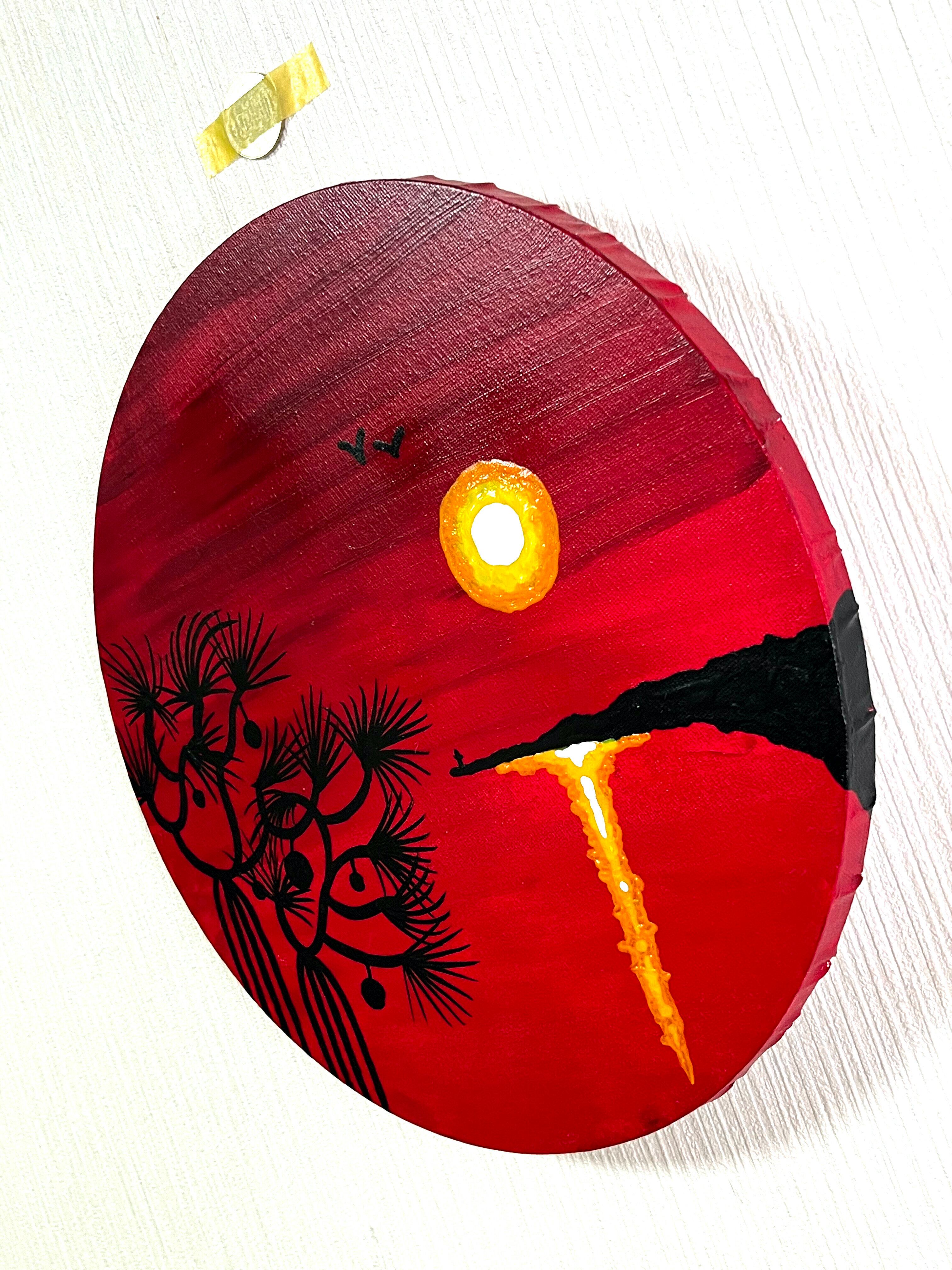 お客様のご要望で「アダンの夕日」を丸キャンバス(オーバル)で描くことになりました。絵の具は贅沢に油絵の具を使用。夕日の深みを油絵で表現する事が出来ました。