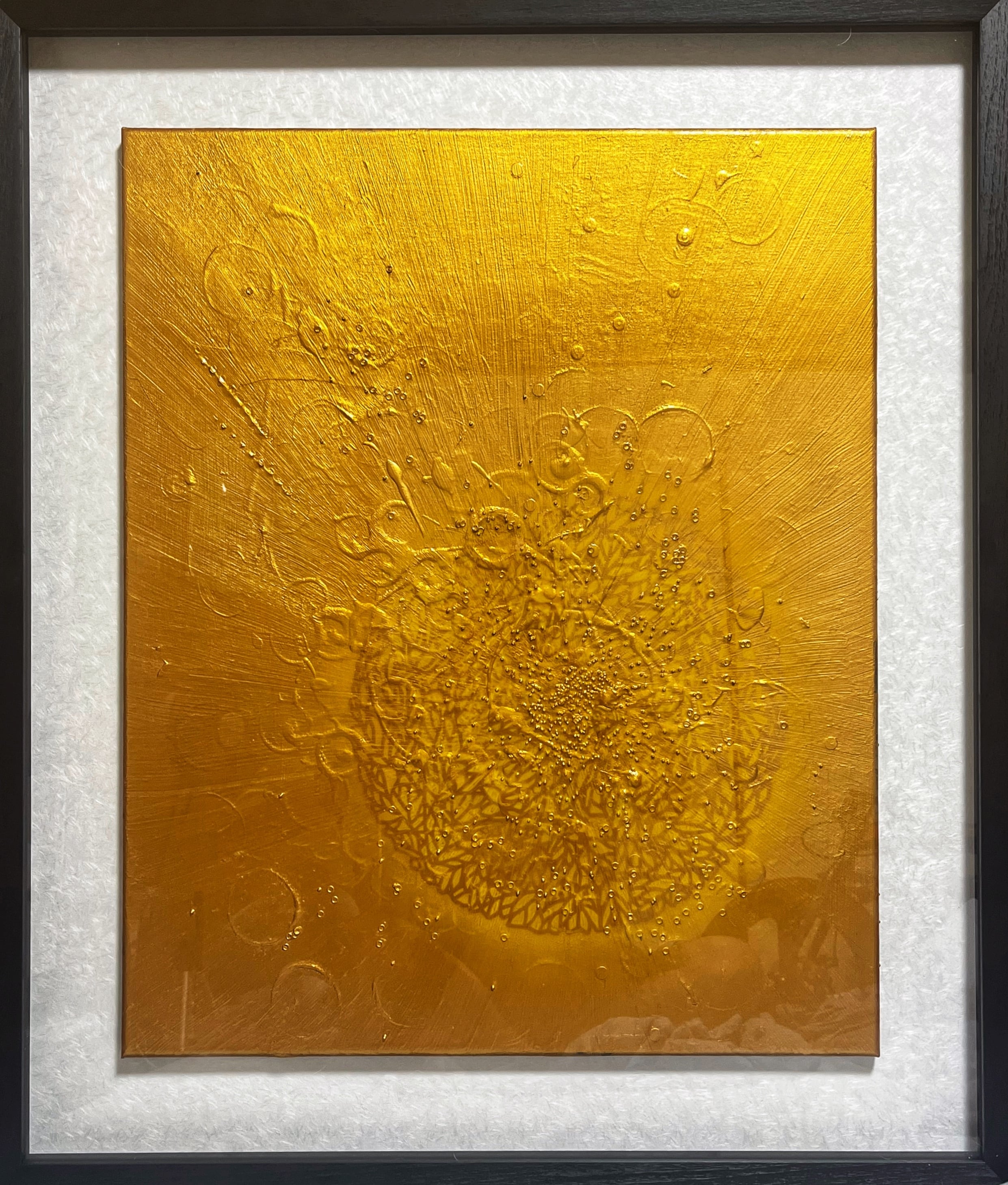 私は太陽に魅せられている事がわかりました。過去の自身の作品を見ていると、ほぼ太陽が登場します。今回は太陽そのものを黄金ジェッソのみで描きました。大量の黄金ジェッソを使う事で凹凸ができ陰影を表現しつつ、ビーズとマルカンでさらに細かい表現をしています。ぜひこのエネルギーを感じてください。